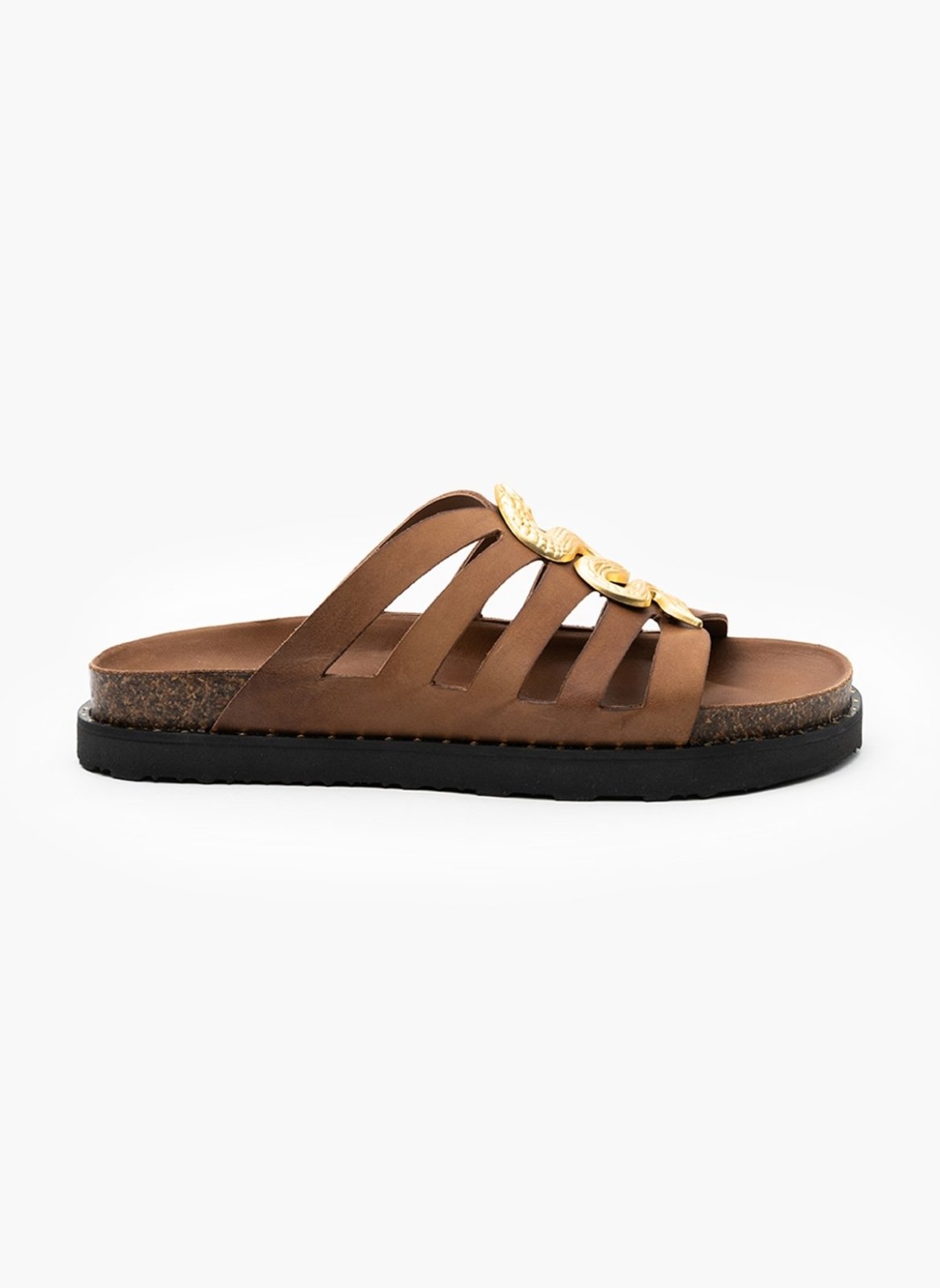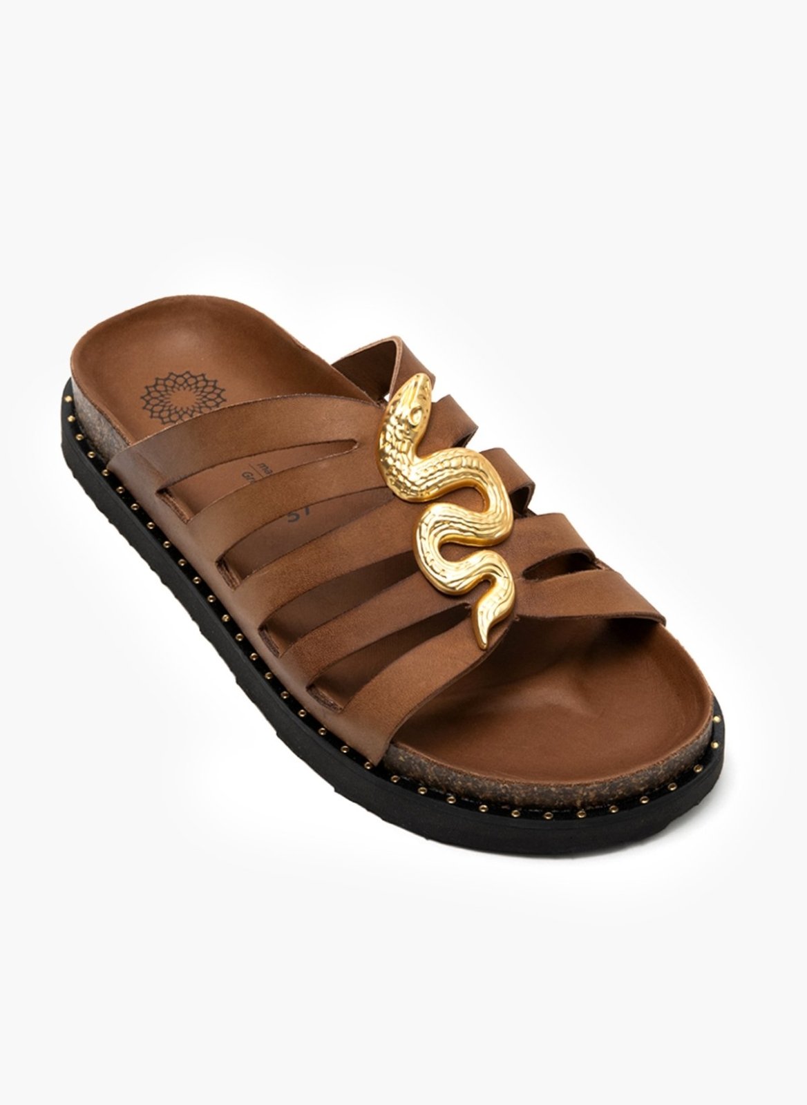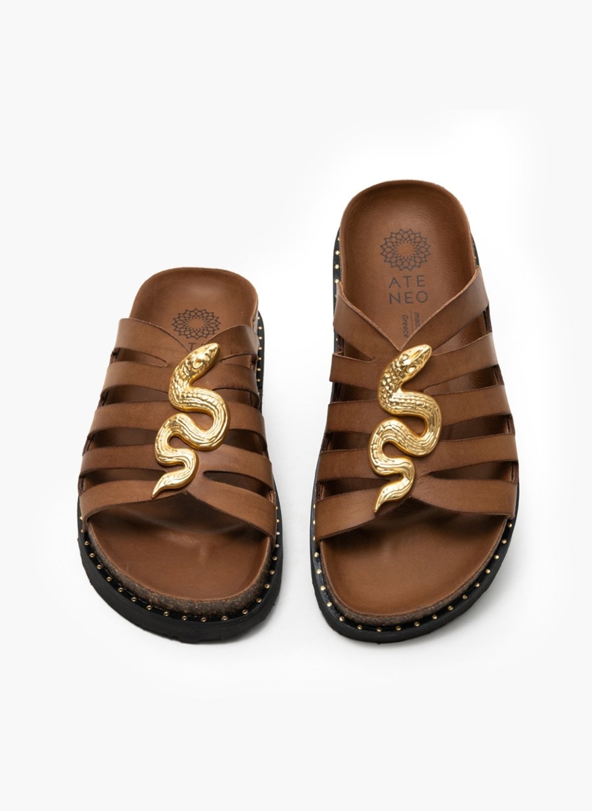 Σανδάλια δερμάτινα με ανατομικό σχήμα στον πάτο. έχει χωστή φάσα με ανοίγματα. Μεταλλικό ανάγλυφο φίδι. Φελλός περιμετρικά της σόλας. Ελληνικής κατασκευής.