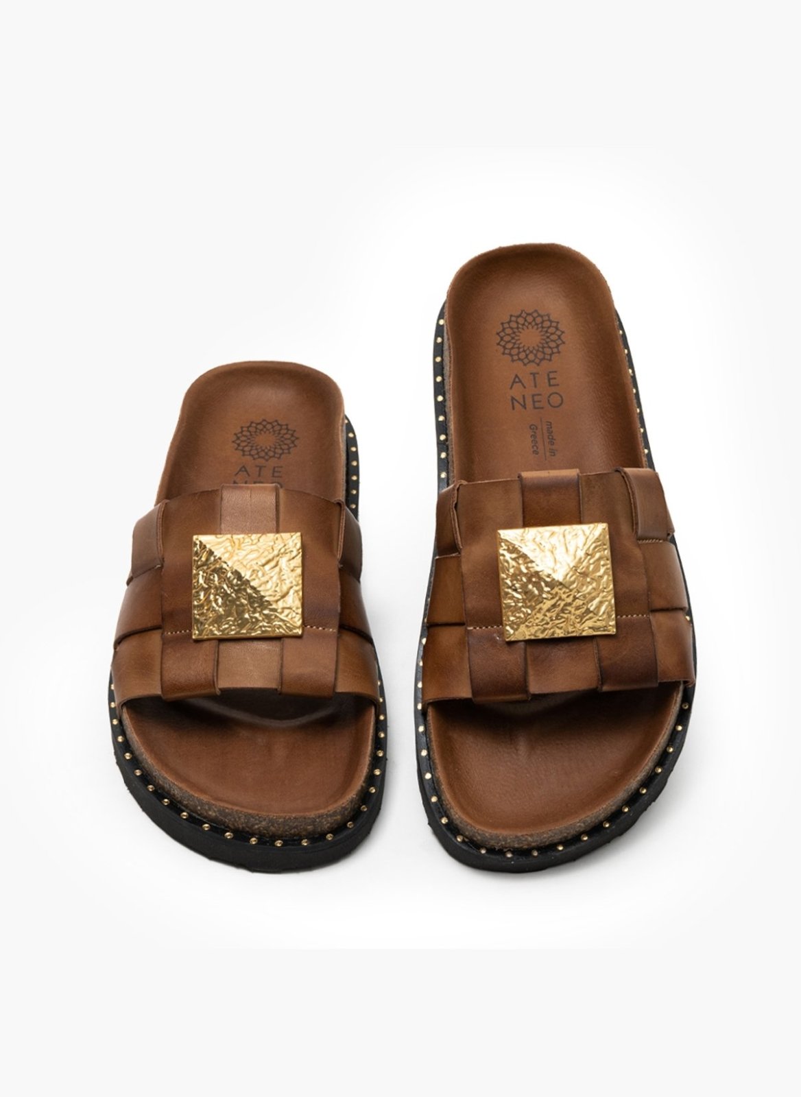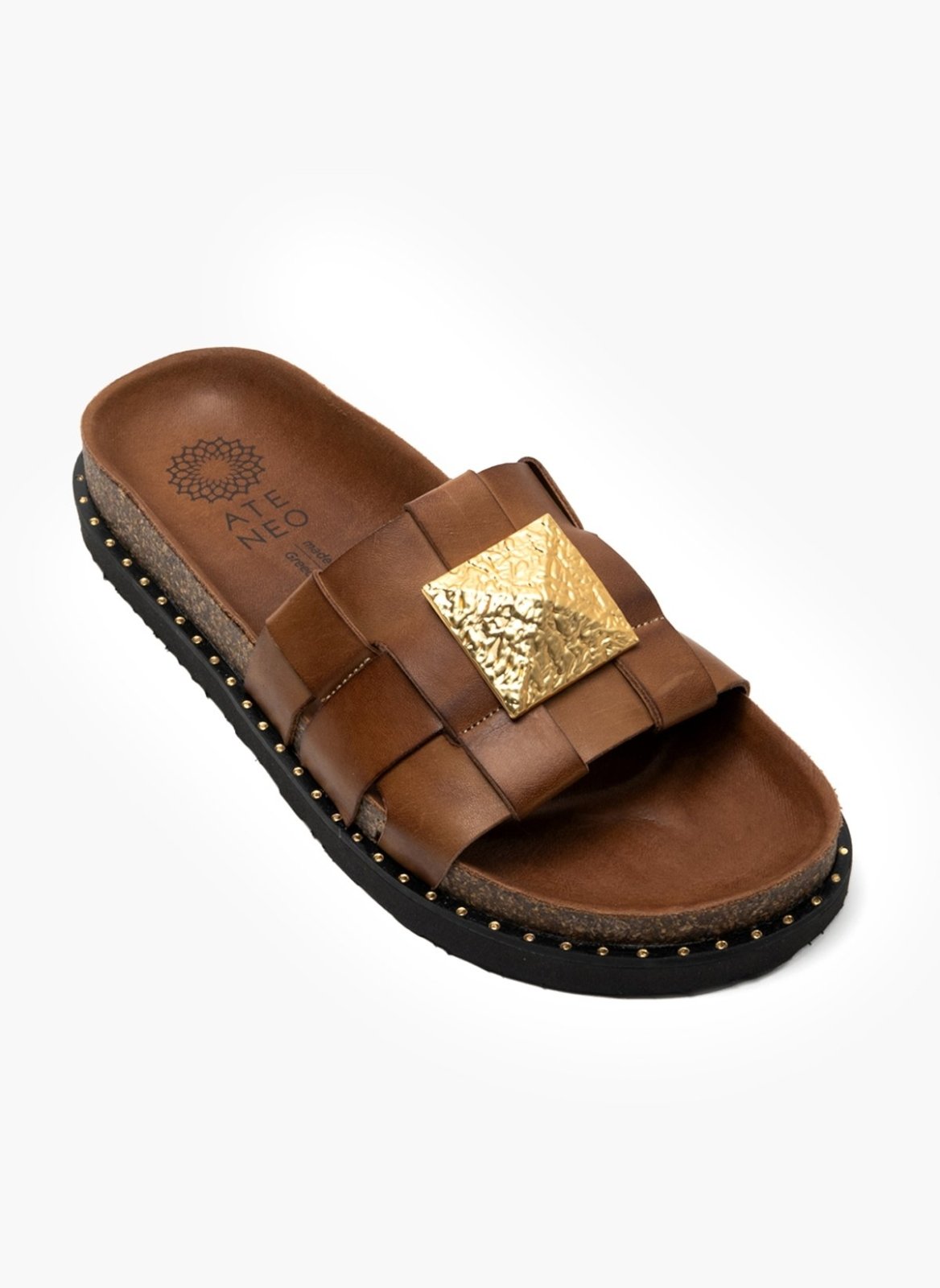 Σανδάλια δερμάτινα με περαστά λουράκια ATENEO. Μεγάλο μεταλλικό ανάγλυφο τρουκ στη φάσα. Ανατομικό σχήμα στον πάτο. Φελλός περιμετρικά της σόλας. Ελληνικής κατασκευής.