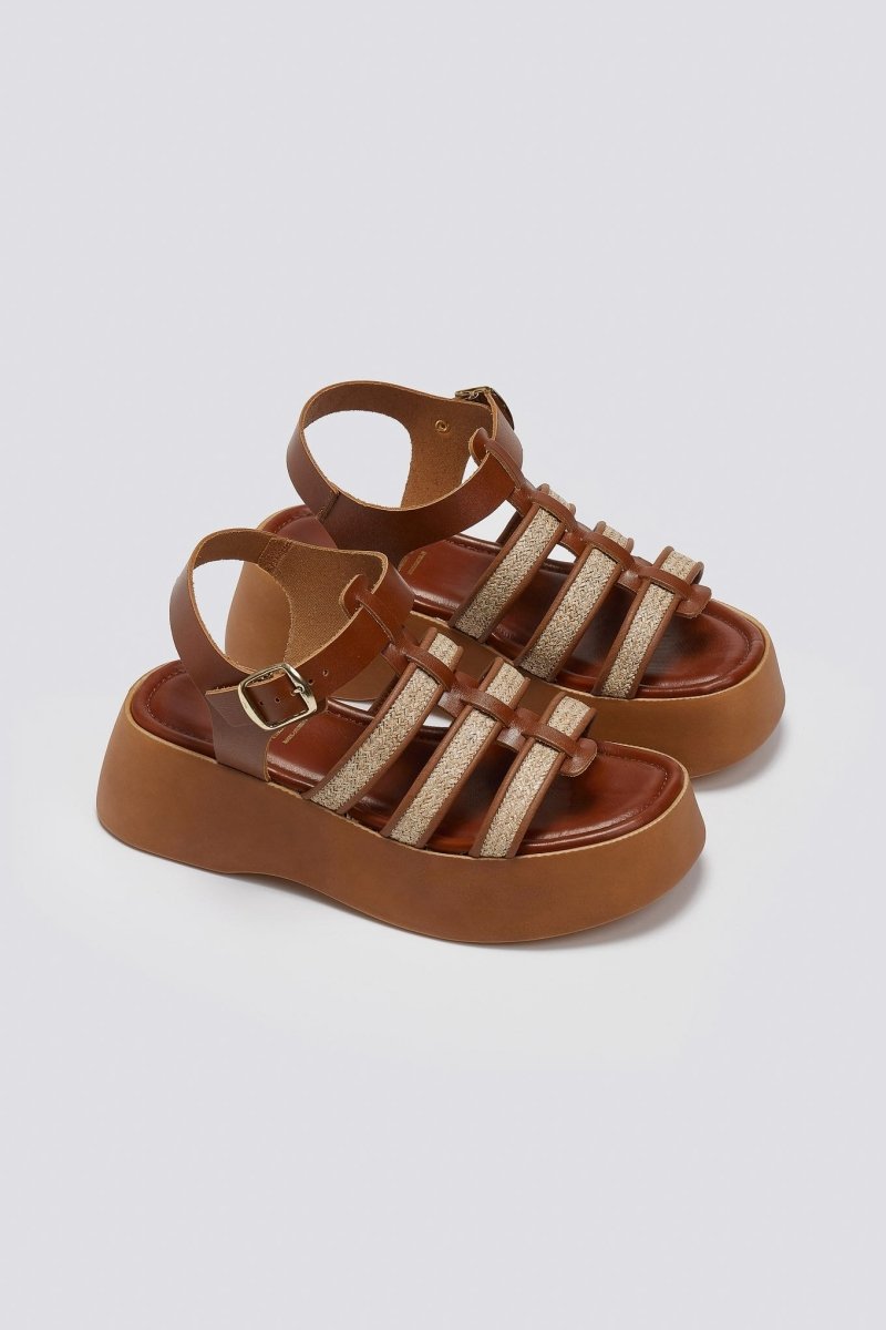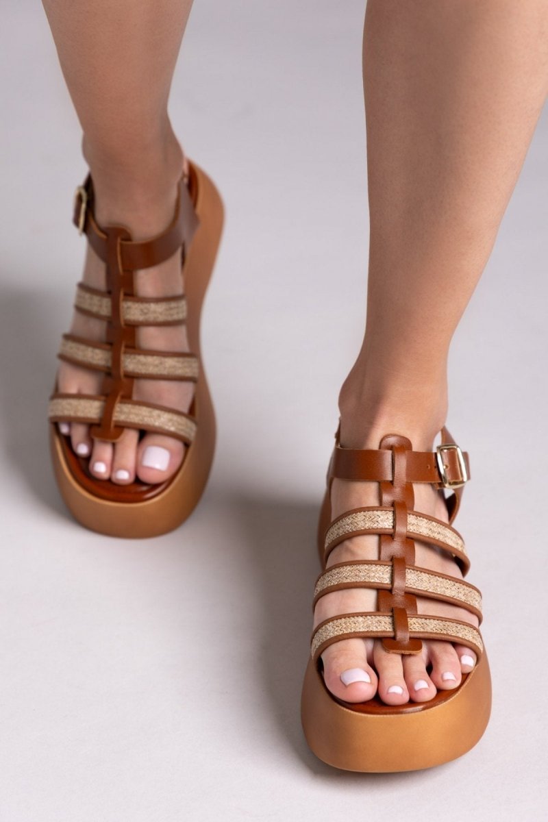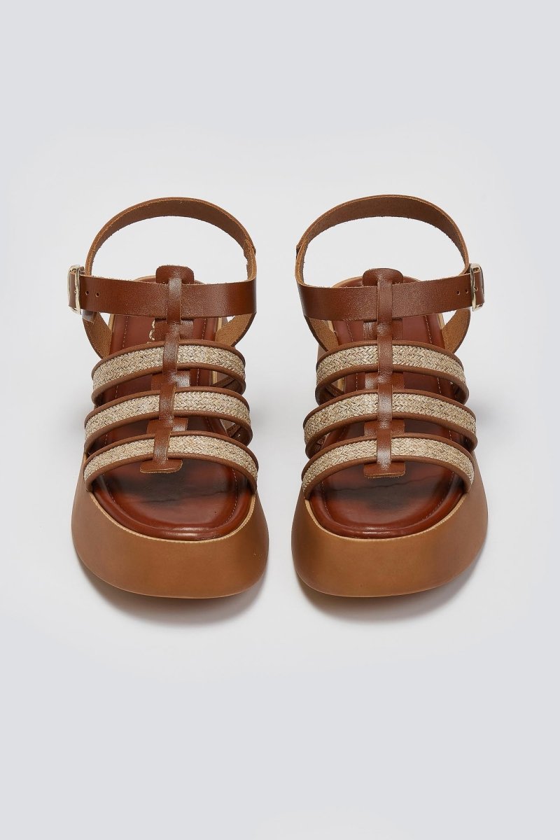 Σανδάλια flatforms gladiator από γνήσιο δέρμα Estil. Λεπτομέρεια ψάθα στα λουράκια. Μαλακός πάτος με ενίσχυση. Δένουν με τοκά στο πλάι. Ελαφριά σόλα. Ελληνικής κατασκευής.