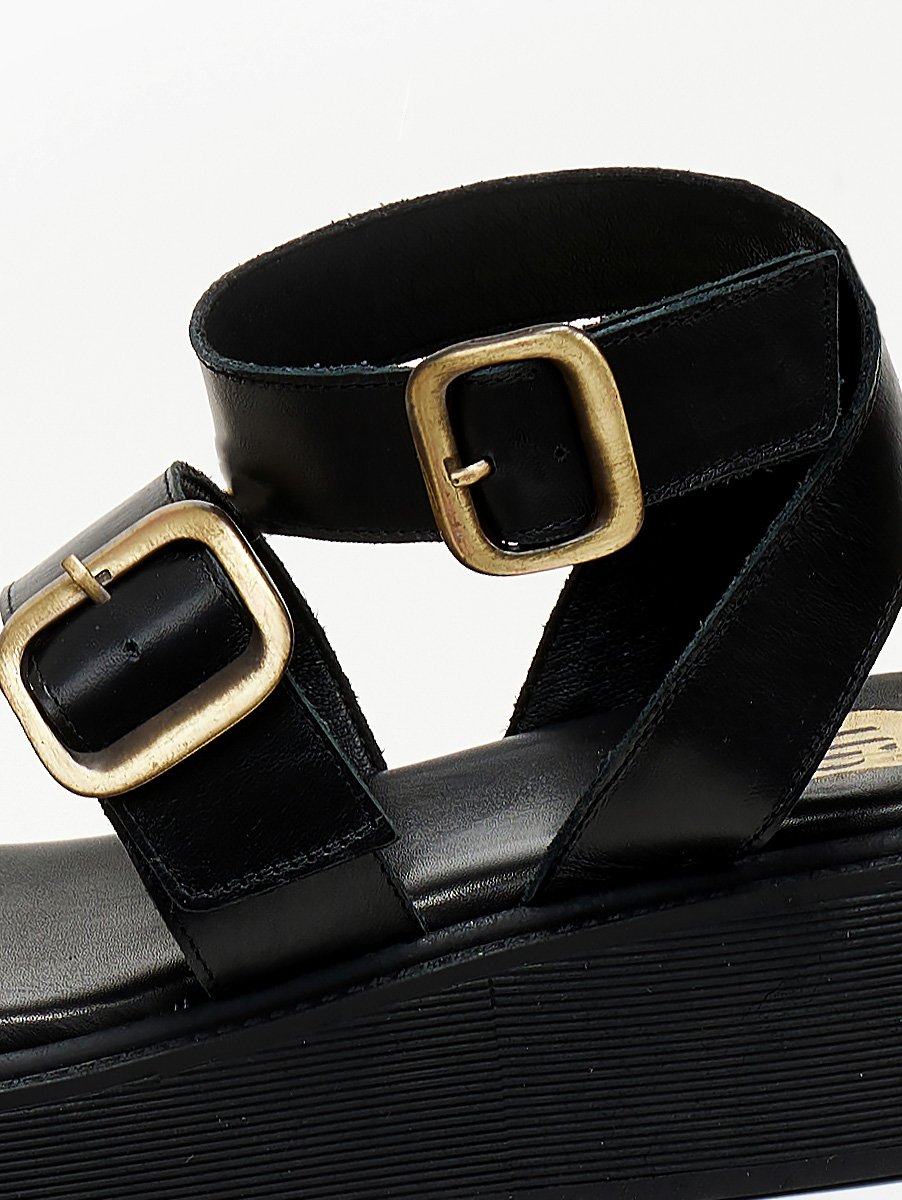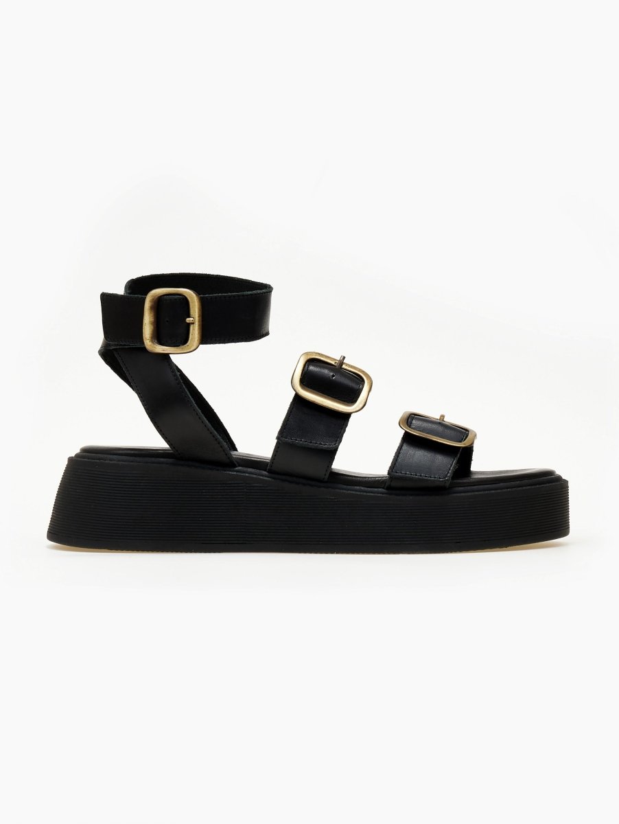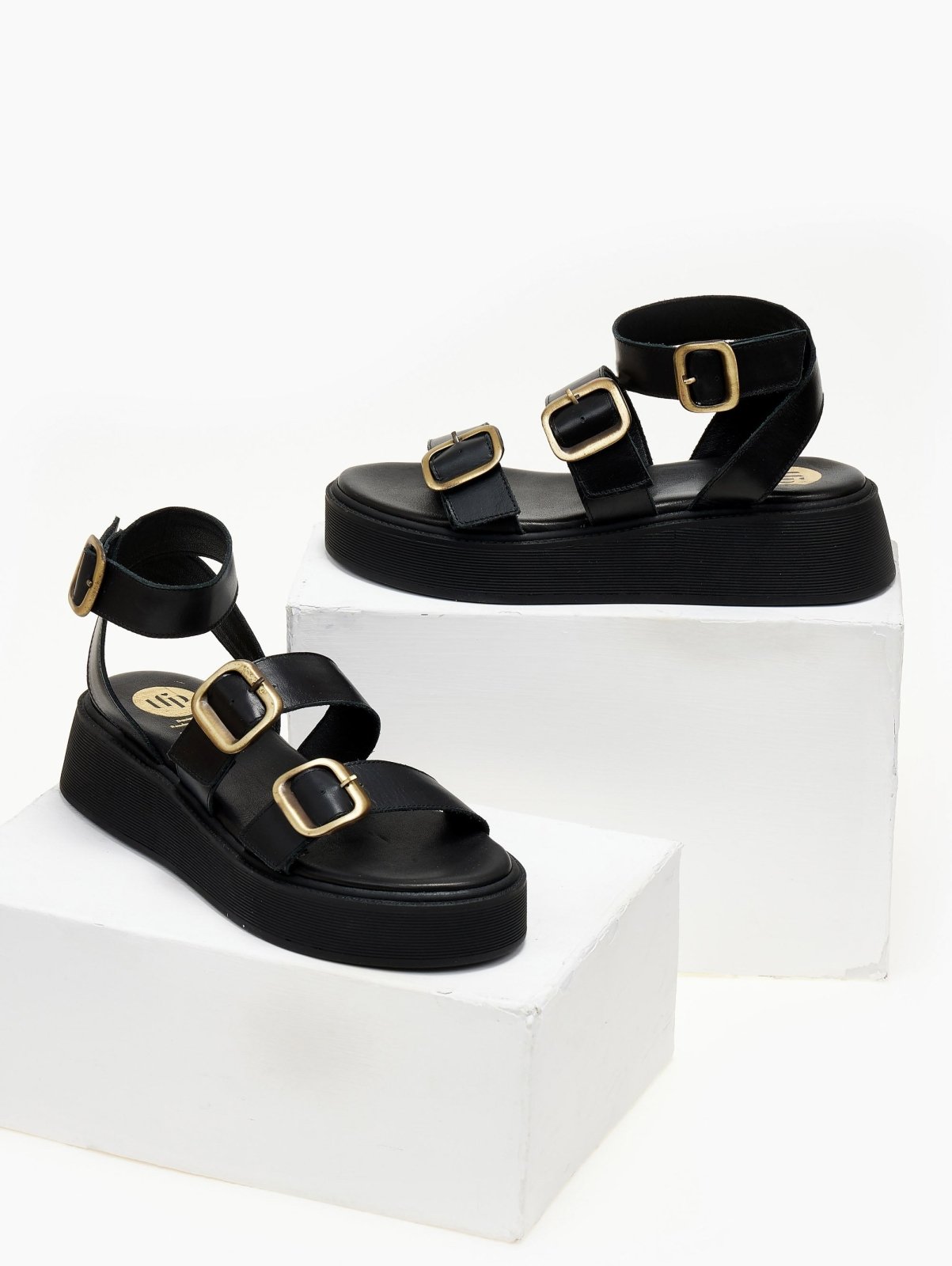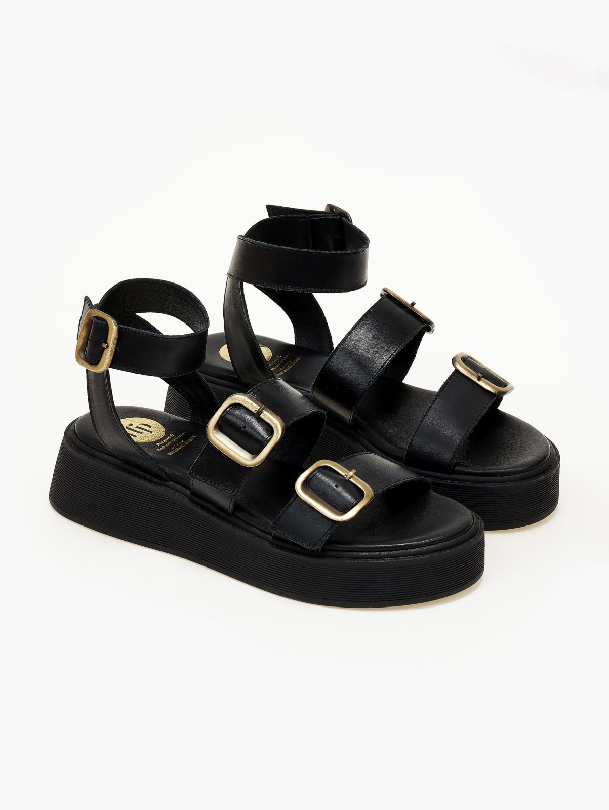 Σανδάλια δερμάτινα flatforms με τοκάδες TFP. Δένουν με μπαρέτα στο ύψος του αστραγάλου. Μαλακός πάτος με ενίσχυση. Ελληνικής κατασκευής.