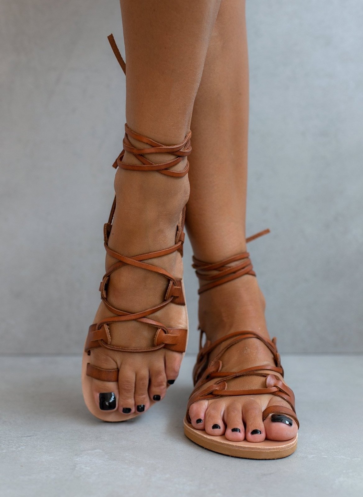 Δερμάτινα φλατ lace up σανδάλια . Δένουν με κορδόνια στη γάμπα. Ελληνικής κατασκευής, χειροποίητα.