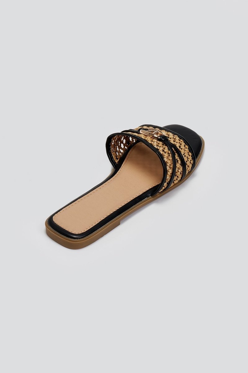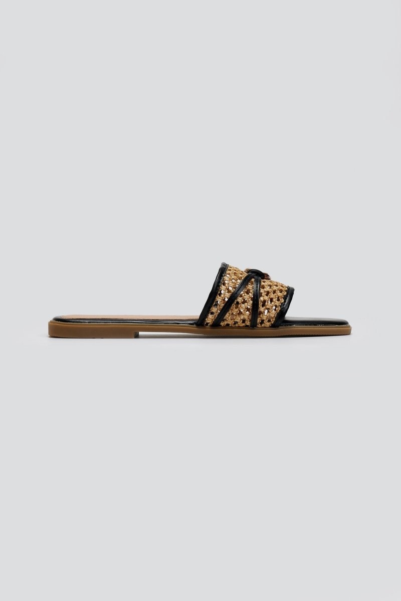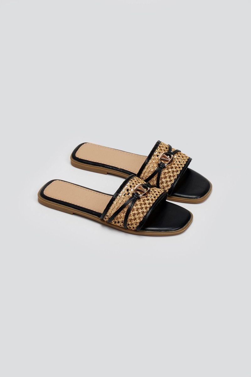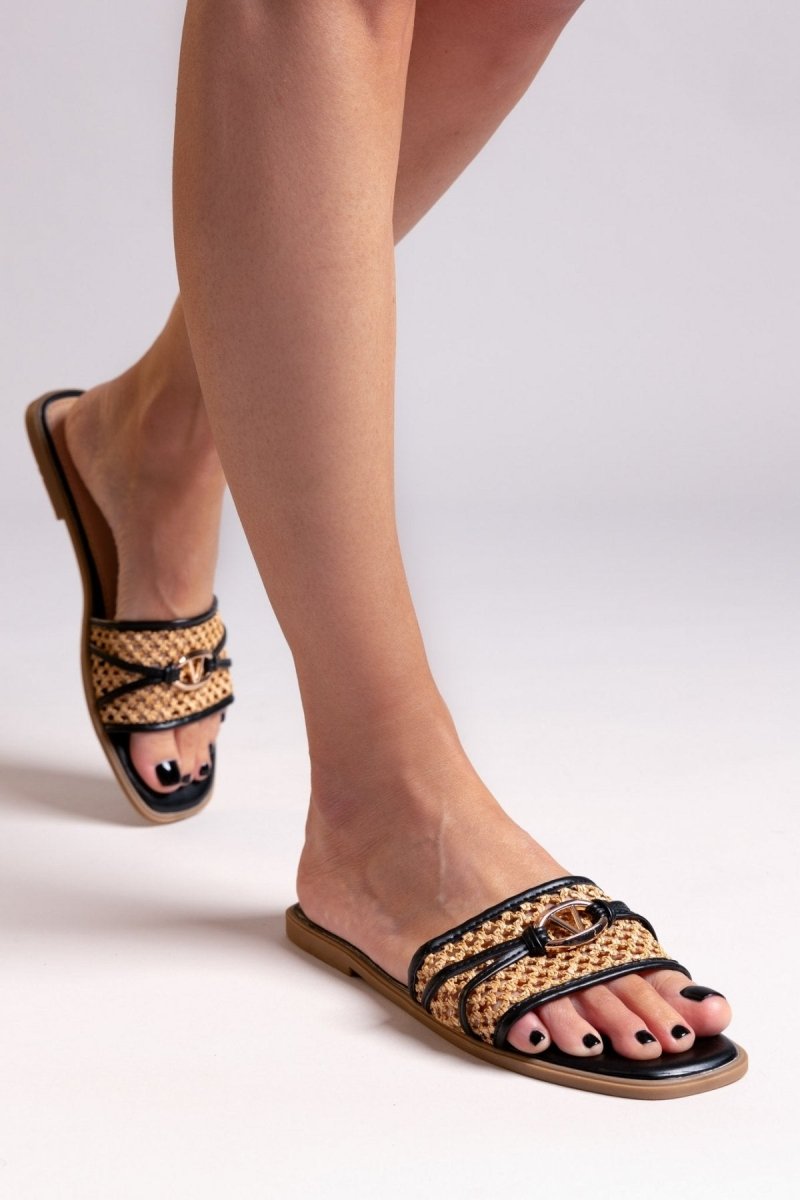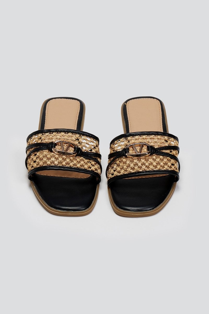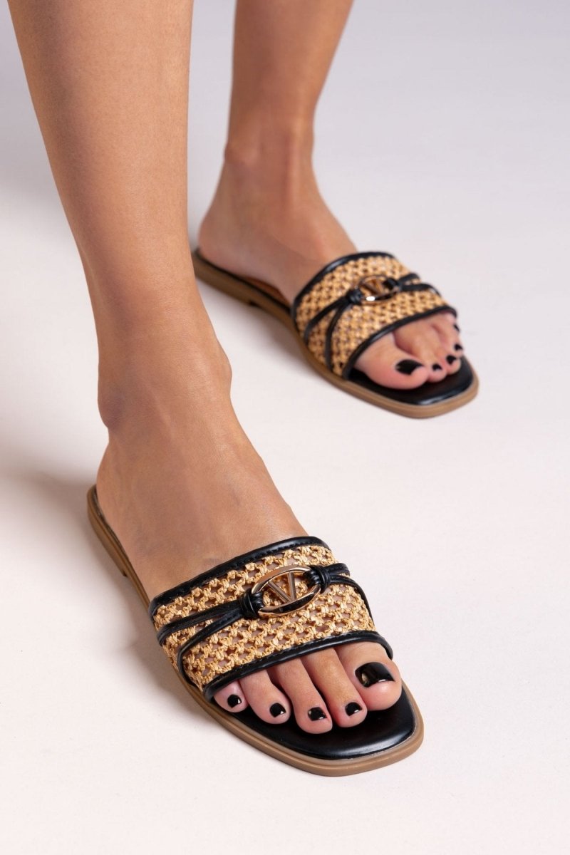 Σανδάλια με ψάθα και διάτρητο σχέδιο ERYNN. Λεπτομέρεια δερματίνη στο περίγραμμα. Μεταλλικό διακοσμητικό στοιχείο στο επάνω μέρος.