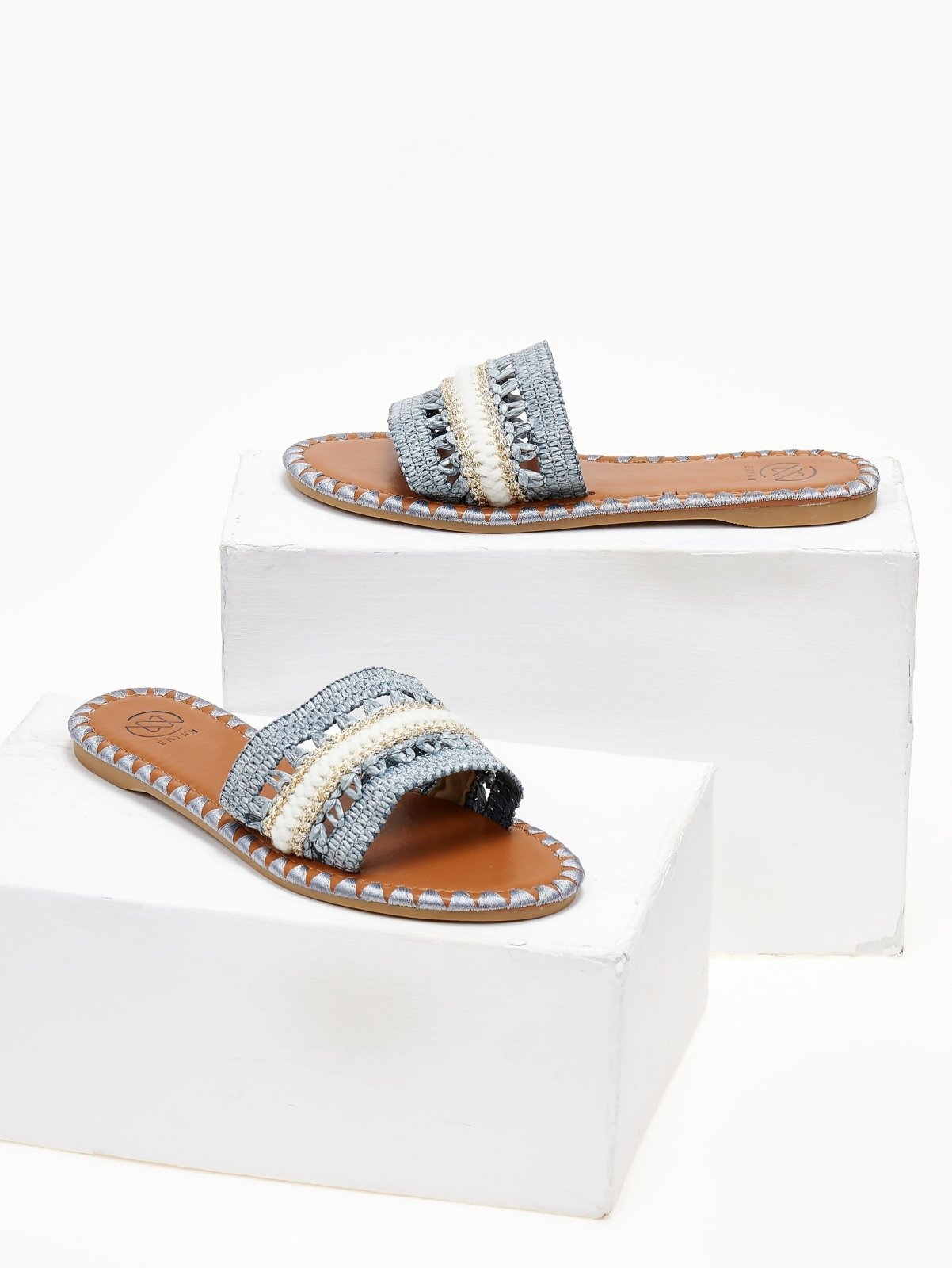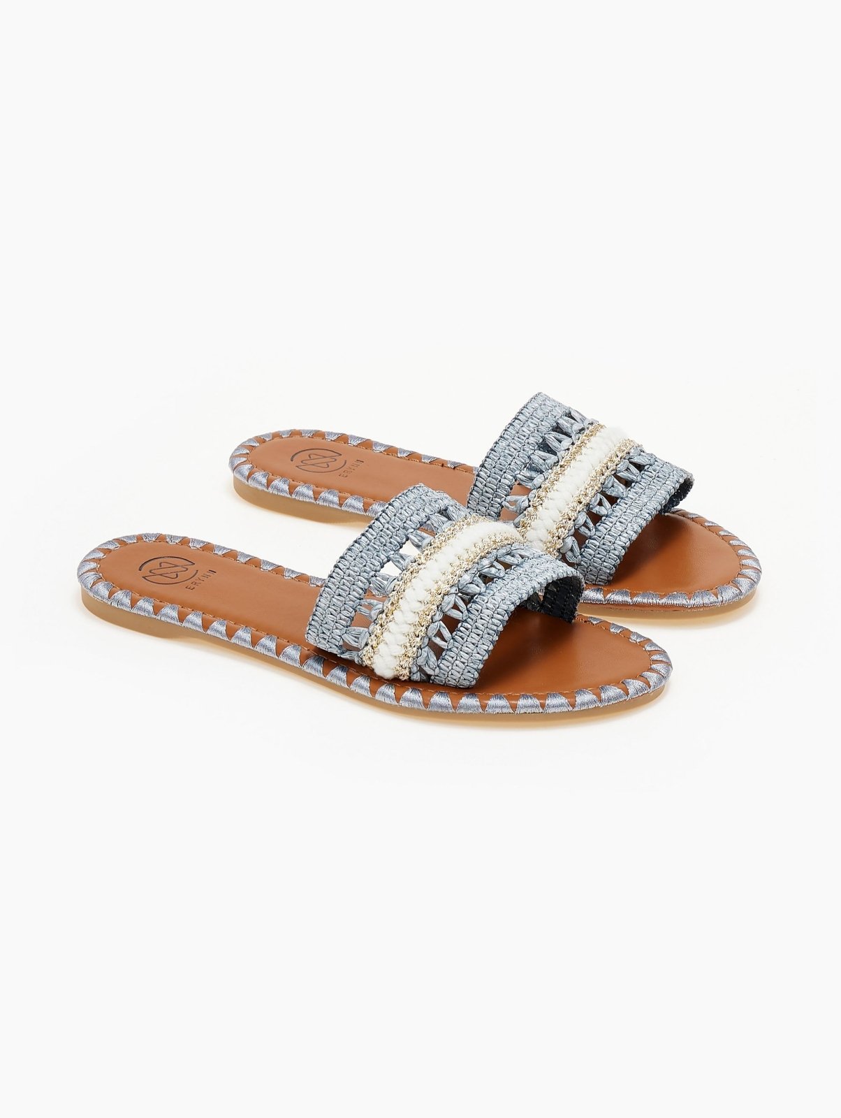Σανδάλια φλατ ERYNN. Έχει διάτρητη ψάθινη φάσα με πλεκτό σχέδιο. Σόλα μαλακή με λάστιχο. Σχέδιο με κλωστή περιμετρικά της σόλας.