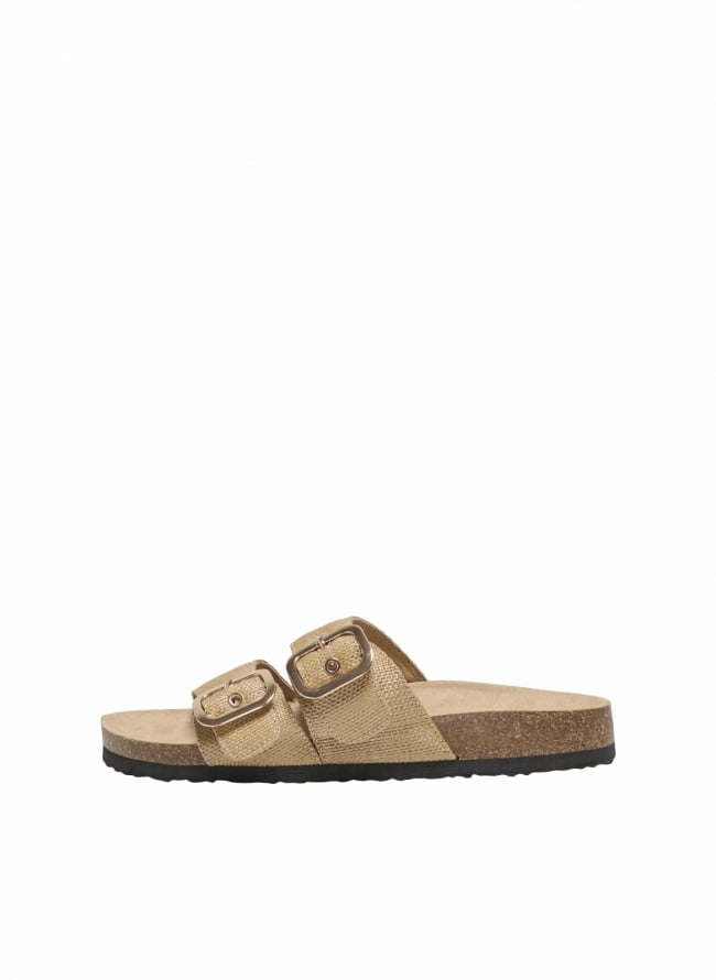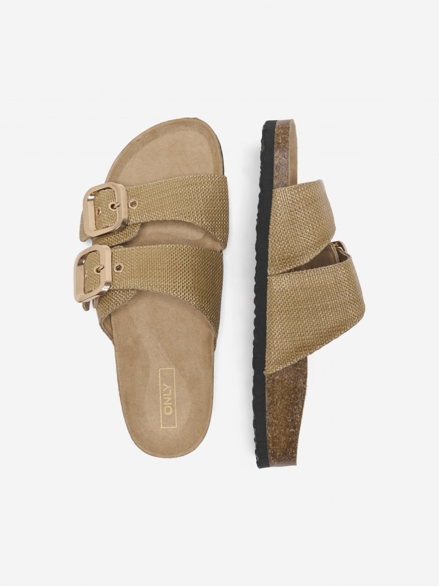 Σανδάλια flatforms από ψάθα ONLY. Φαρδιές φάσες με μεταλλικούς τοκάδες. Suede πάτος με ανατομικό σχήμα.