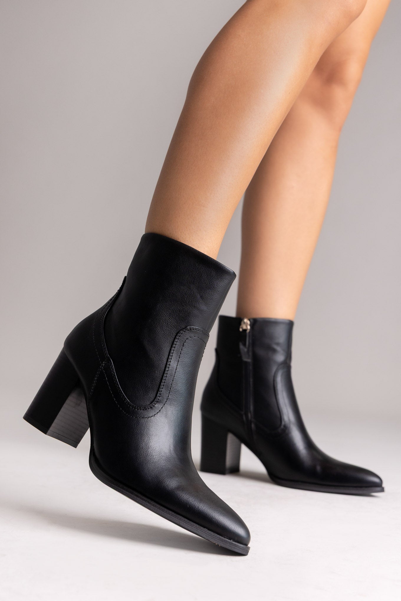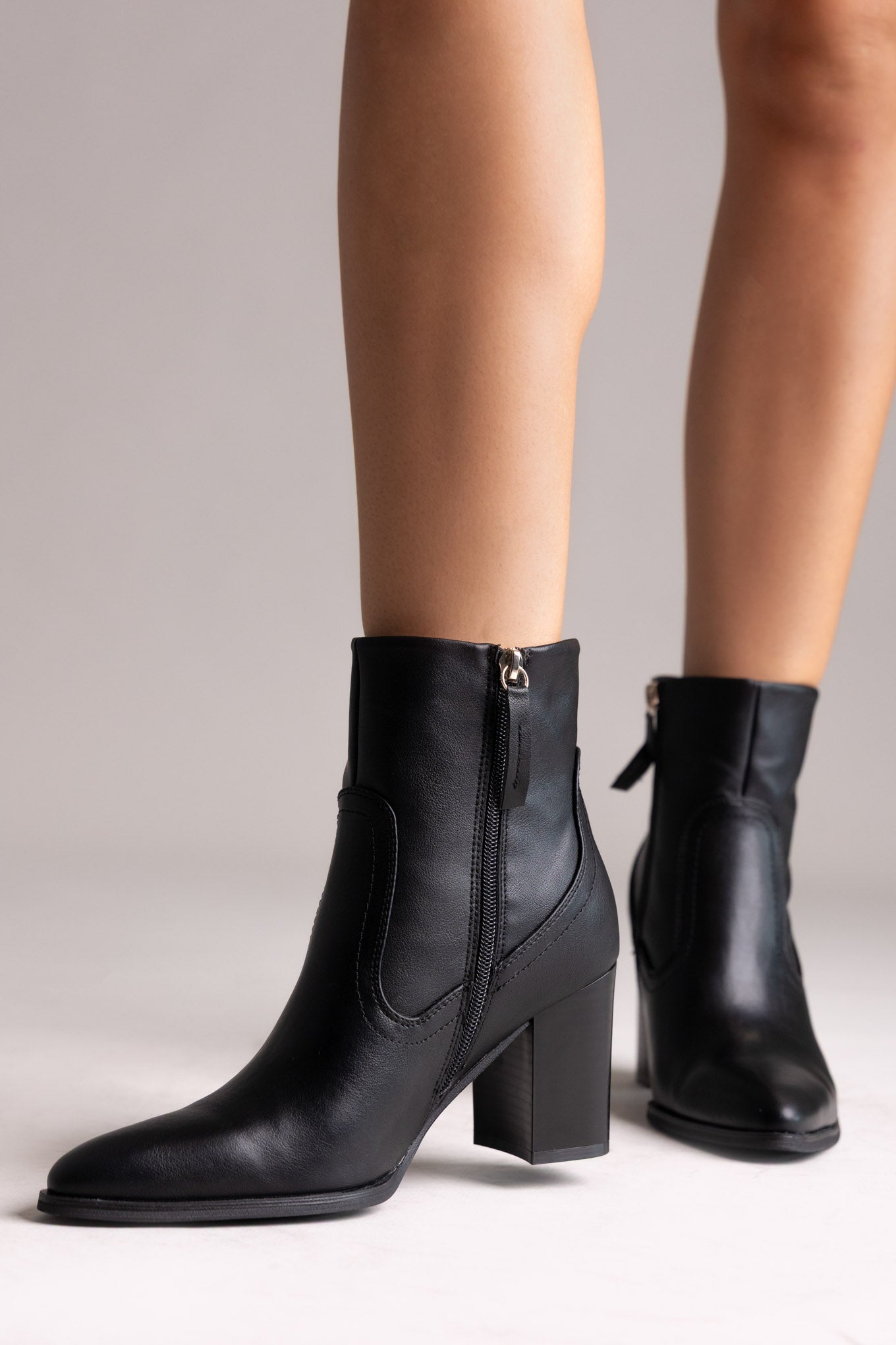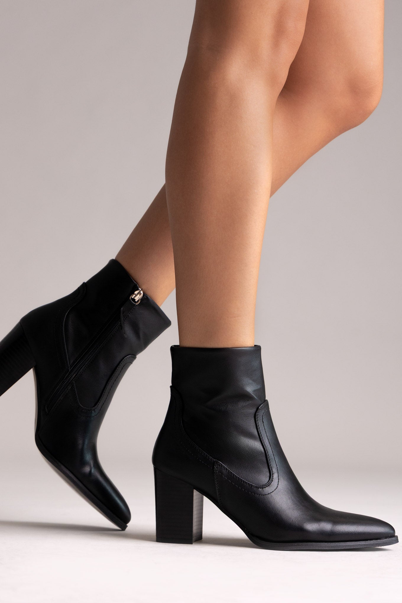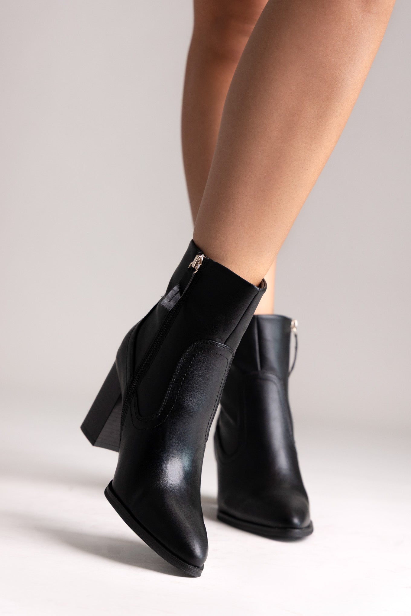 Μυτερά μποτάκια με ψηλό τετράγωνο τακούνι και πλαϊνό φερμουάρ. Κομψή σιλουέτα, σταθερή ανύψωση και ευέλικτη λάμψη σχεδιασμένα για μοντέρνο στυλ.