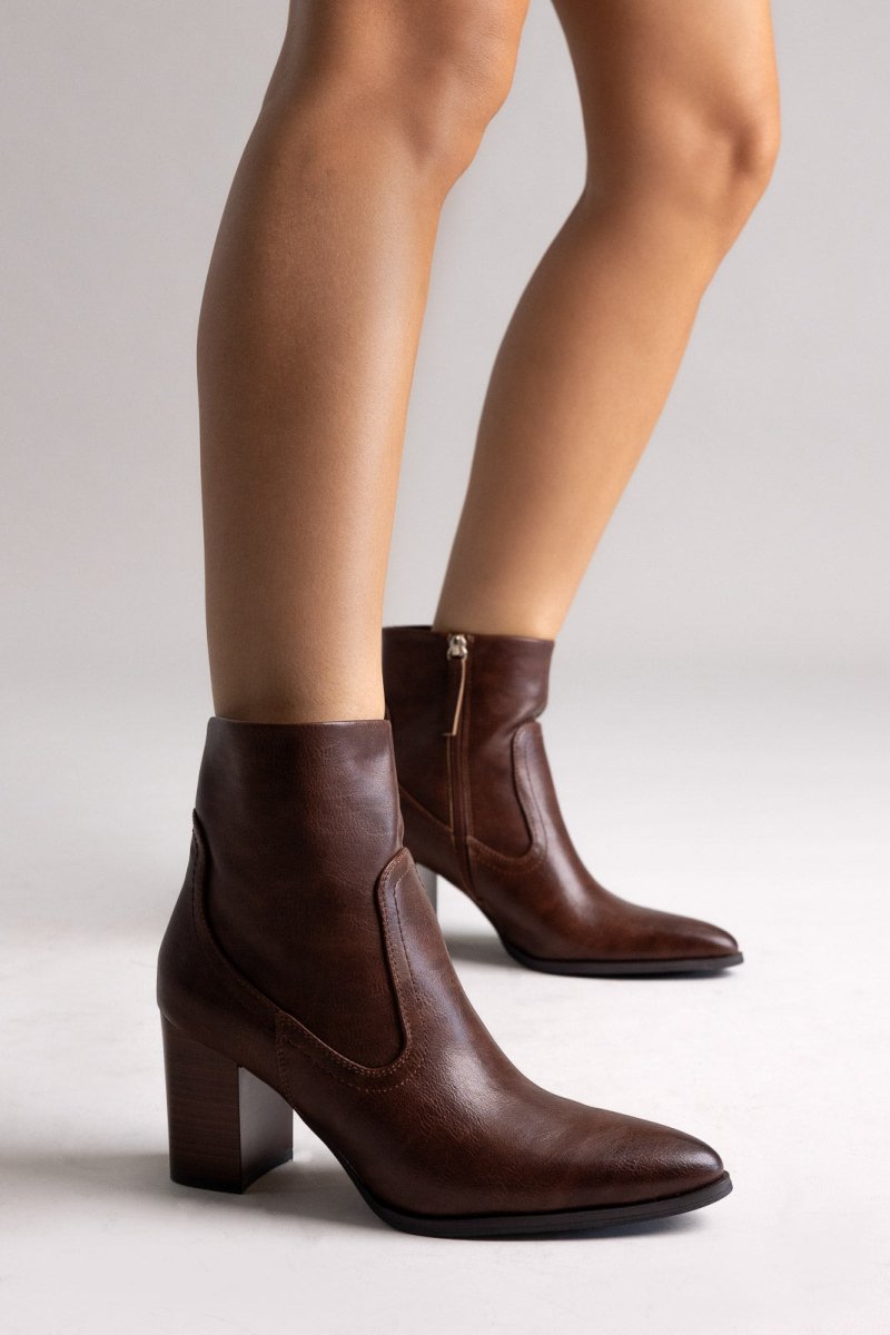 Μυτερά μποτάκια με ψηλό τετράγωνο τακούνι και πλαϊνό φερμουάρ. Κομψή σιλουέτα, σταθερή ανύψωση και ευέλικτη λάμψη σχεδιασμένα για μοντέρνο στυλ.