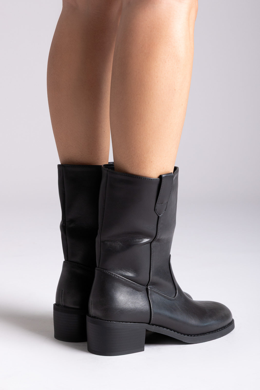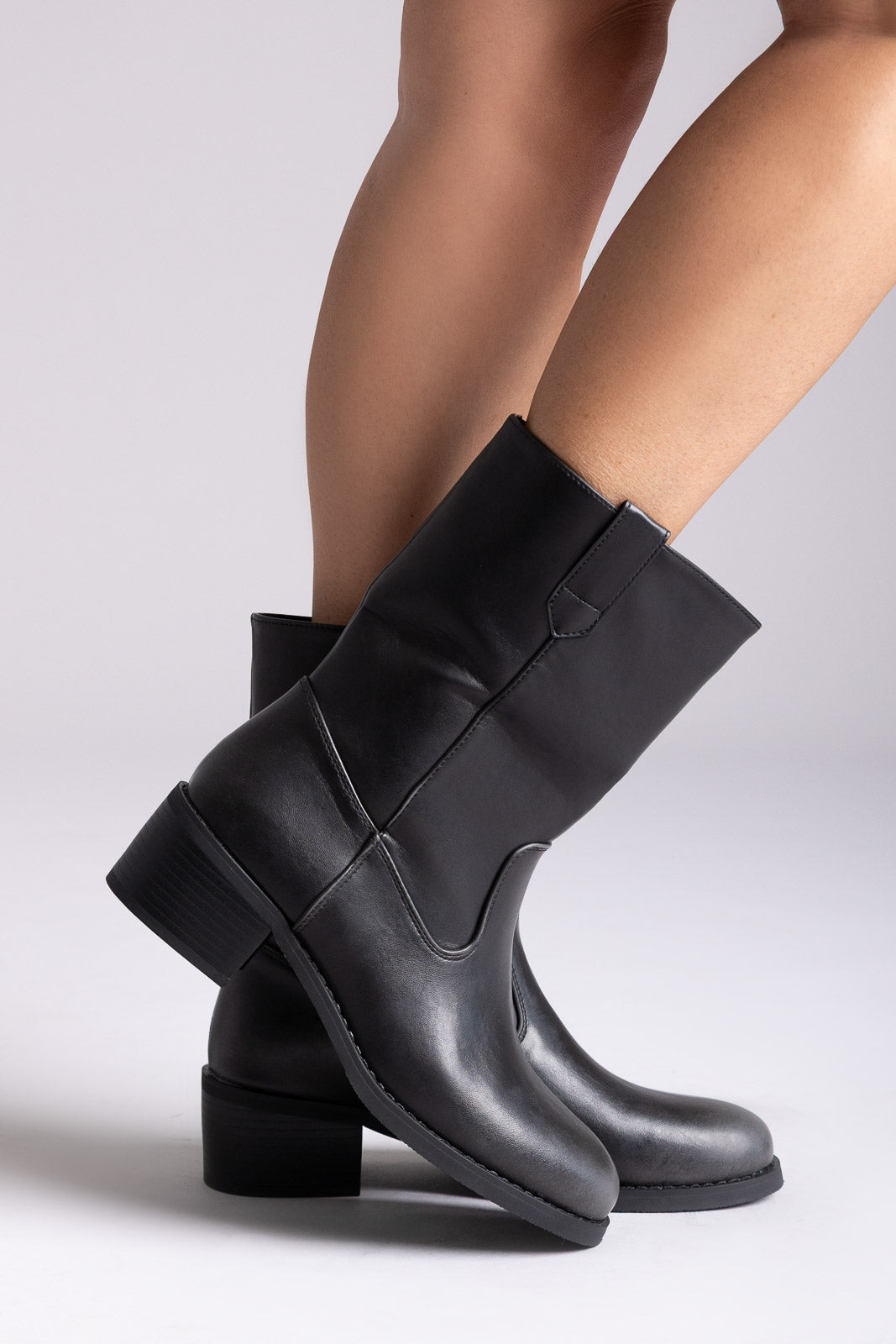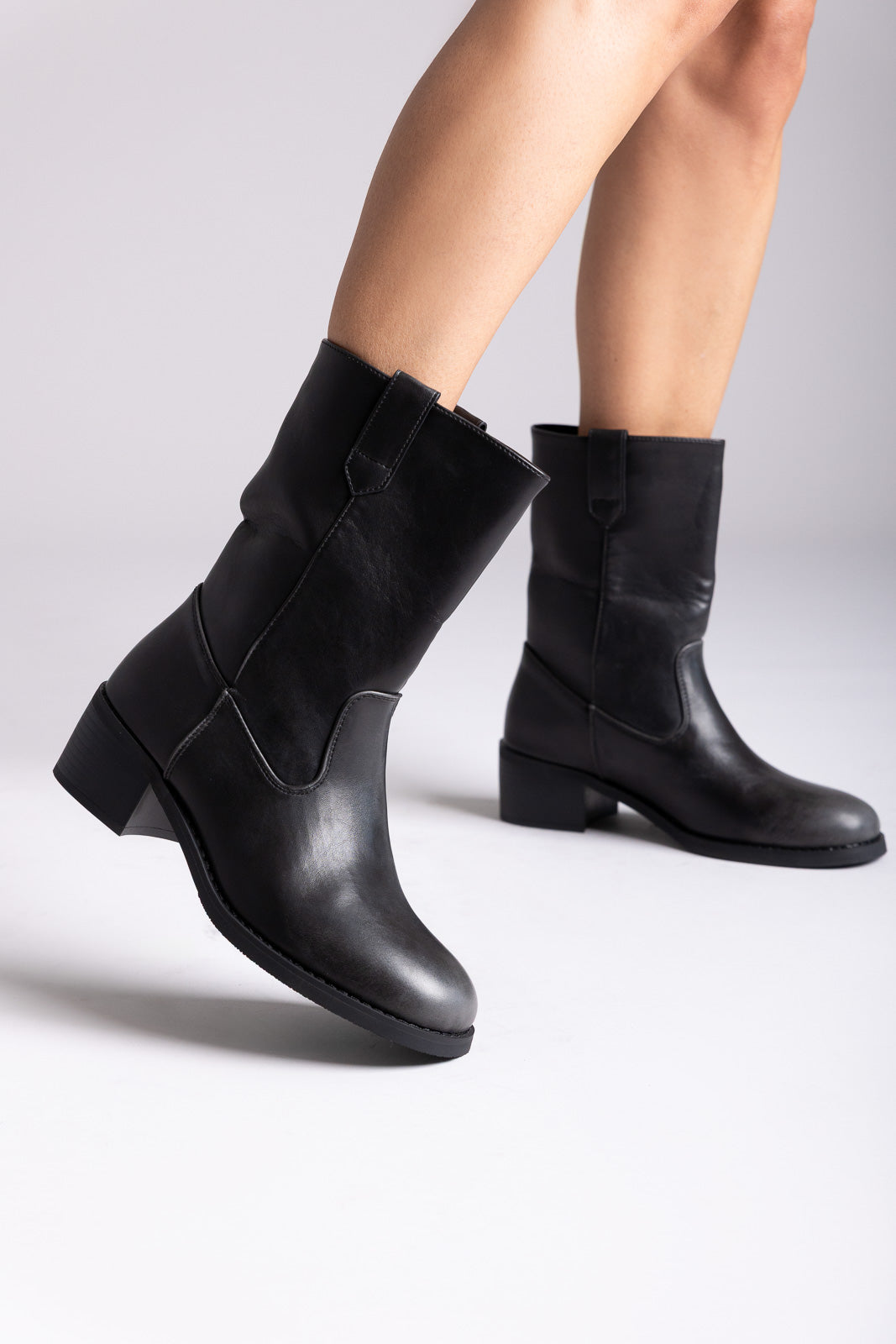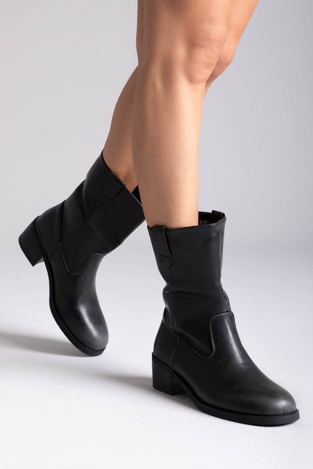 Καθημερινά μποτάκια με χαμηλό τετράγωνο τακούνι και στρογγυλή μύτη. Καθαρές γραμμές και άνεση όλη μέρα, ιδανικά για κομψό καθημερινό στυλ.