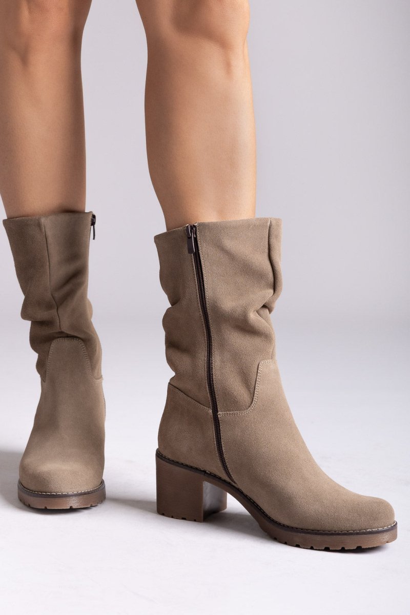 Γνήσια σουέτ μποτάκια slouch με τετράγωνο τακούνι και άνεση Dryflex. Αναπνεύσιμα, με μαλακή επένδυση και σταθερότητα—κομψό στυλ για άνετη εμφάνιση όλη μέρα.