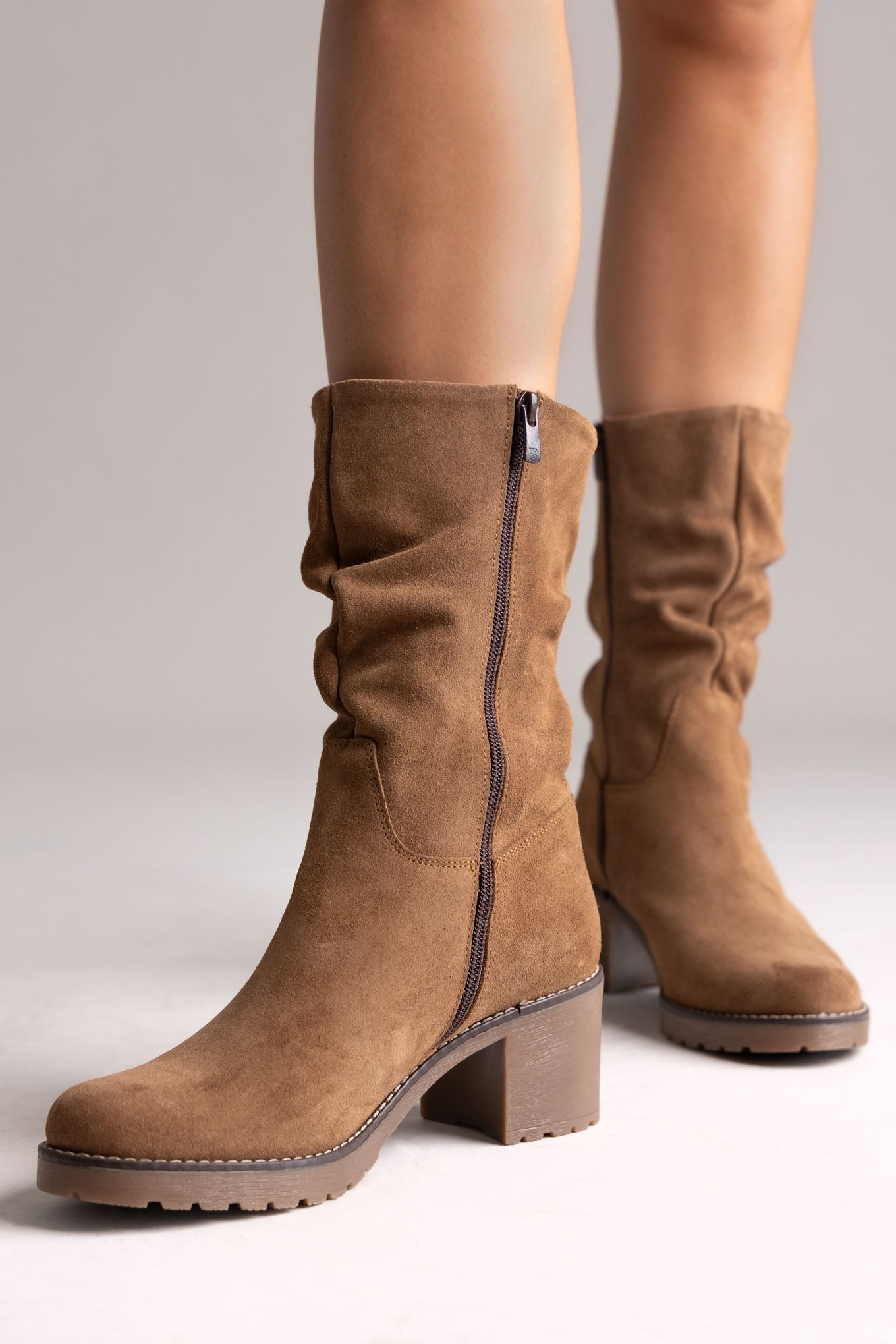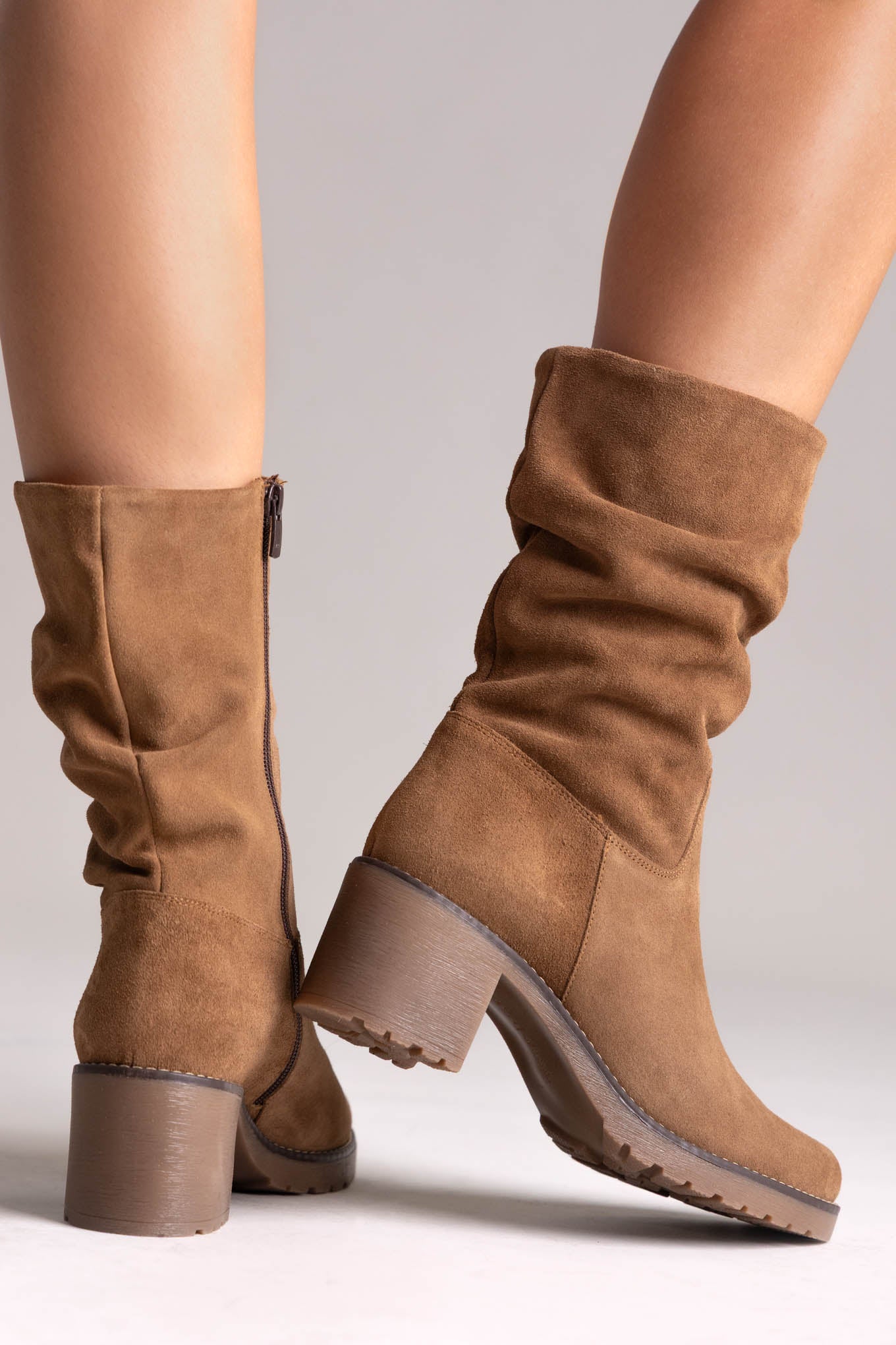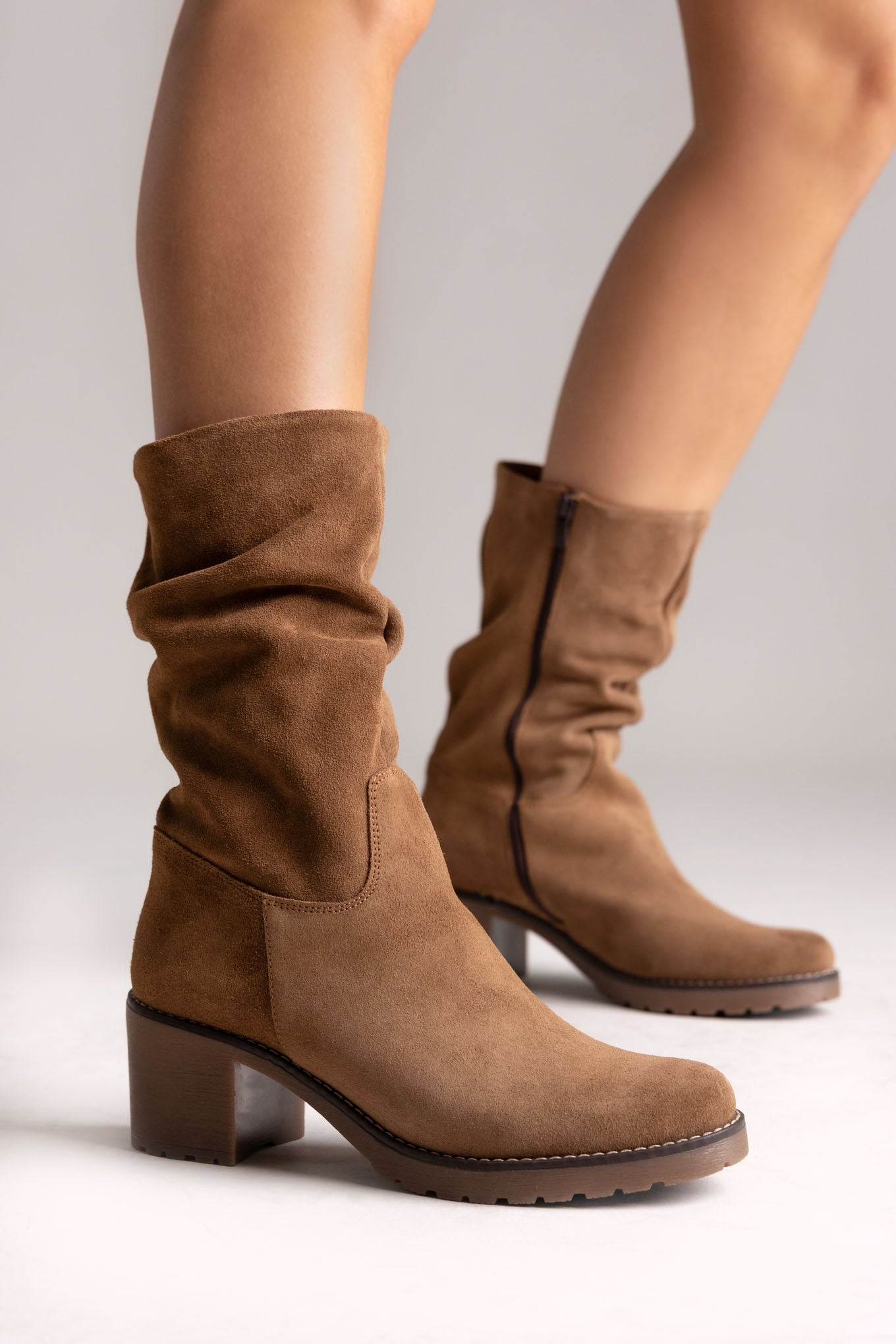 Γνήσια σουέτ slouch μποτάκια με τακούνι block και άνεση Dryflex. Αναπνεύσιμα, με μαλακή επένδυση και σταθερότητα—κομψό στυλ για άνετη εμφάνιση όλη μέρα.