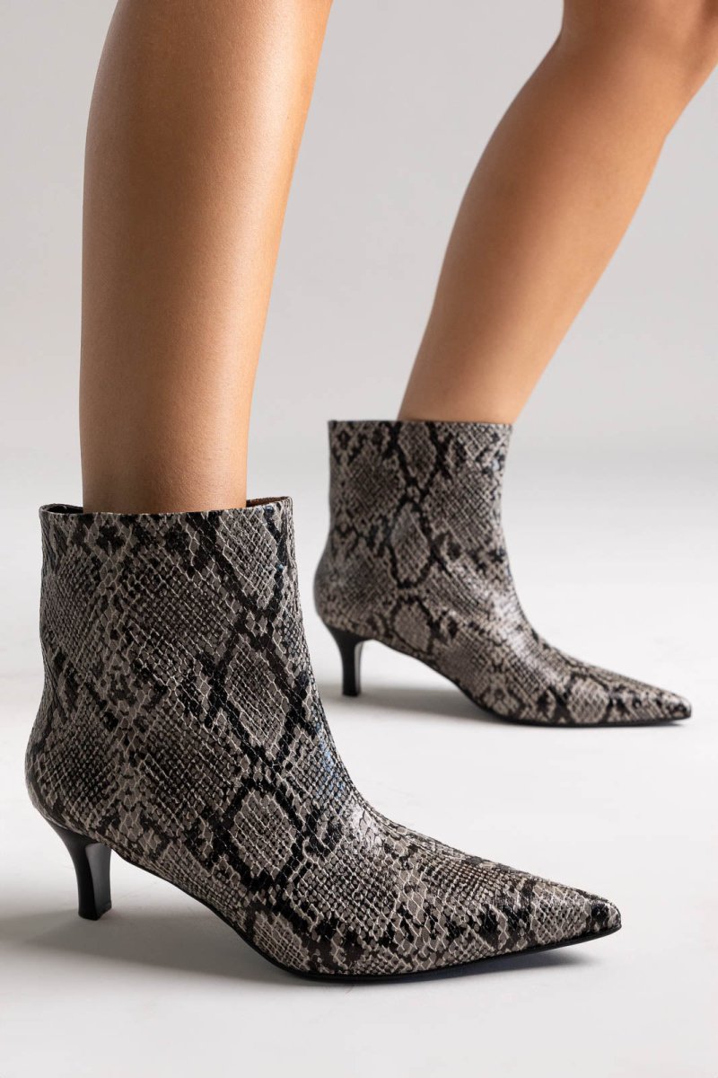 Μυτερά γυναικεία μποτάκια με snake print. Το τακούνι kitten συνδυάζει κομψότητα και άνεση—ευέλικτο στυλ για τη σύγχρονη γυναίκα. Ιδανικά από το πρωί μέχρι το βράδυ.