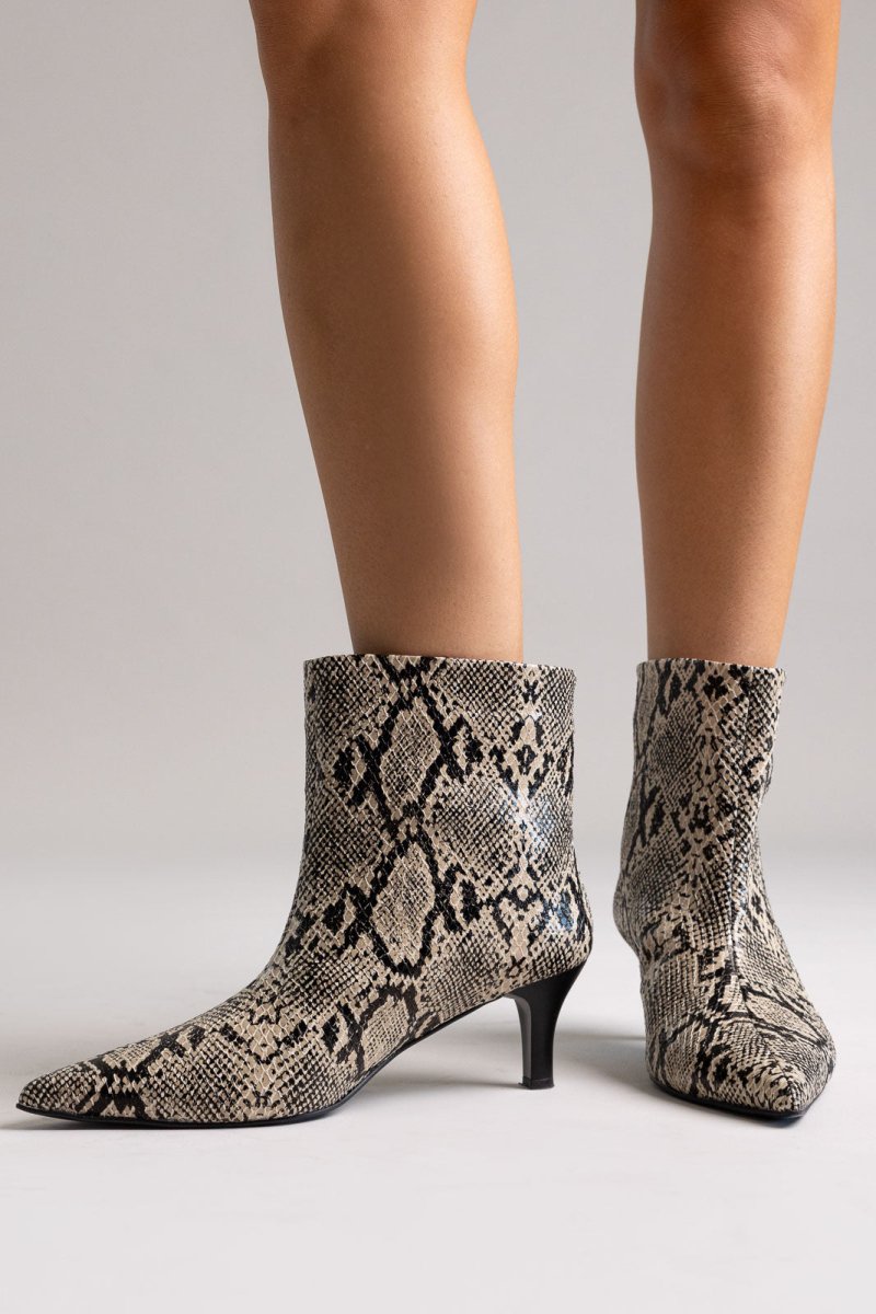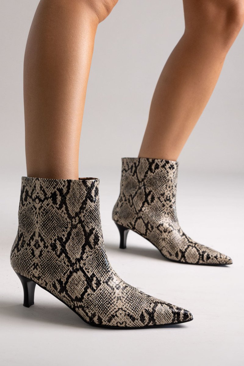 Μυτερά γυναικεία μποτάκια με snake print. Το τακούνι kitten συνδυάζει κομψότητα και άνεση—ευέλικτο στυλ για τη σύγχρονη γυναίκα. Ιδανικά από το πρωί μέχρι το βράδυ.