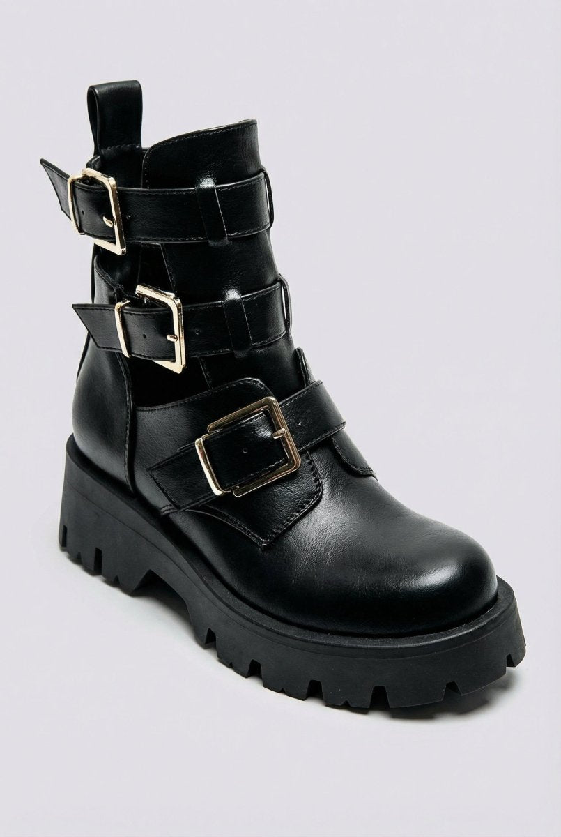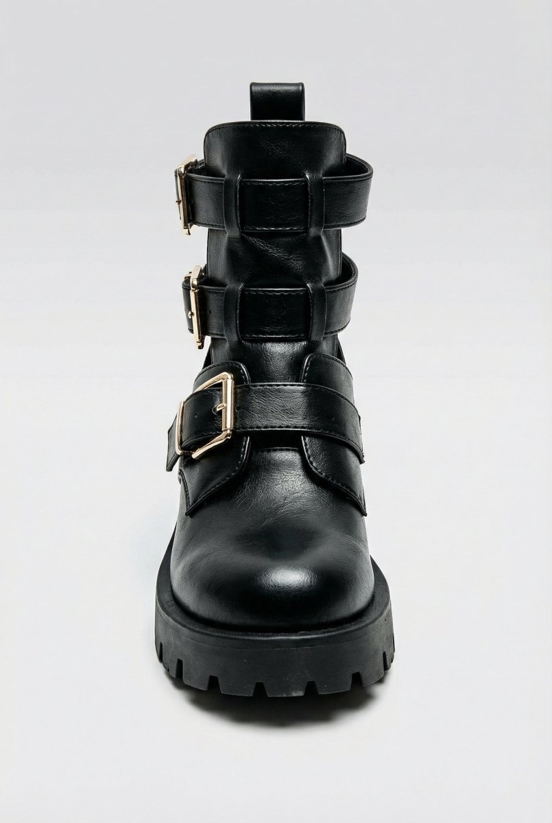 Μποτάκια biker με κομμένα πλαϊνά, λεπτομέρειες με λουριά και έντονες αγκράφες. Τολμηρά αλλά φοριούνται εύκολα, με σταθερή εφαρμογή και άνεση—κατασκευασμένα για τη σύγχρονη γυναίκα.