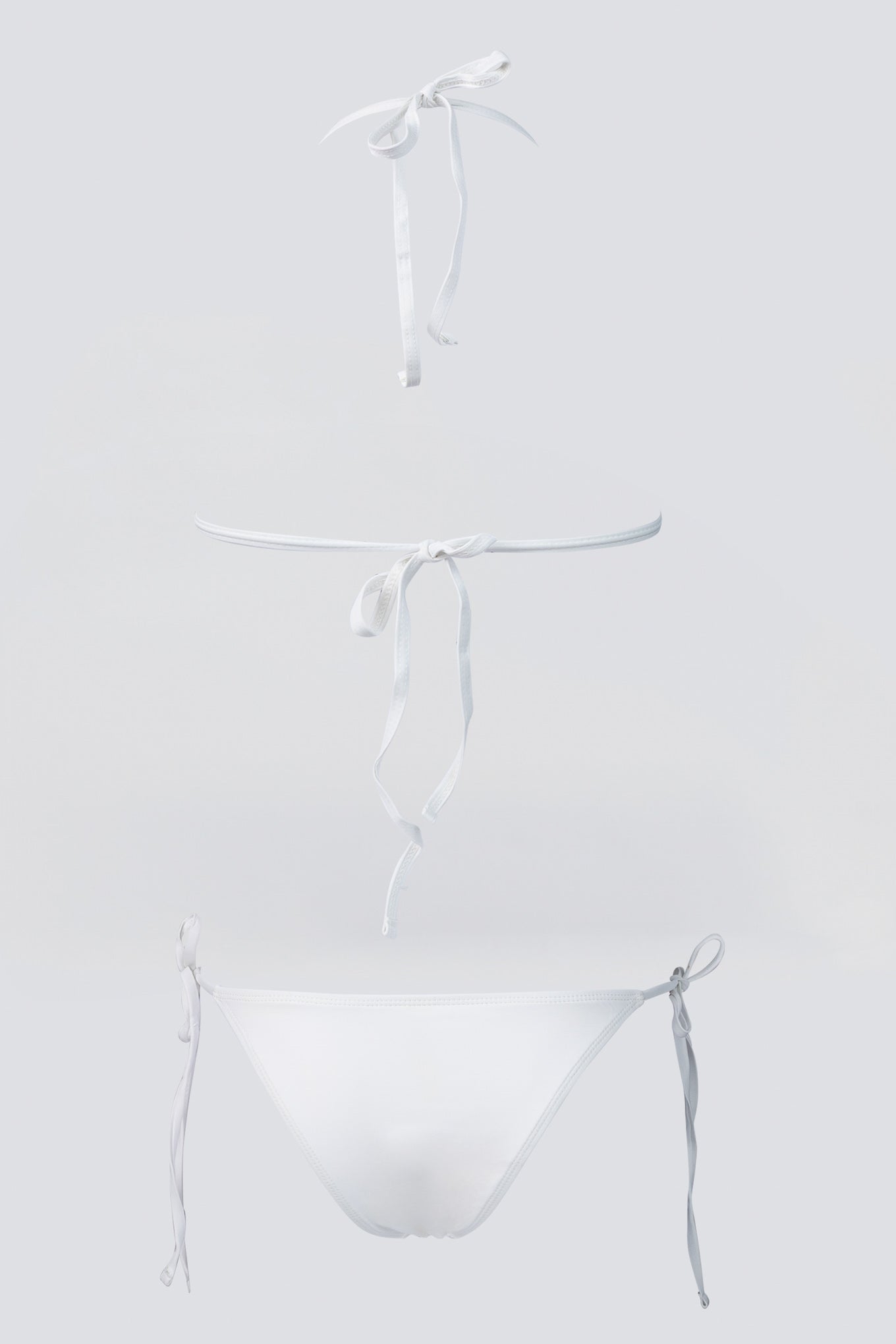 Μπικίνι σετ με τριγωνάκι. Έχει ανάγλυφο σχέδιο. Το τοπ έχει λεπτά κορδόνια που δένουν στο λαιμό και στην πλάτη. Αποσπώμενη ενίσχυση. Το σλιπ έχει μικρή κάλυψη. Λάστιχο με σούρες στα πλαϊνά.
