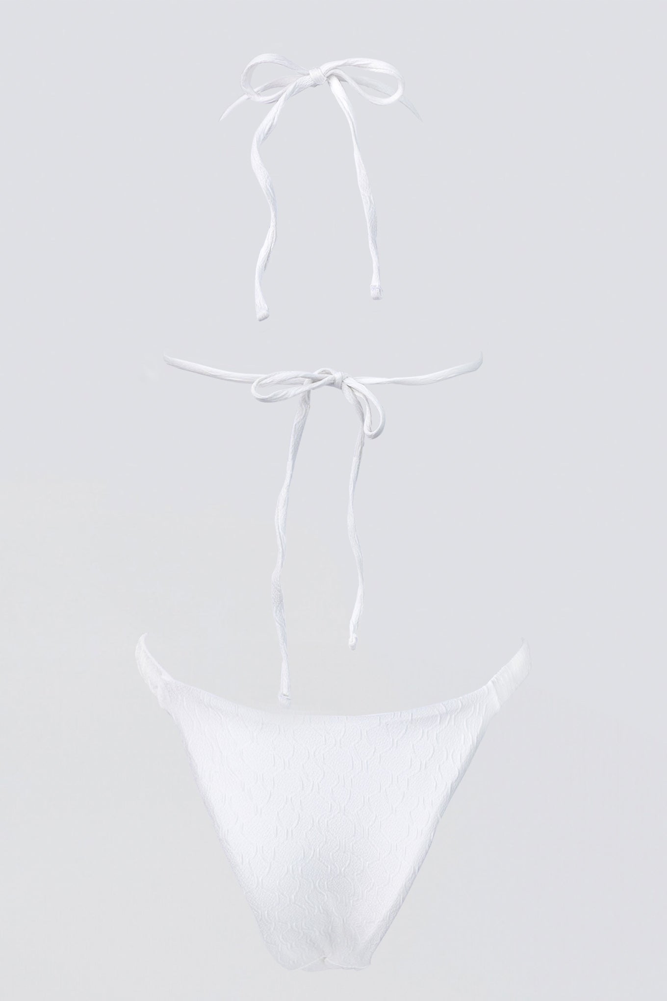 Μπικίνι σετ κλασικό. Το τοπ έχει διάτρητο σχέδιο και είναι τριγωνάκι. Έχει μπανέλα που αφαιρείται. Το σλιπ είναι χαμηλό με κορδονάκια στο πλάι. Μέτρια κάλυψη.