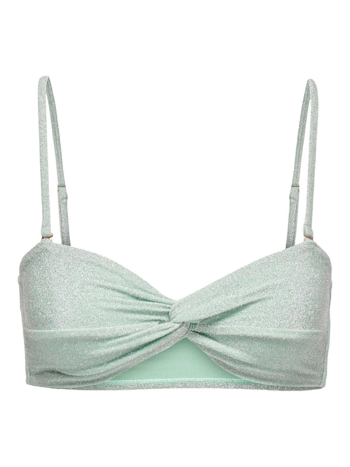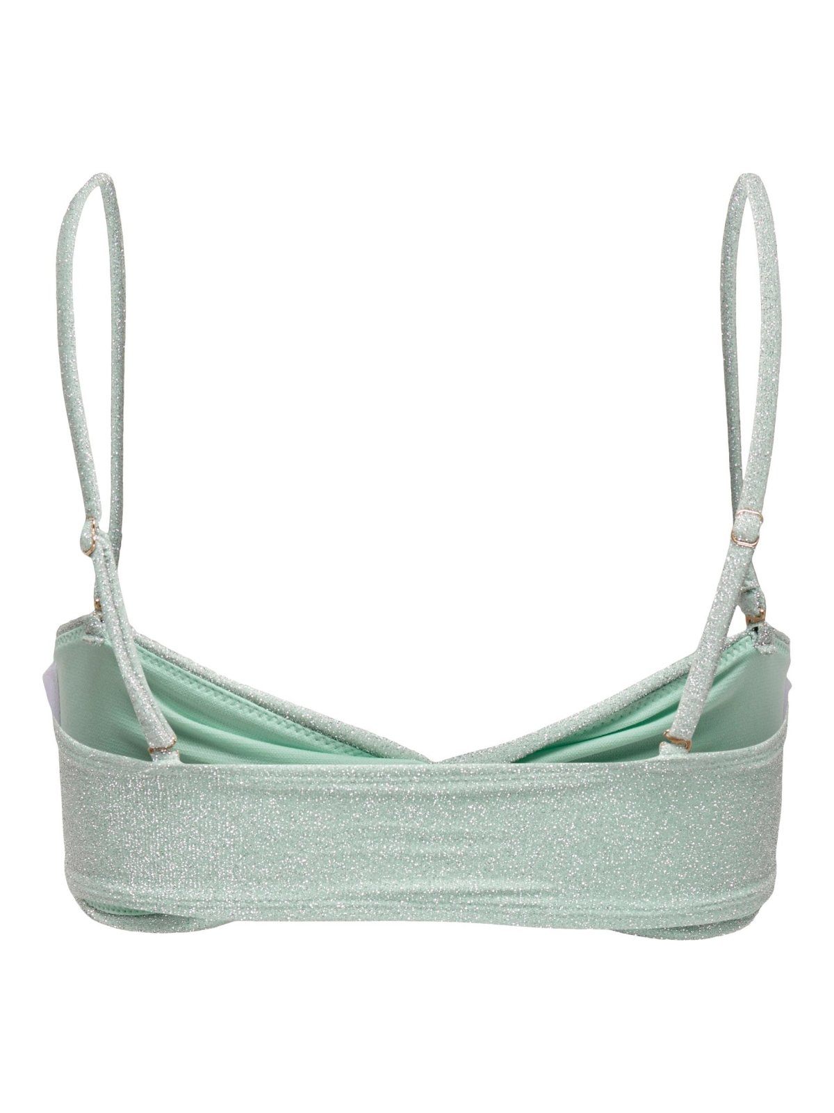 Μπικίνι τοπ lurex ΜΟΝΟ. Έχει σχέδιο κόμπο στη μπροστινή πλευρά. Αποσπώμενα ραντάκια. Χωρίς ενίσχυση.