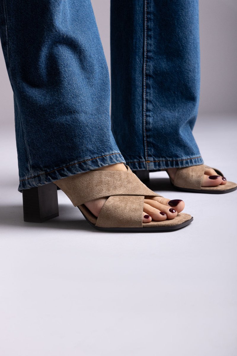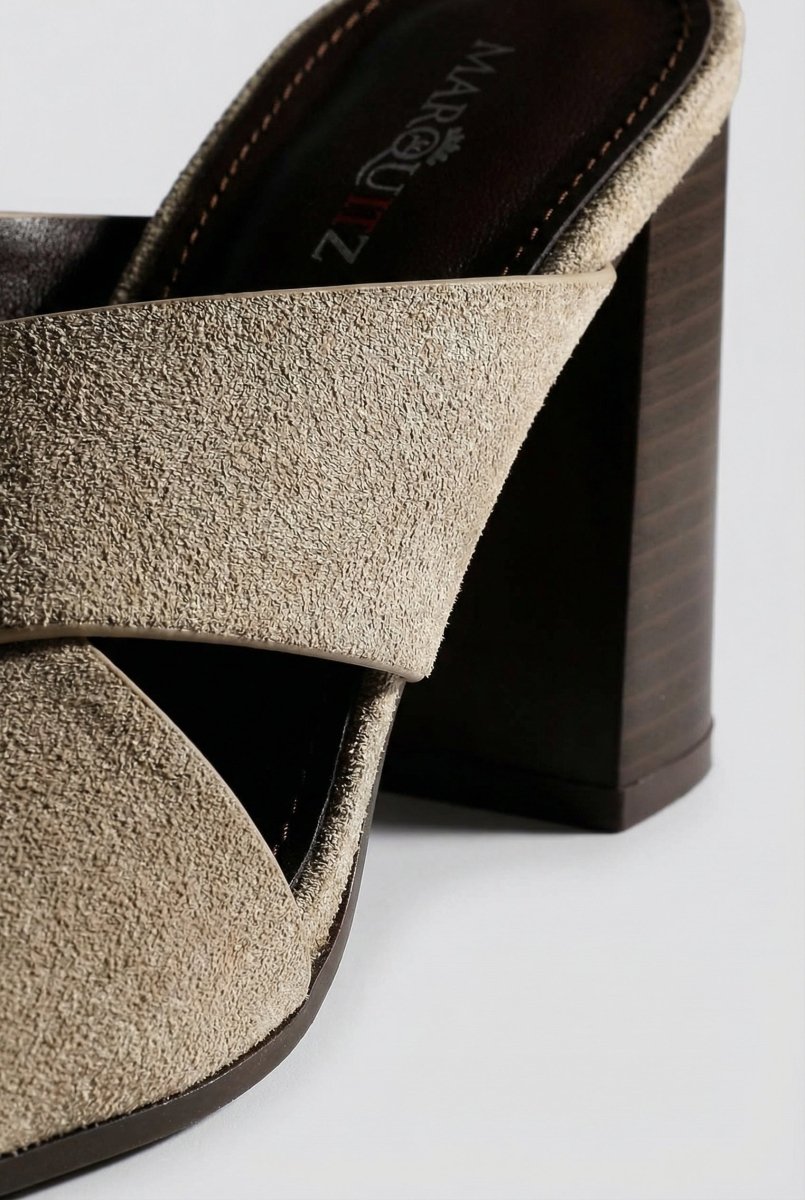 Σουέντ mules με λουριά που διασταυρώνονται και σταθερό ψηλό τετράγωνο τακούνι. Κομψό σχέδιο που φοριέται εύκολα, με ισορροπημένη άνεση. Εκλεπτυσμένο στυλ φτιαγμένο για τη σύγχρονη γυναίκα.