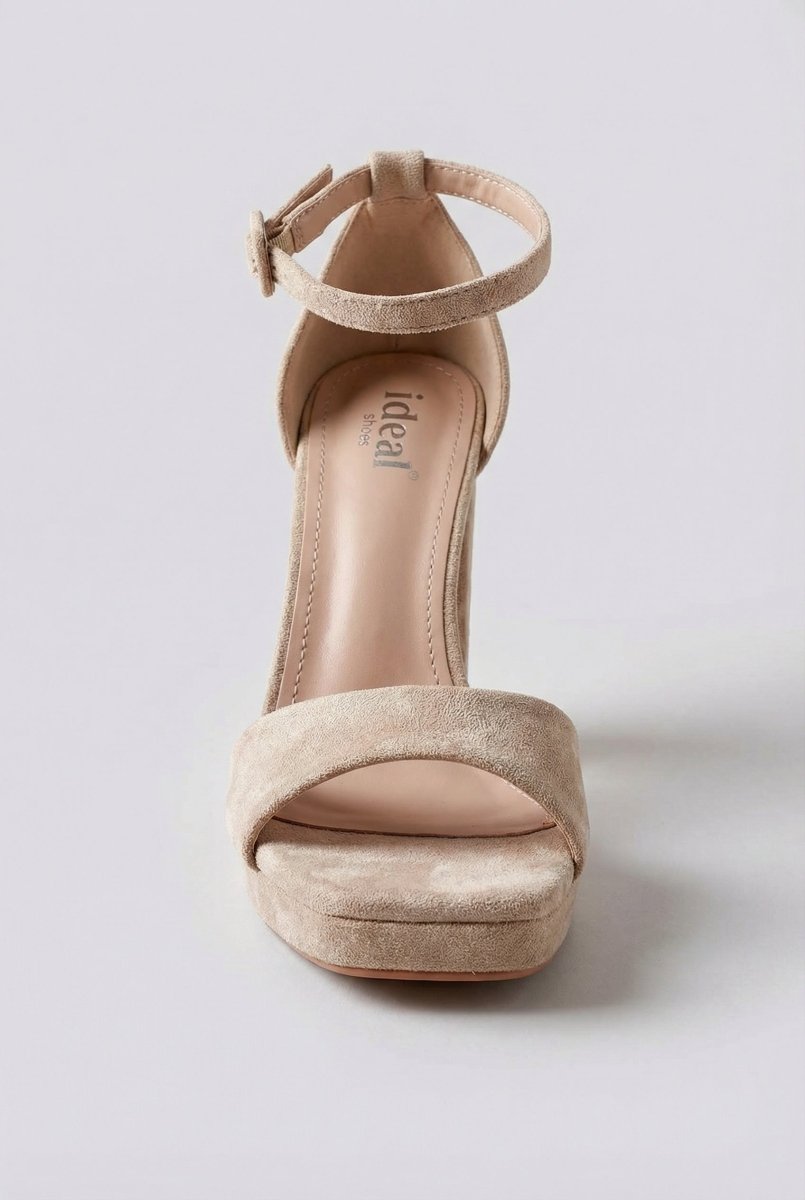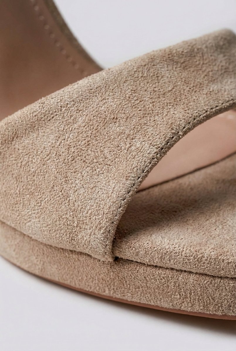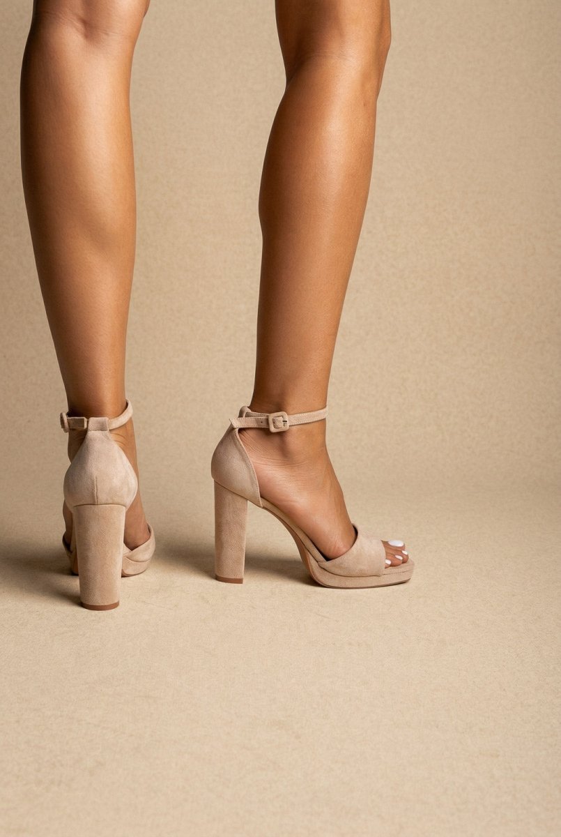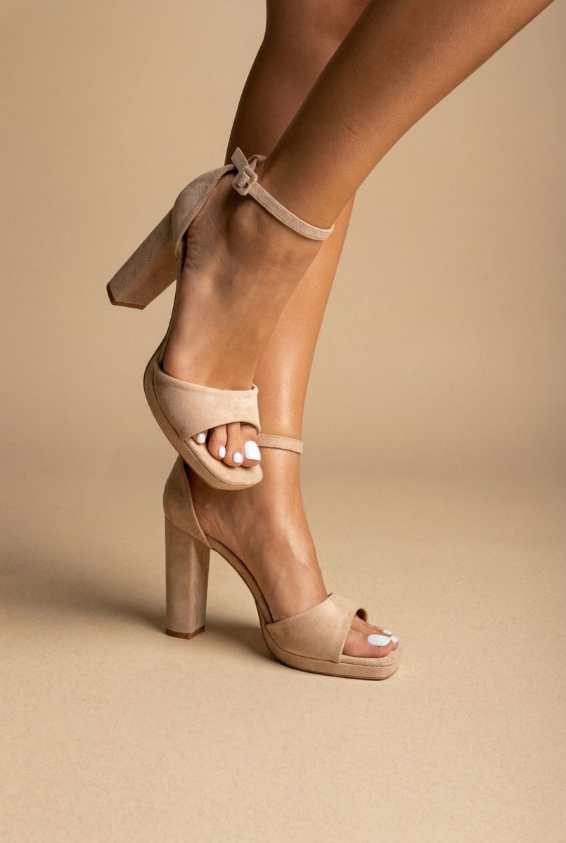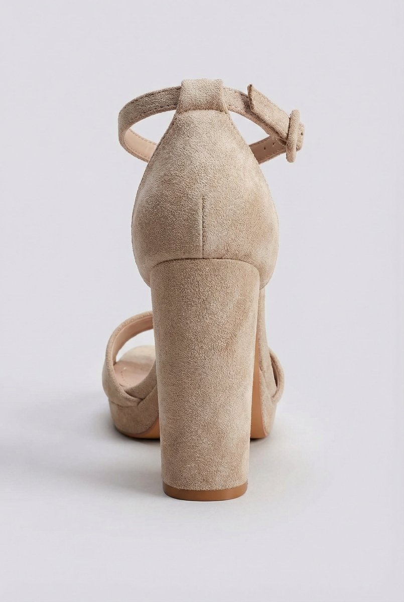 The MARQUIIZ Block Heel Sandals in Beige Suede combine timeless elegance with modern comfort. Featuring a sturdy block heel and platform sole, these sandals deliver balanced height and confident steps for any occasion. The closed back design paired with a secure ankle strap ensures stability and support, making them an ideal choice for events and elevated evening looks.