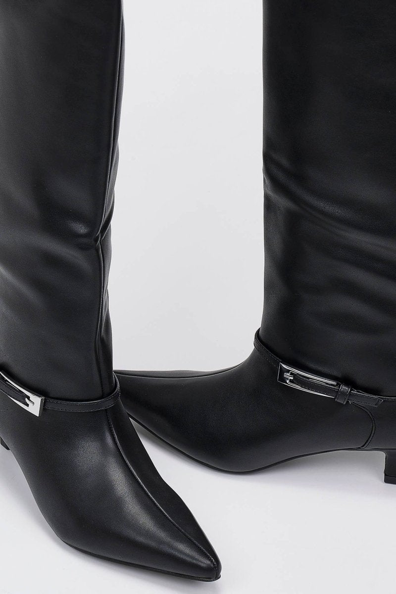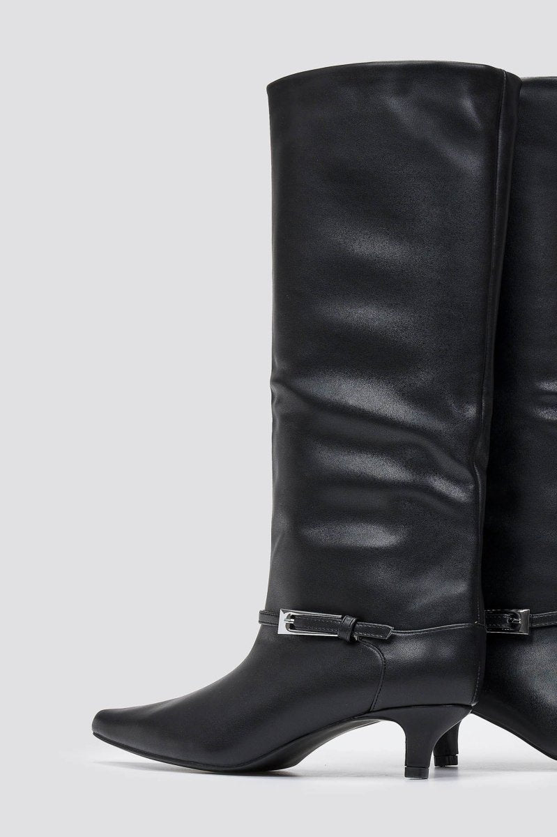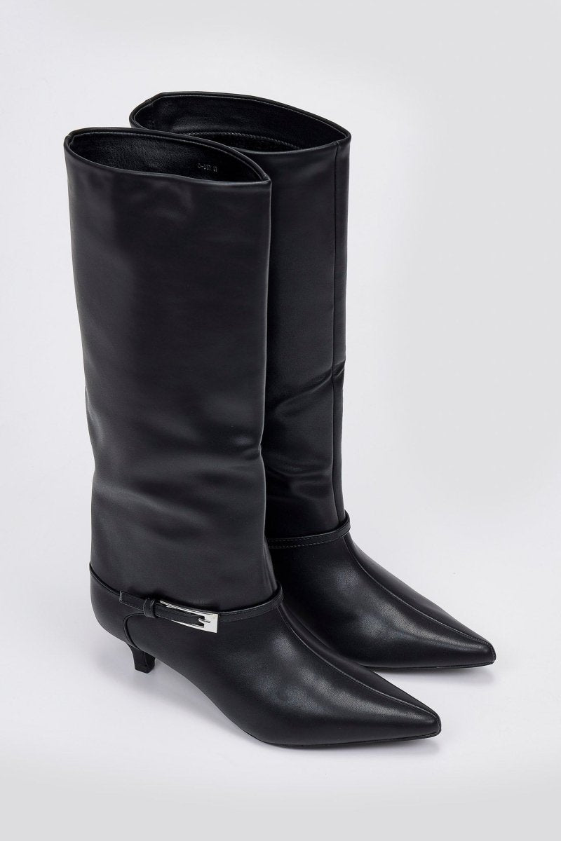 Μυτερές μπότες με χαμηλό τακούνι και πλαϊνό φερμουάρ. Κομψές γραμμές και άνεση όλη μέρα για εκλεπτυσμένο, ευέλικτο στυλ από το πρωί ως το βράδυ.