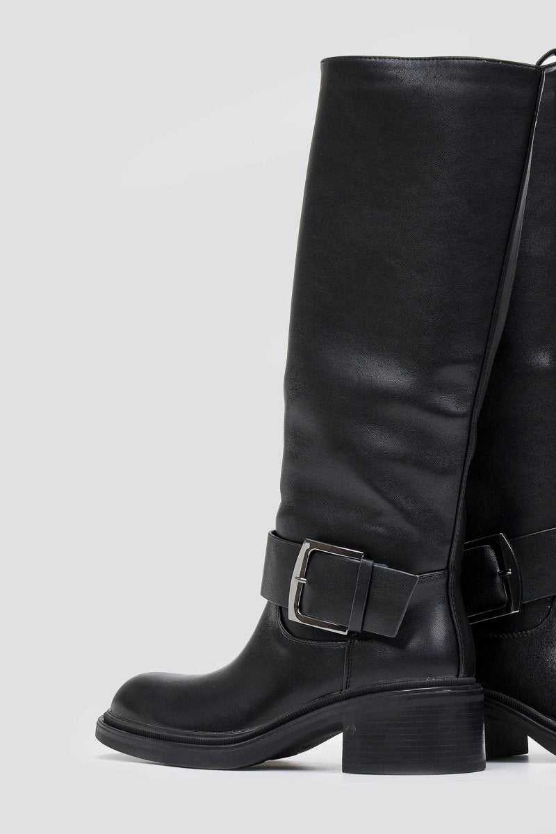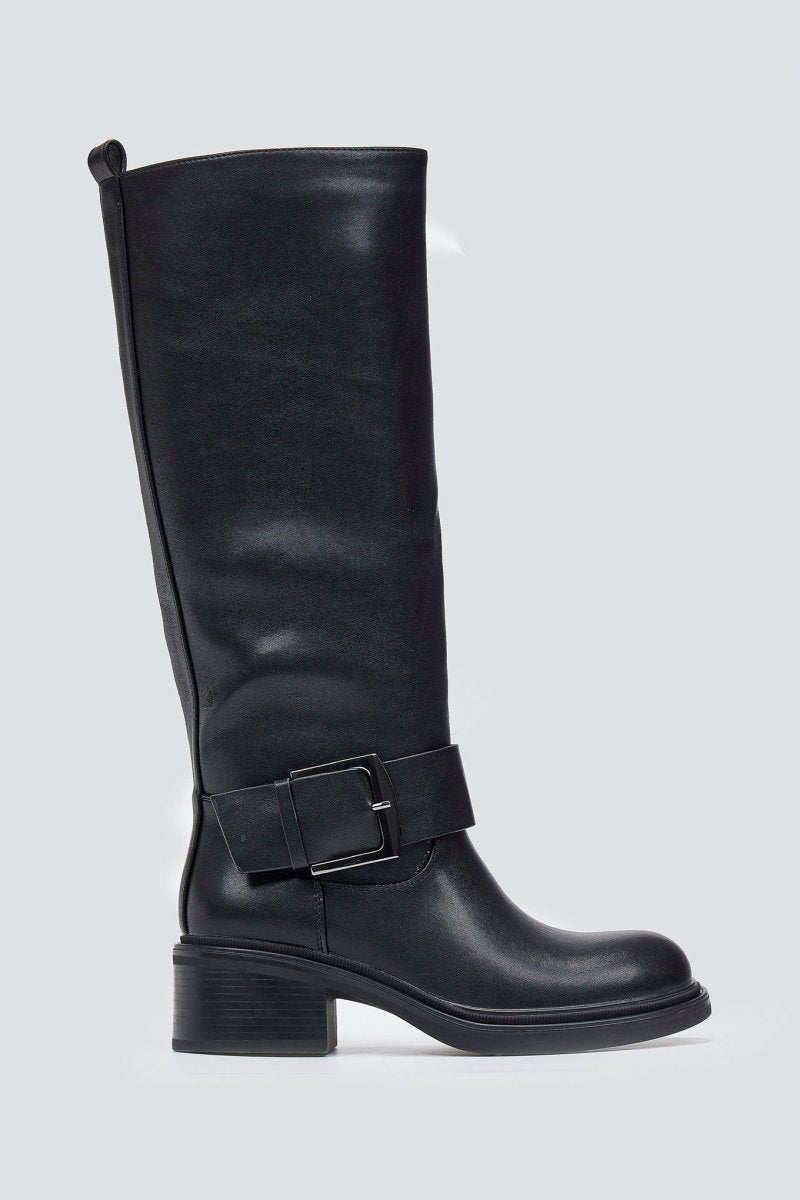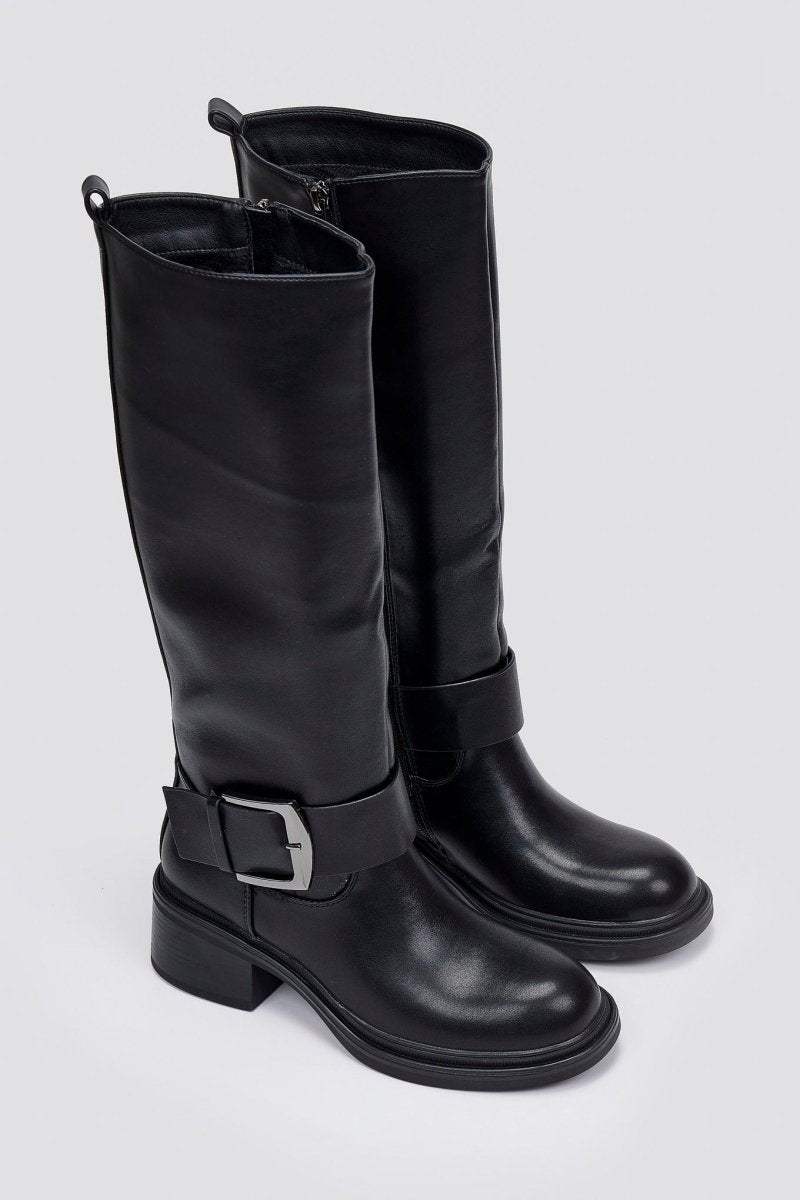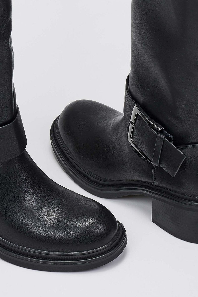 Μπότες statement με εντυπωσιακή oversized αγκράφα και στρογγυλή μύτη. Ομαλό κλείσιμο με φερμουάρ και εκλεπτυσμένος σχεδιασμός, κατασκευασμένες για άνετο, μοντέρνο στυλ.