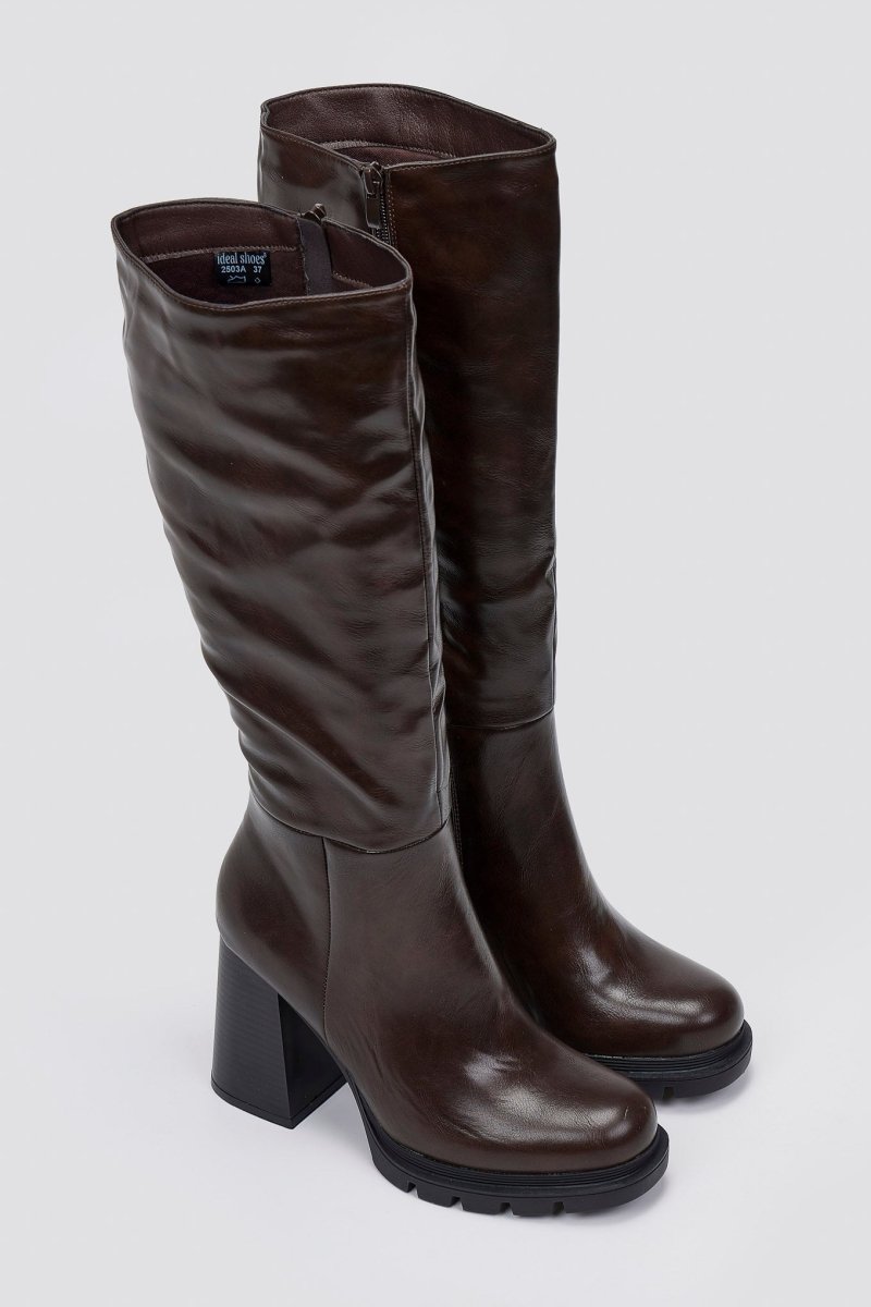 Μπότες πλατφόρμα με ψηλό τακούνι, στρογγυλή μύτη και φερμουάρ στο πλάι. Κομψή σιλουέτα και μαλακή άνεση, σχεδιασμένες για μοντέρνο στυλ από το πρωί ως το βράδυ.