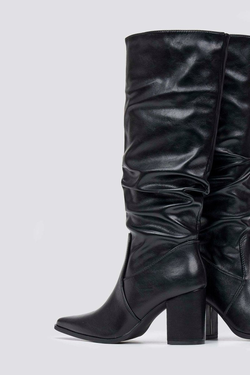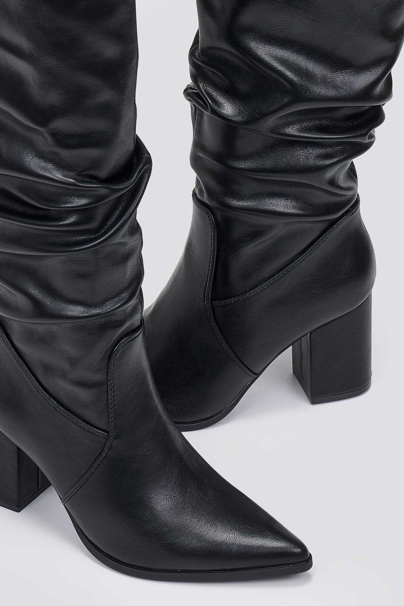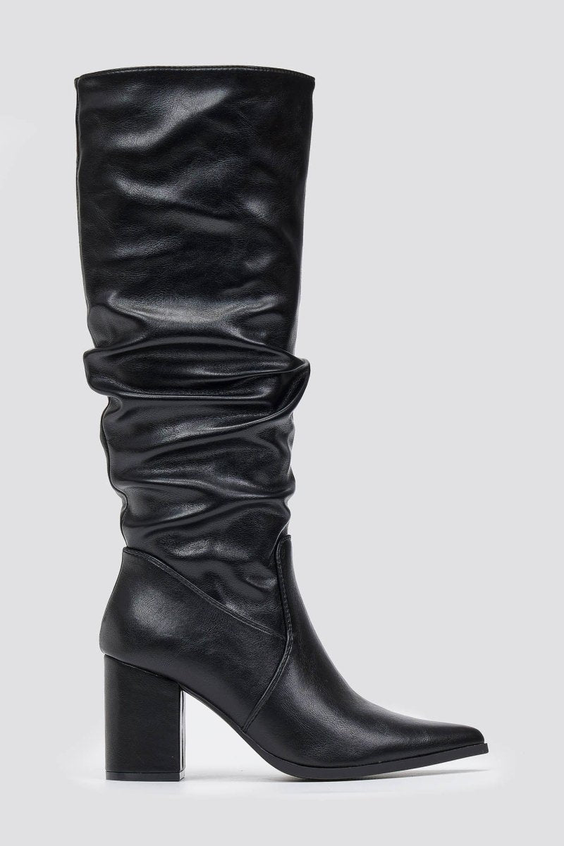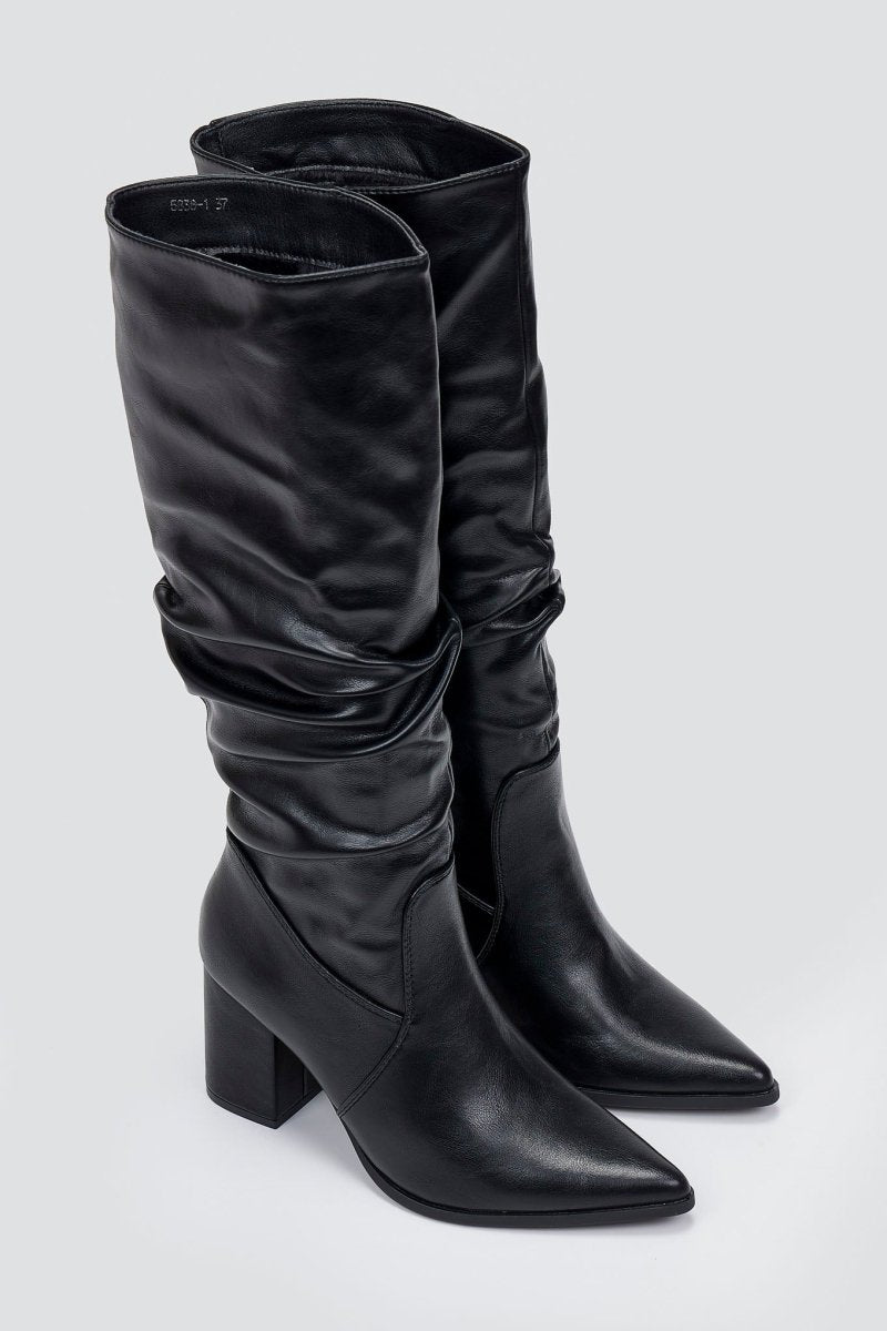 Μπότες με μυτερή μύτη, σούρα, τετράγωνο τακούνι και φερμουάρ στο πλάι. Εκλεπτυσμένη άνεση και ευέλικτη κομψότητα, σχεδιασμένες για σύγχρονο στυλ από το πρωί ως το βράδυ.