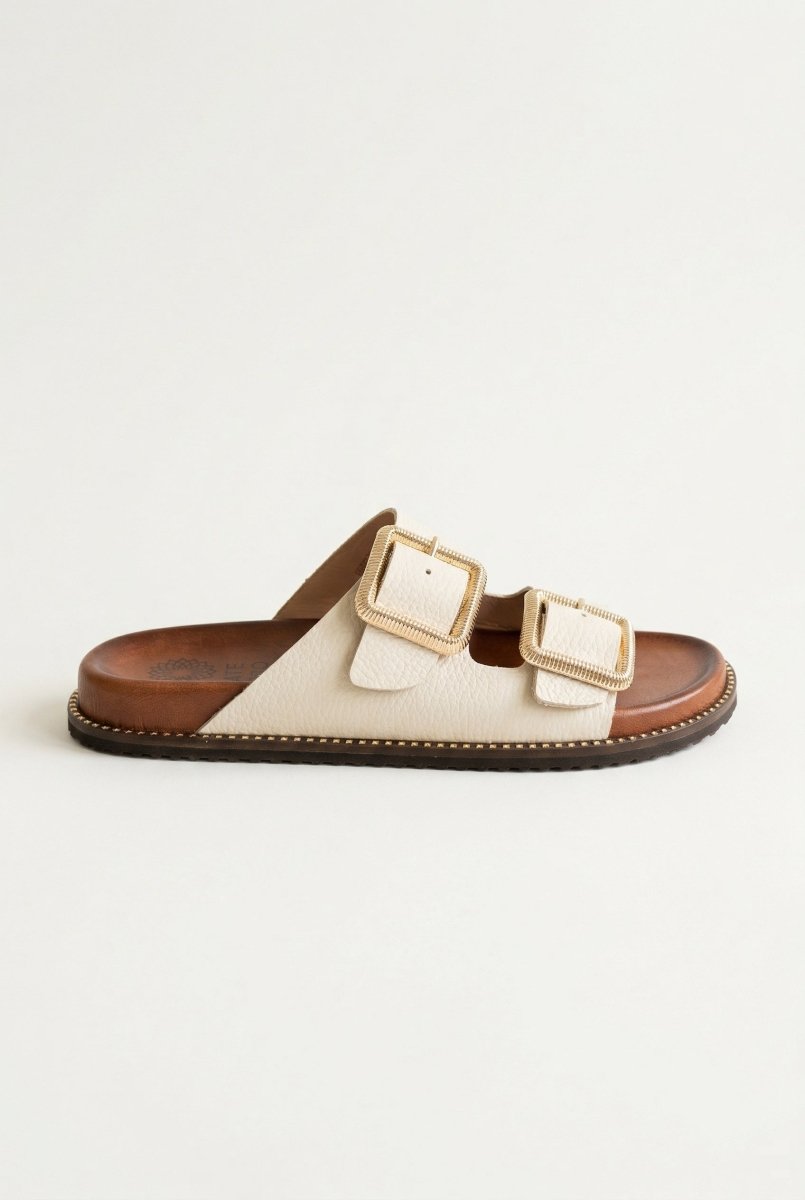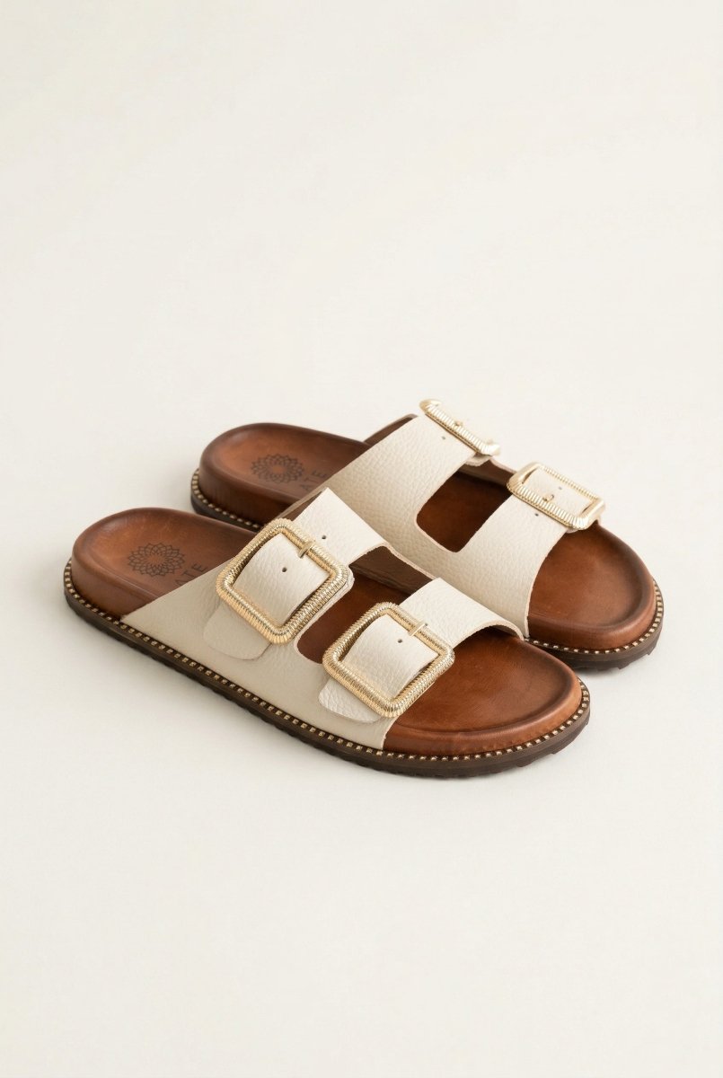 The ATENEO Buckle Sandals Lightweight Sole in Beige Matte combine timeless style with everyday comfort. Crafted from genuine leather, these sandals feature wide straps and secure metal buckles for adjustable fit. The lightweight flexible sole and cushioned leather footbed make them ideal for all-day wear, whether you're running errands or enjoying casual outings.