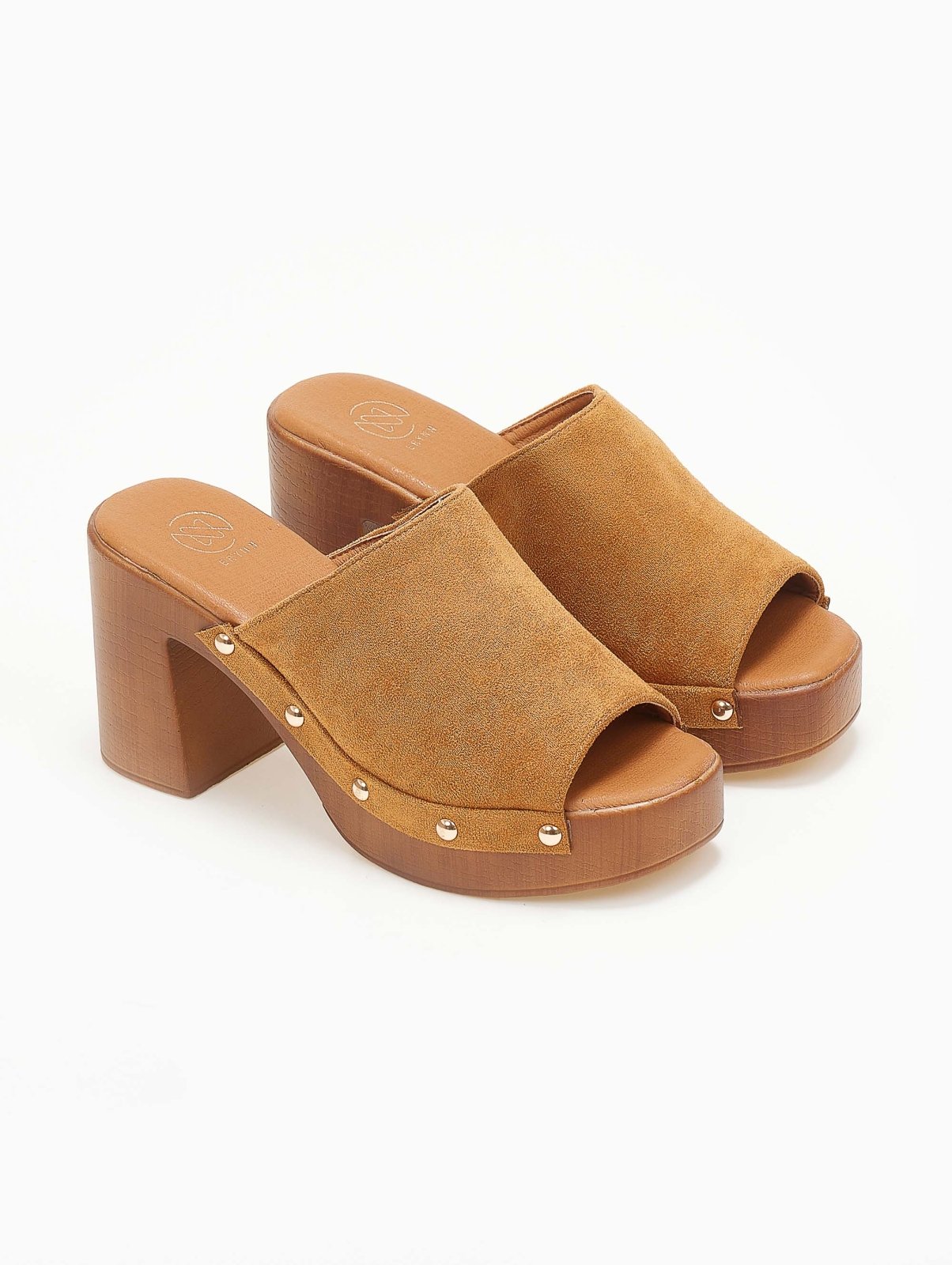 Clogs suede με φαρδιά φάσα Erynn. εφέ ξύλινη σόλα και τακούνι. Τρουκς σε μεταλλικό χρώμα. Μαλακός πάτος με ενίσχυση.
