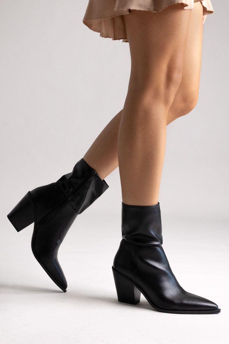 Κομψά μποτάκια cowboy από την Corina με μυτερή μύτη, ψηλό τετράγωνο τακούνι και φερμουάρ στο πλάι. Δυτική έμπνευση με κομψότητα και μαλακή αντικραδασμική σόλα για άνεση όλη μέρα.