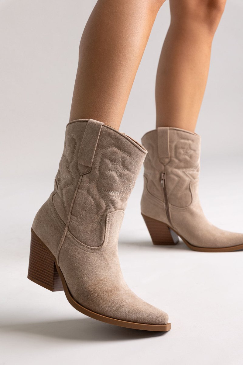 Μποτάκια cowboy με ψηλό χοντρό τακούνι και πλαϊνό φερμουάρ. Απαλή υφή suede, κομψή σιλουέτα και άνεση όλη μέρα, σχεδιασμένα για μοντέρνο στυλ.