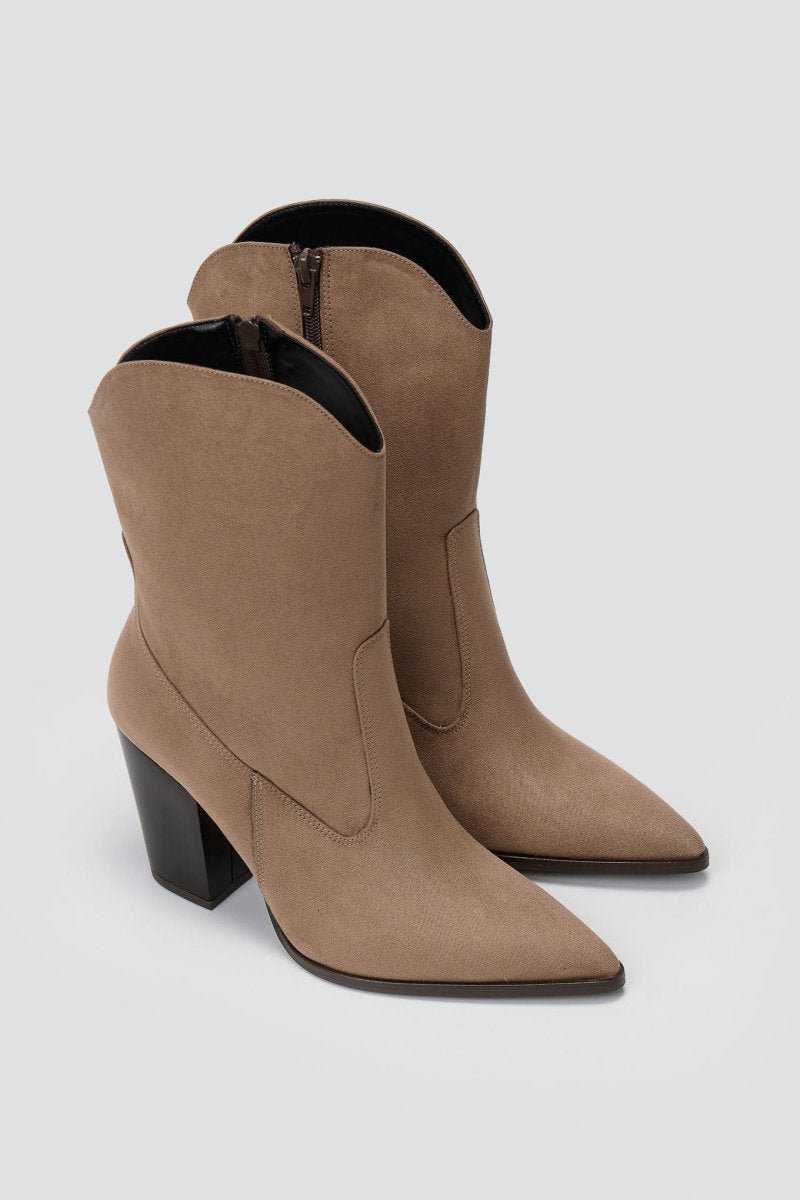 Σουέτ μποτάκια cowboy-style με μυτερή μύτη, ψηλό χοντρό τακούνι και φερμουάρ στο πλάι. Ένα τολμηρό σχέδιο με western επιρροές που συνδυάζει μοντέρνο στυλ με άνεση και σταθερότητα.