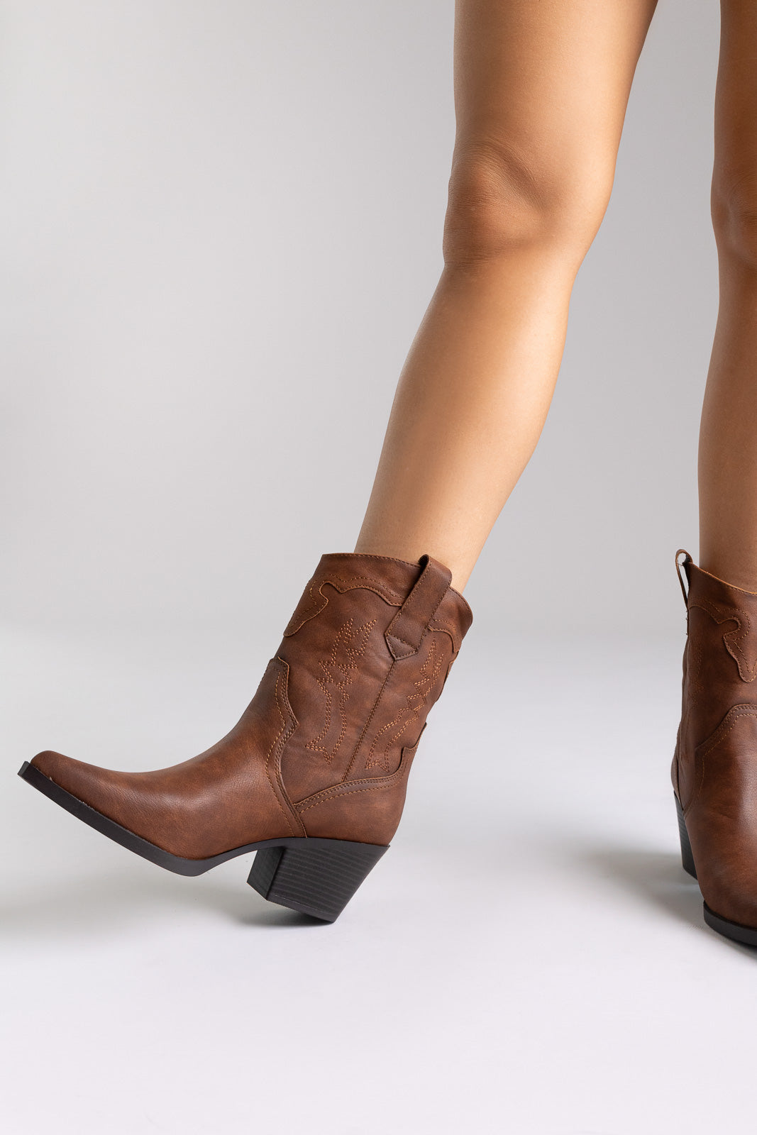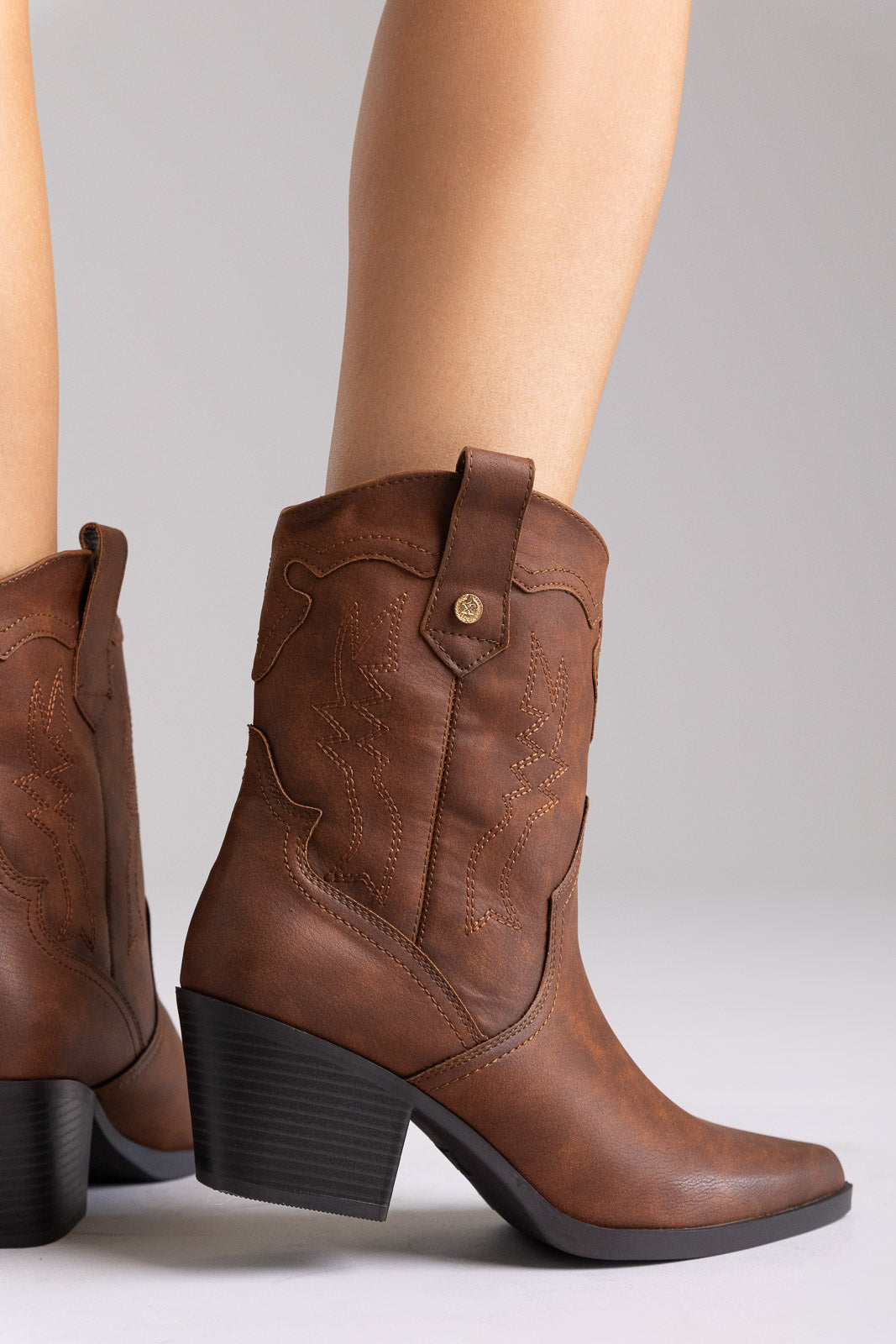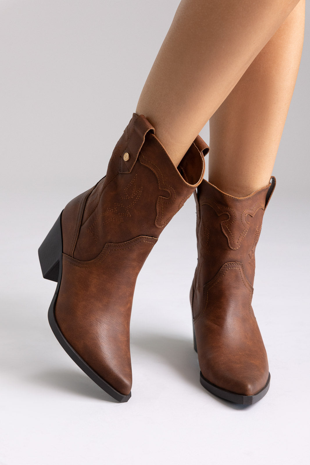 Μποτάκια Western με μυτερή μύτη, ραφές διακόσμησης και τετράγωνο τακούνι. Τεχνολογία άνεσης με memory foam και σχεδιασμός PETA-Approved Vegan για άνεση όλη μέρα.