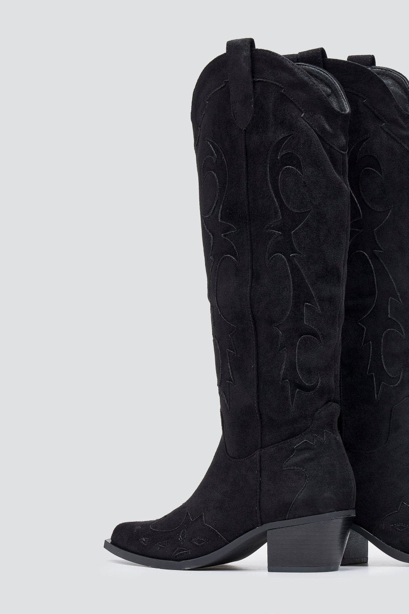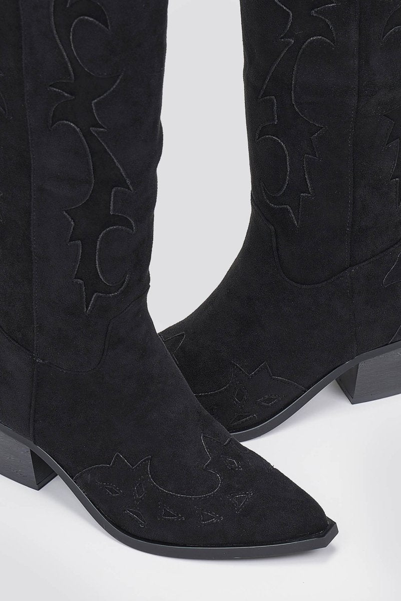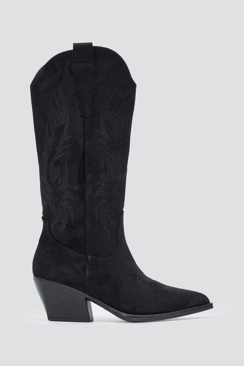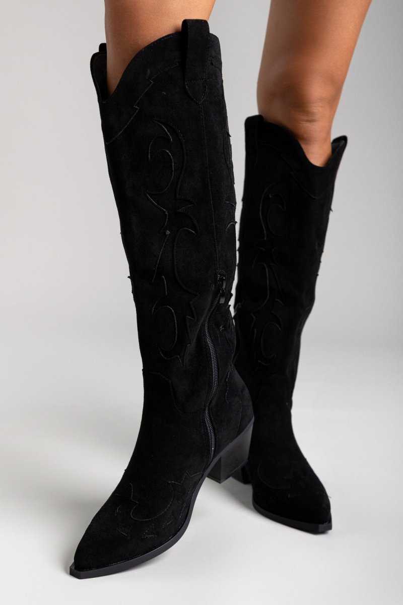 Σουέτ μπότες cowboy με μυτερή μύτη, πλαϊνό φερμουάρ και χαμηλό τετράγωνο τακούνι. Western σιλουέτα, μαλακή άνεση, σχεδιασμένες για μοντέρνο στυλ και όλη μέρα χρήση.