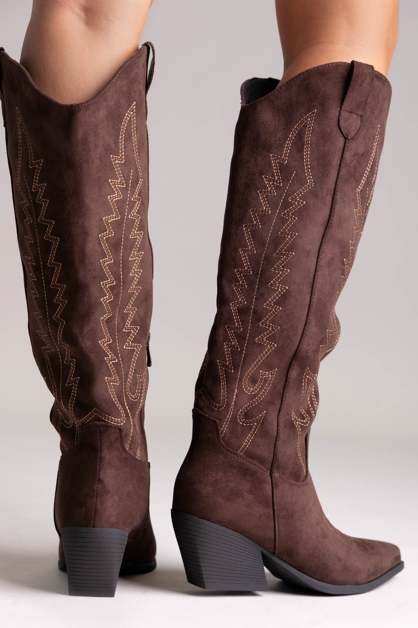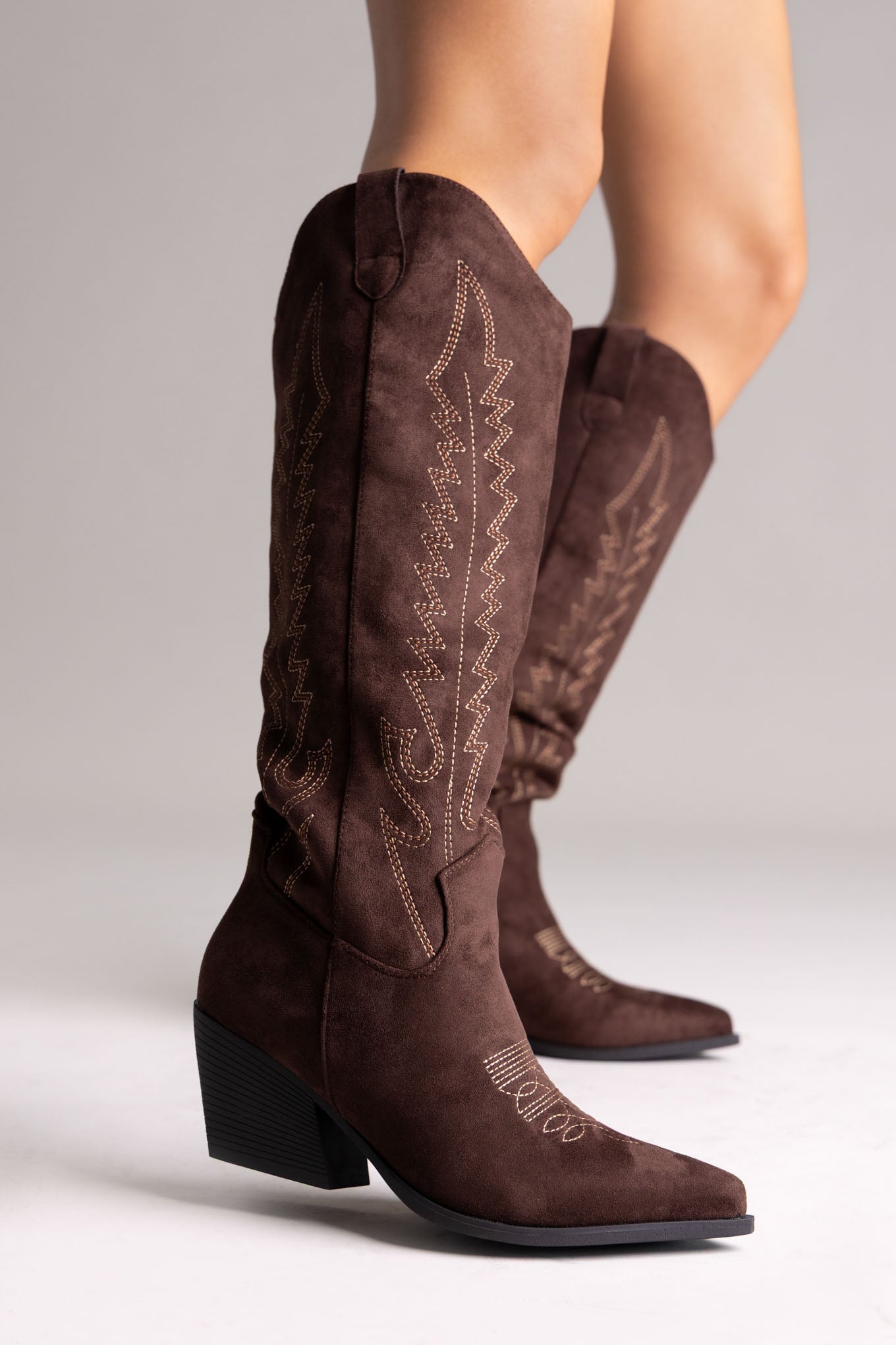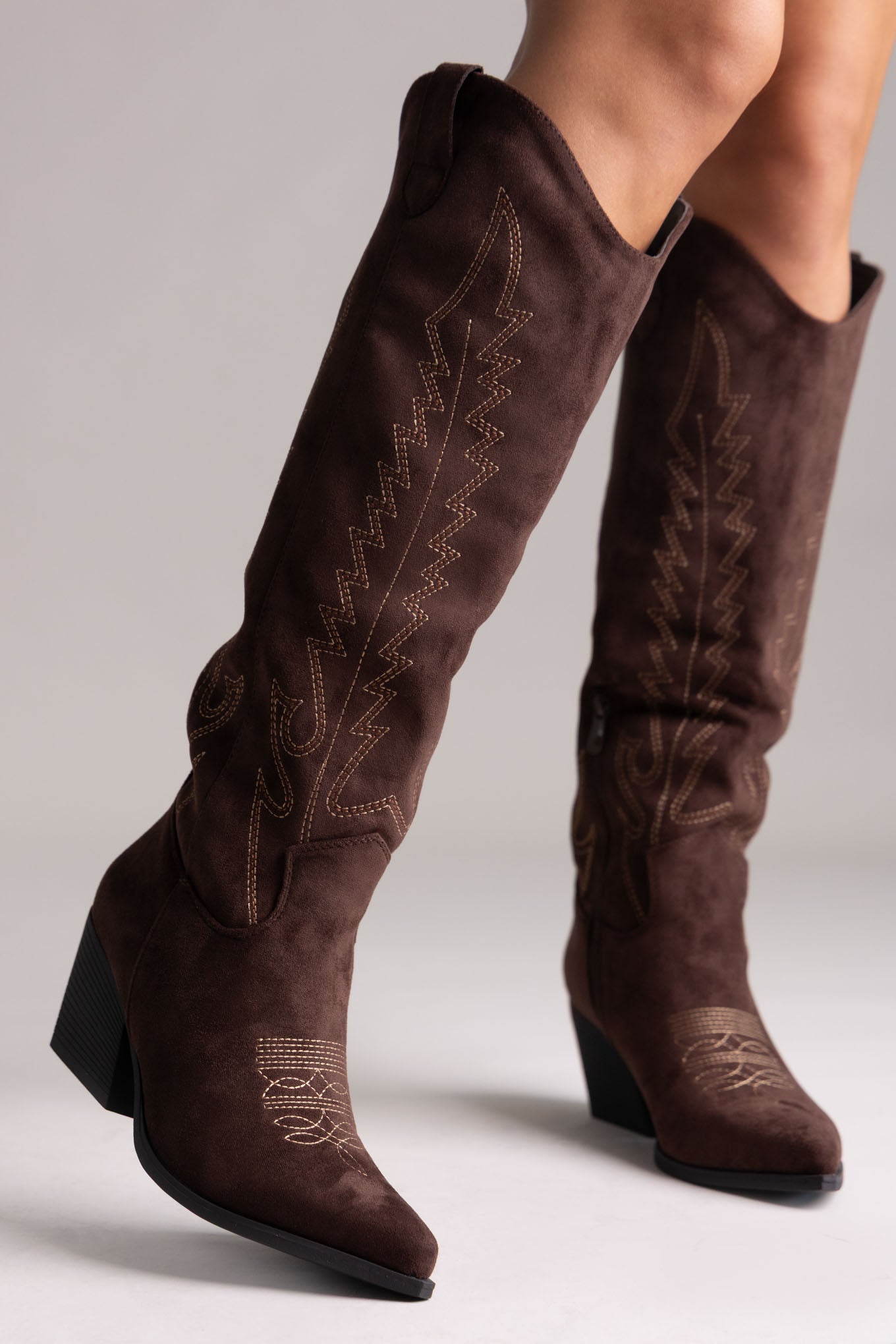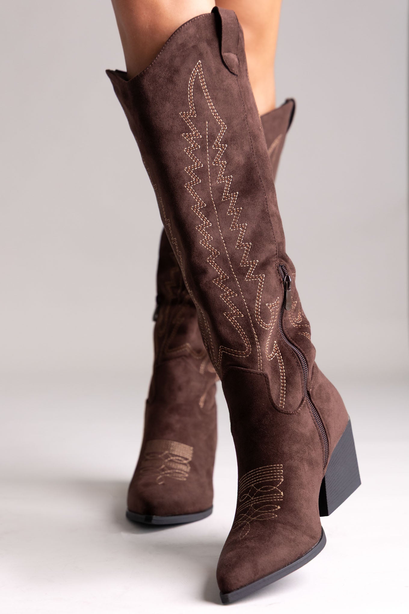 Σουέτ μπότες cowboy με τακούνι block και ξύλινη όψη, μυτερή μύτη και πλαϊνό φερμουάρ. Εκλεπτυσμένο western στυλ με ισορροπημένη άνεση, ιδανικό για κάθε περίσταση.