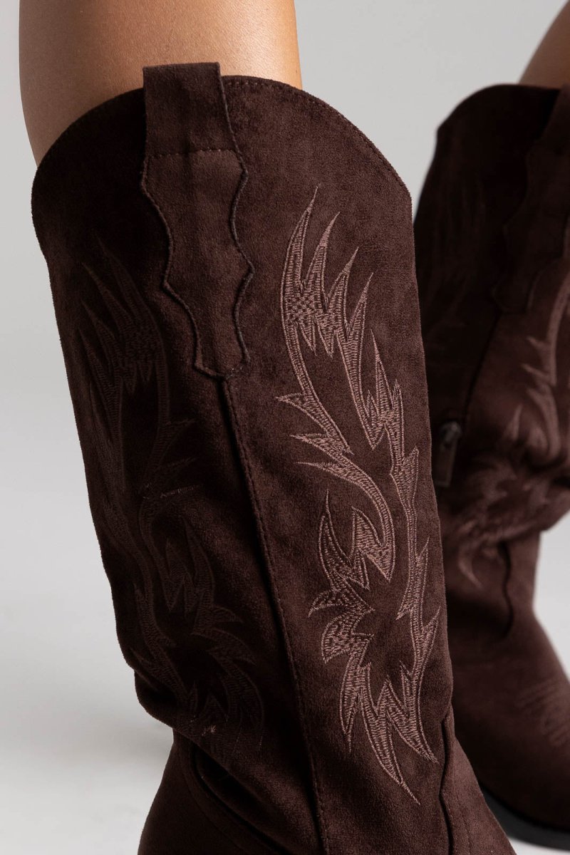Σουέτ καουμπόικες μπότες με μυτερή μύτη, χαμηλό τετράγωνο τακούνι και πλαϊνό φερμουάρ. Δυτική κομψότητα, μαλακή άνεση—πολυμορφικές και κομψές από το πρωί μέχρι το βράδυ.