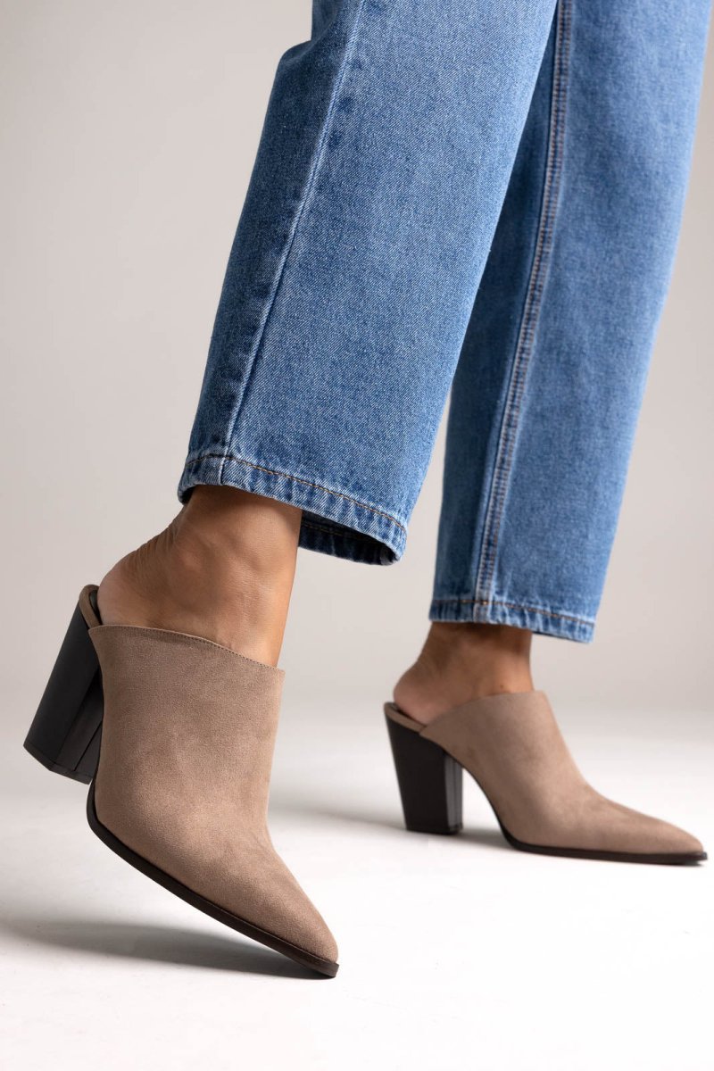 Σουέντ clogs cowboy με μυτερή μύτη και ψηλό χοντρό τακούνι. Τολμηρό western στυλ με σταθερή ανύψωση, σχεδιασμένα για μοντέρνα εμφάνιση από το πρωί ως το βράδυ.