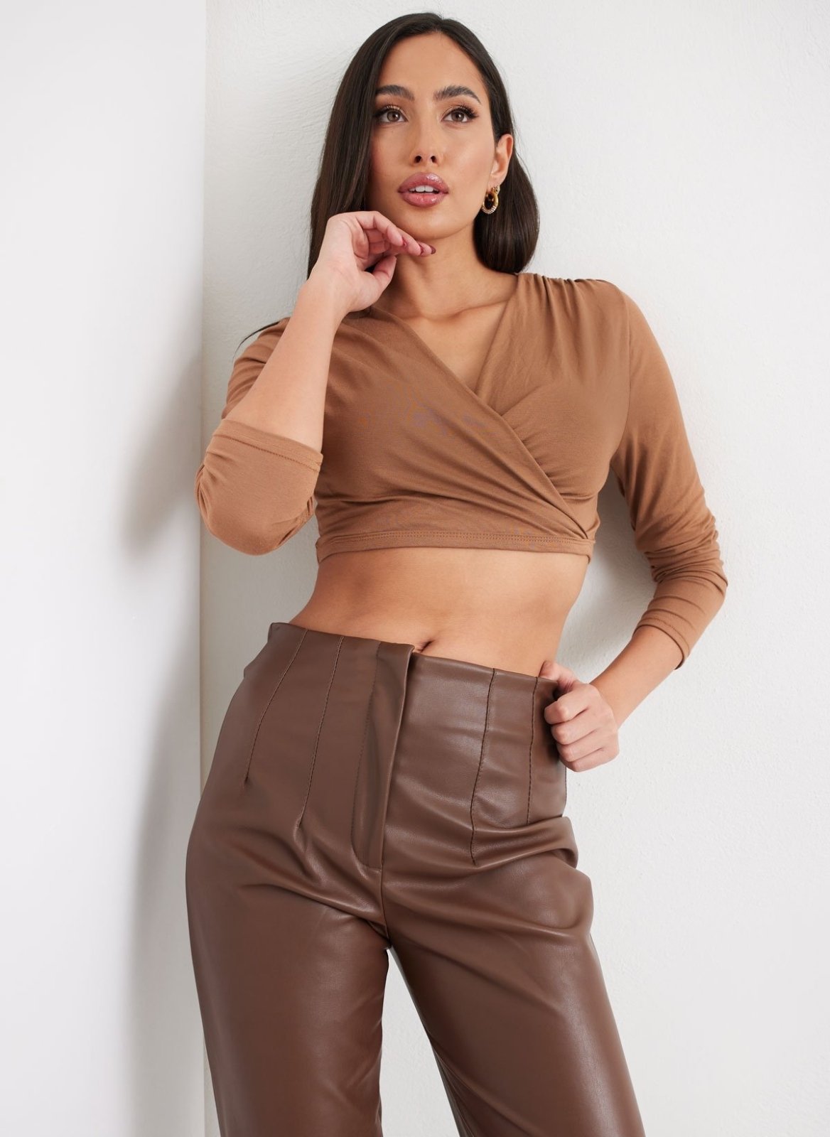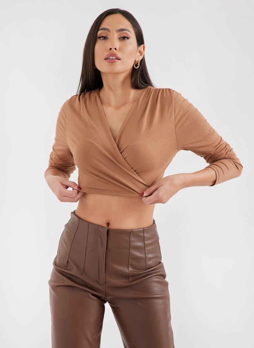 Cropped τοπάκι με v cut λαιμόκοψη. Κροαζέ μπούστο με σούρες. Εφαρμοστή γραμμή. Κατασκευασμένο στην Ευρώπη