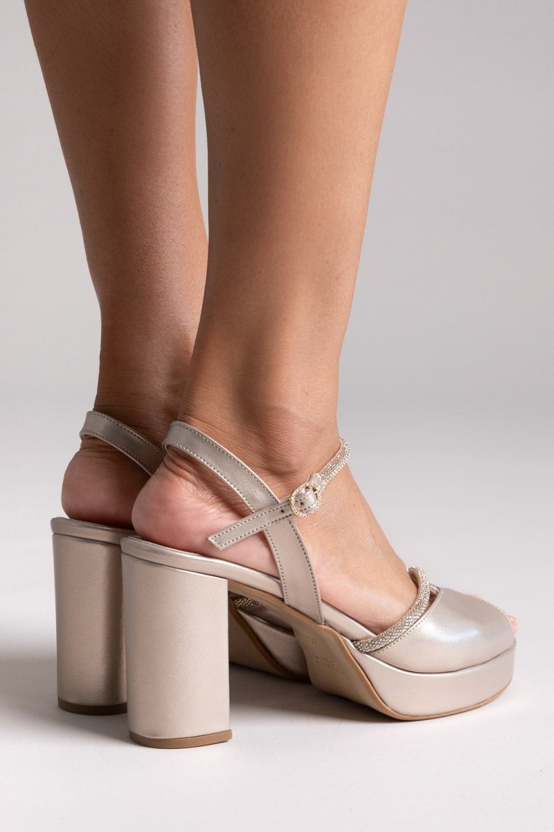 Πέδιλα πλατφόρμα με κρύσταλλα από την TFP με λουράκι στον αστράγαλο και ψηλό τετράγωνο τακούνι. Μαλακός πάτος, σταθερή εφαρμογή, εκλεπτυσμένη λάμψη. Κατασκευασμένα στην Ελλάδα—ιδανικά για βραδινές εμφανίσεις.
