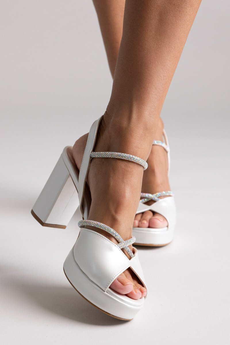 Πέδιλα πλατφόρμα με κρύσταλλα από την TFP με λουράκι στον αστράγαλο και ψηλό τετράγωνο τακούνι. Μαλακός πάτος, σταθερή εφαρμογή, εκλεπτυσμένη λάμψη. Κατασκευασμένα στην Ελλάδα—ιδανικά για βραδινές εμφανίσεις.