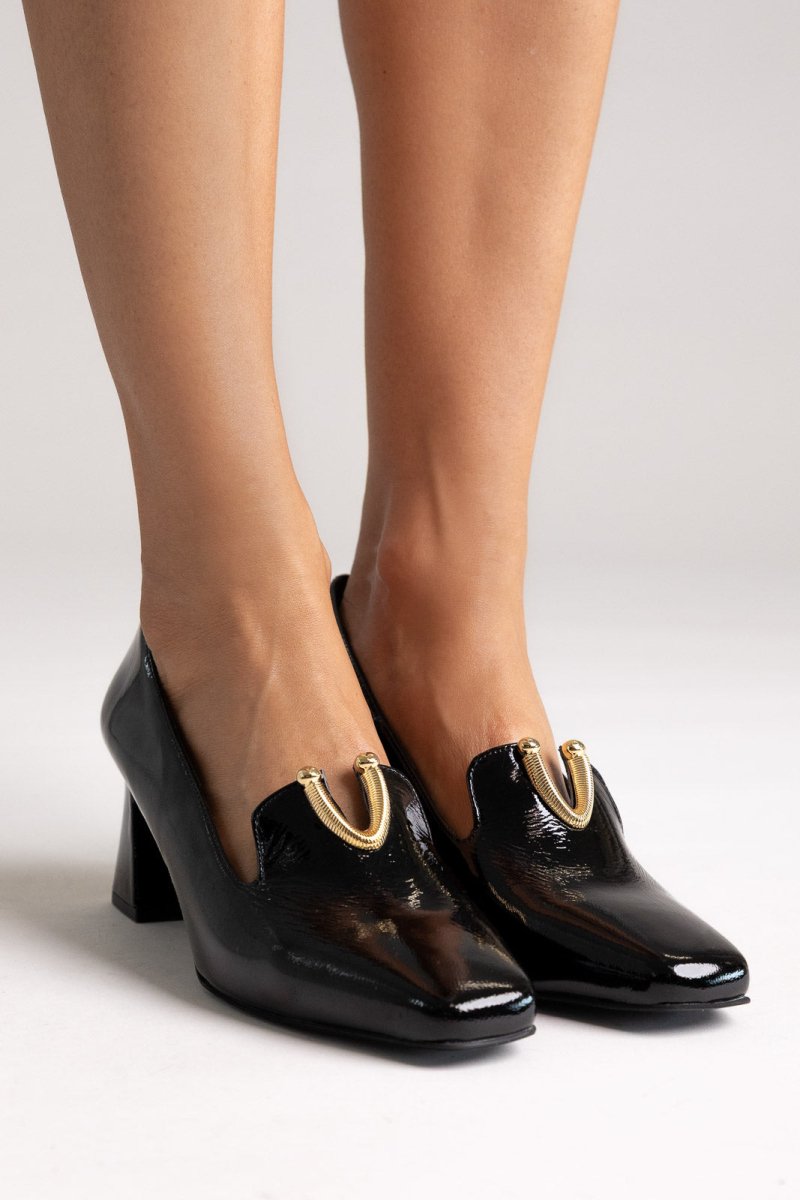 Γόβες από λουστρίνι δέρμα με χαμηλό τακούνι και κομψό V-cut σχέδιο που τονίζεται από μεταλλική λεπτομέρεια. Διαχρονική άνεση και εκλεπτυσμένη κομψότητα.
