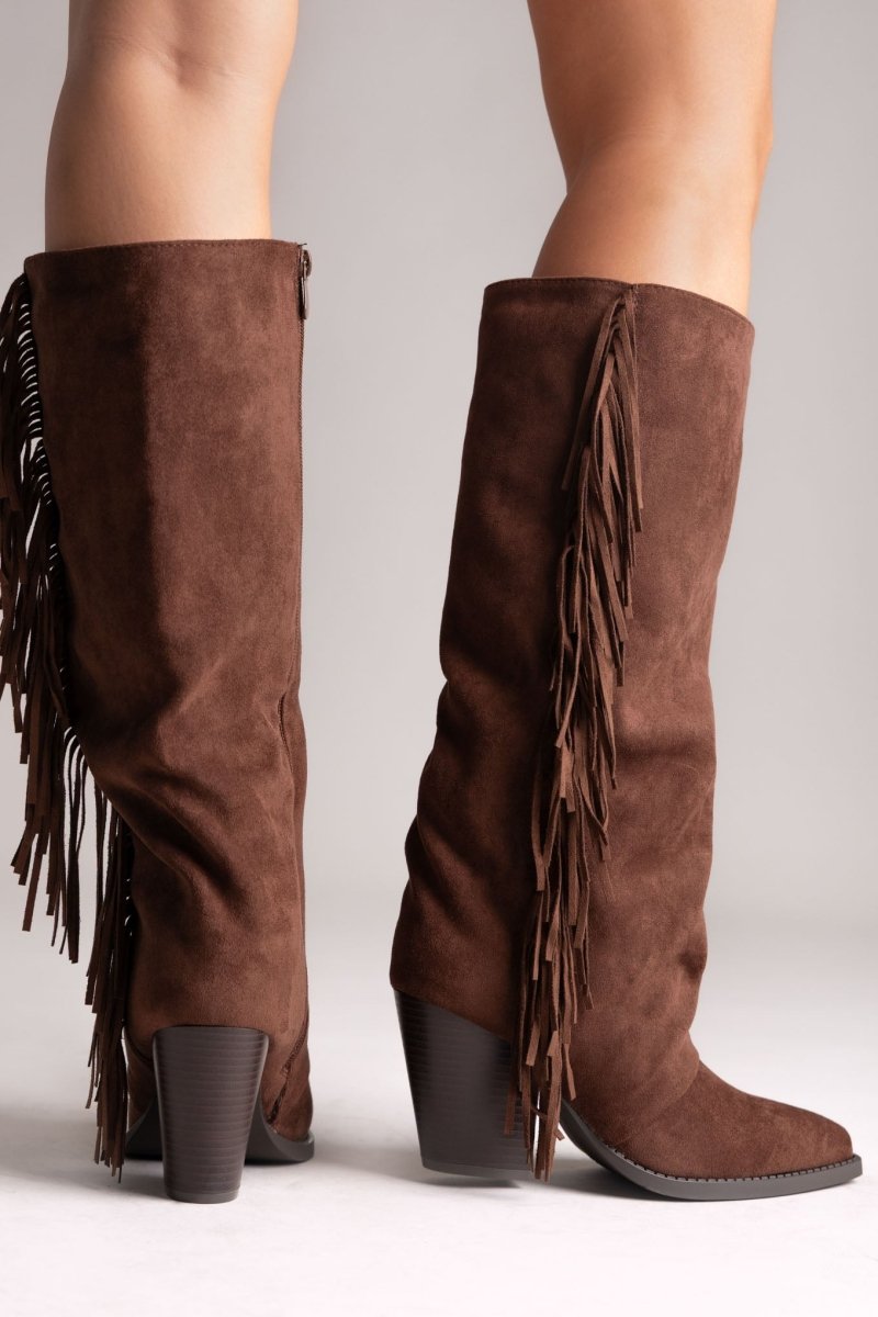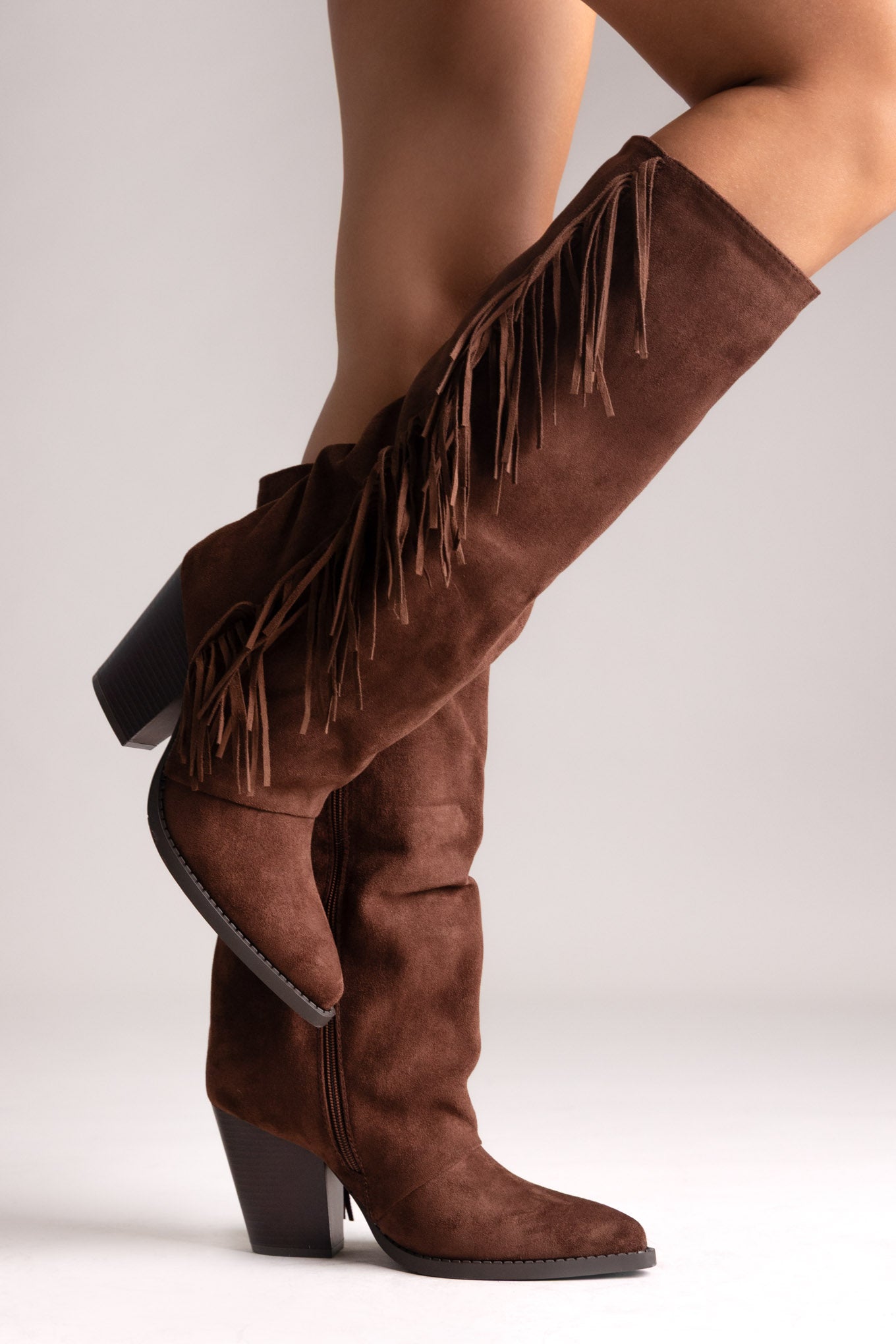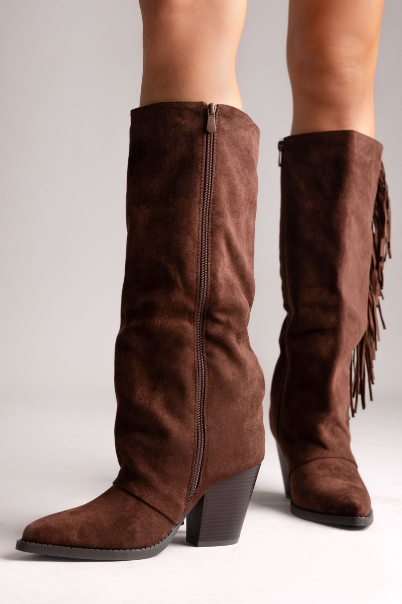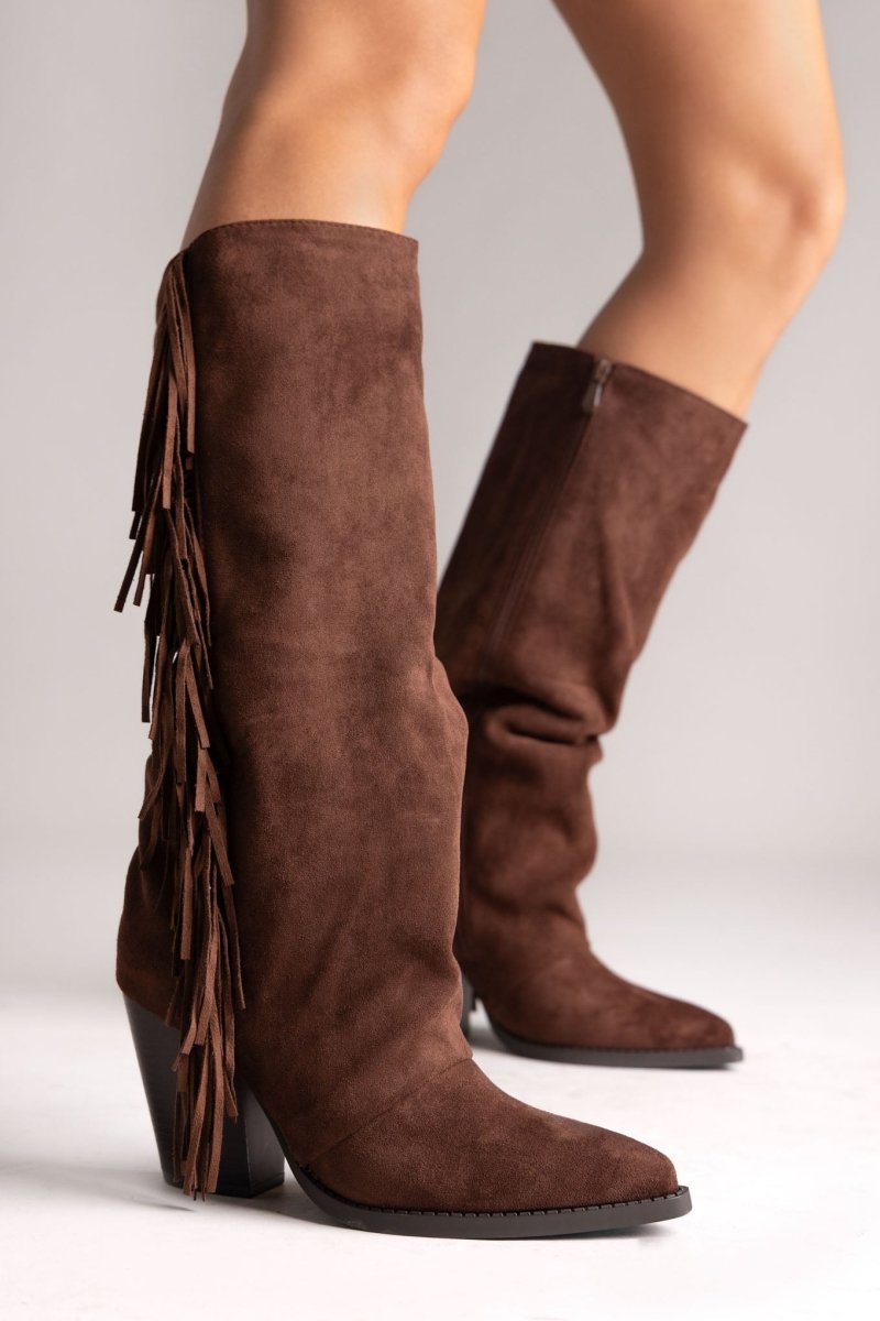 Σουέτ μπότες cowboy με μυτερή μύτη, κρόσσια στο πλάι και ψηλό τετράγωνο τακούνι. Τολμηρό western στυλ με κομψή άνεση.