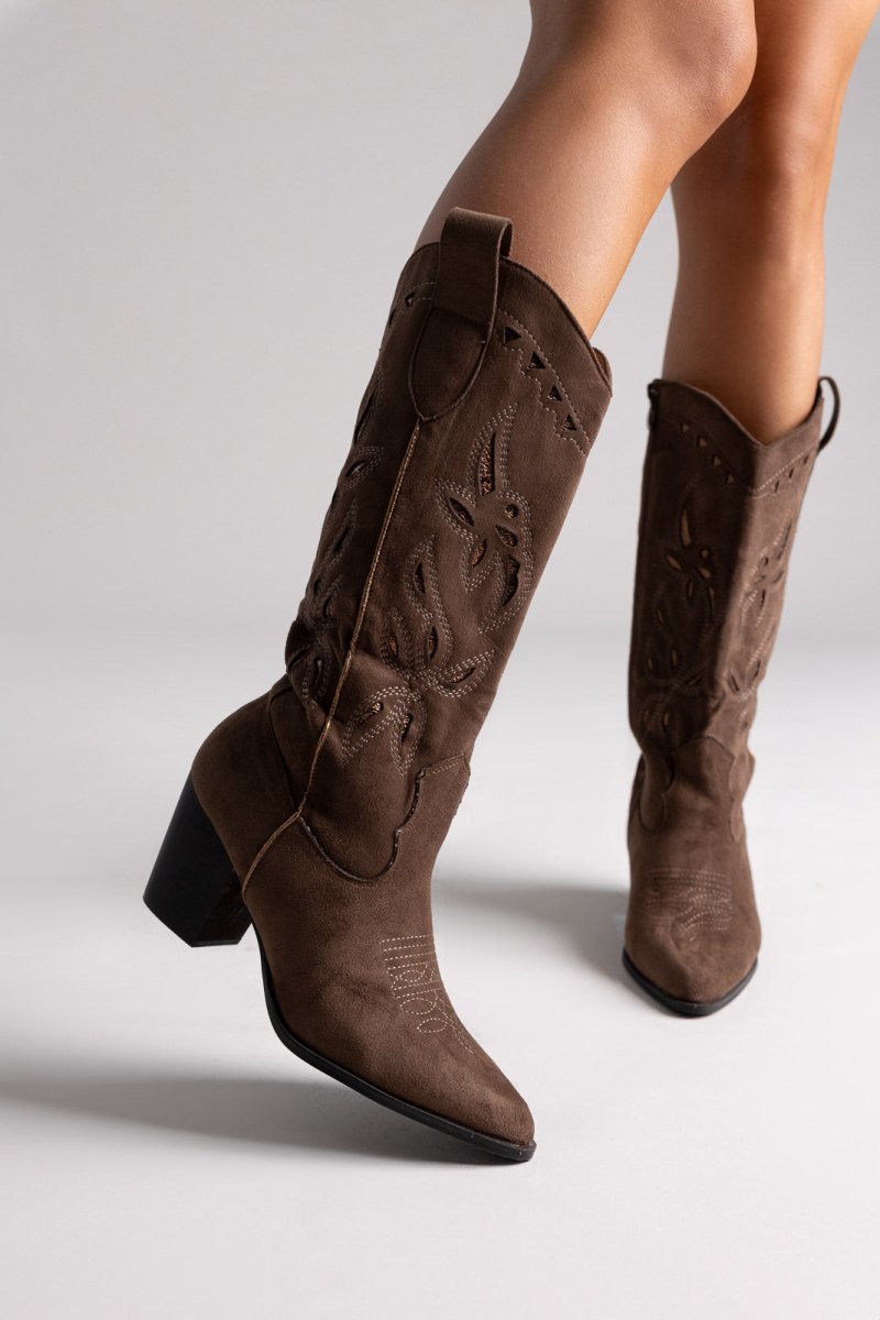 Καουμπόικες μπότες από σουέτ με μυτερή μύτη και τετράγωνο τακούνι. Κλείσιμο με φερμουάρ στο πλάι και εκλεπτυσμένο design, σχεδιασμένες για τη σύγχρονη γυναίκα με τολμηρή κομψότητα.