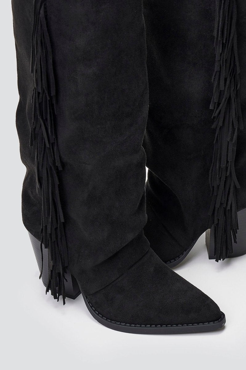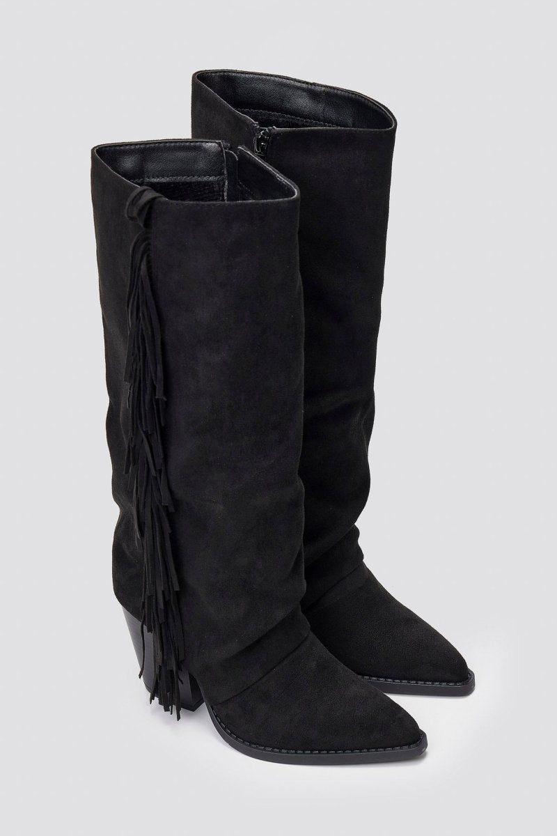 Σουέτ μπότες cowboy με μυτερή μύτη, κρόσσια στο πλάι και ψηλό τετράγωνο τακούνι. Τολμηρό western-inspired στυλ σχεδιασμένο με κομψή άνεση.
