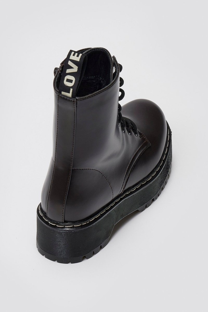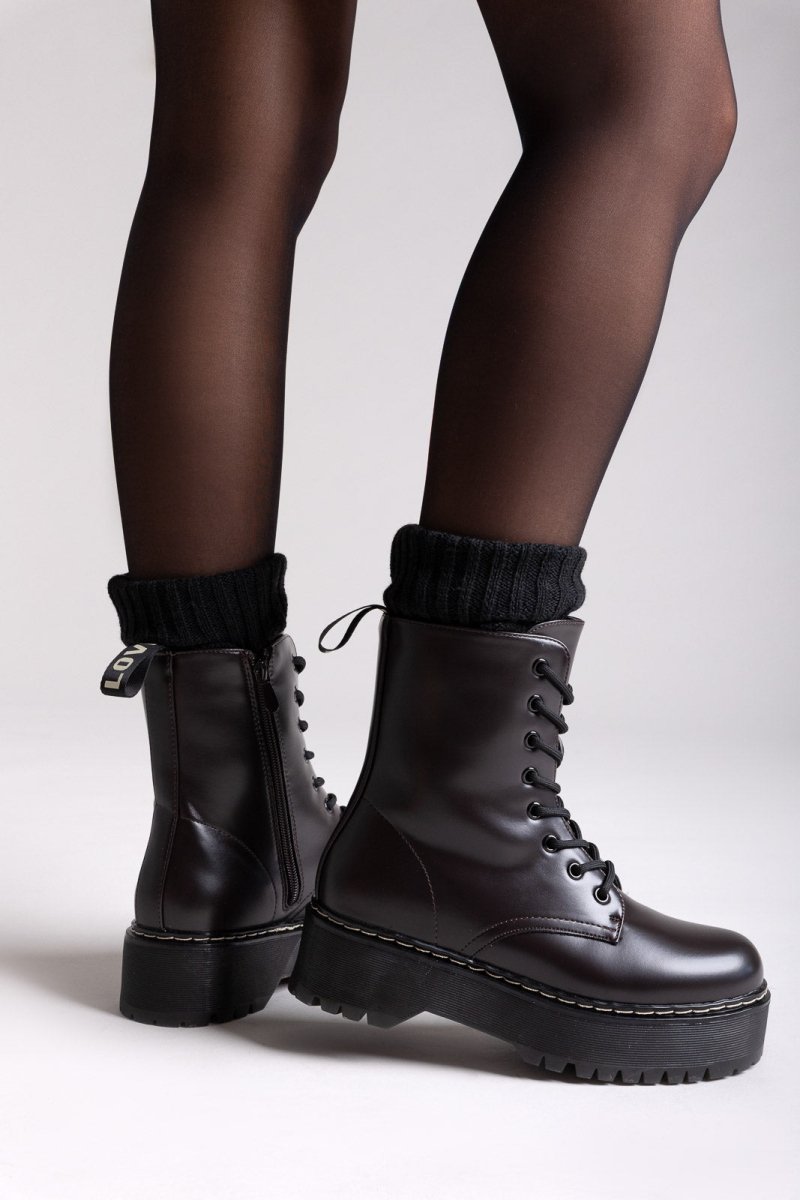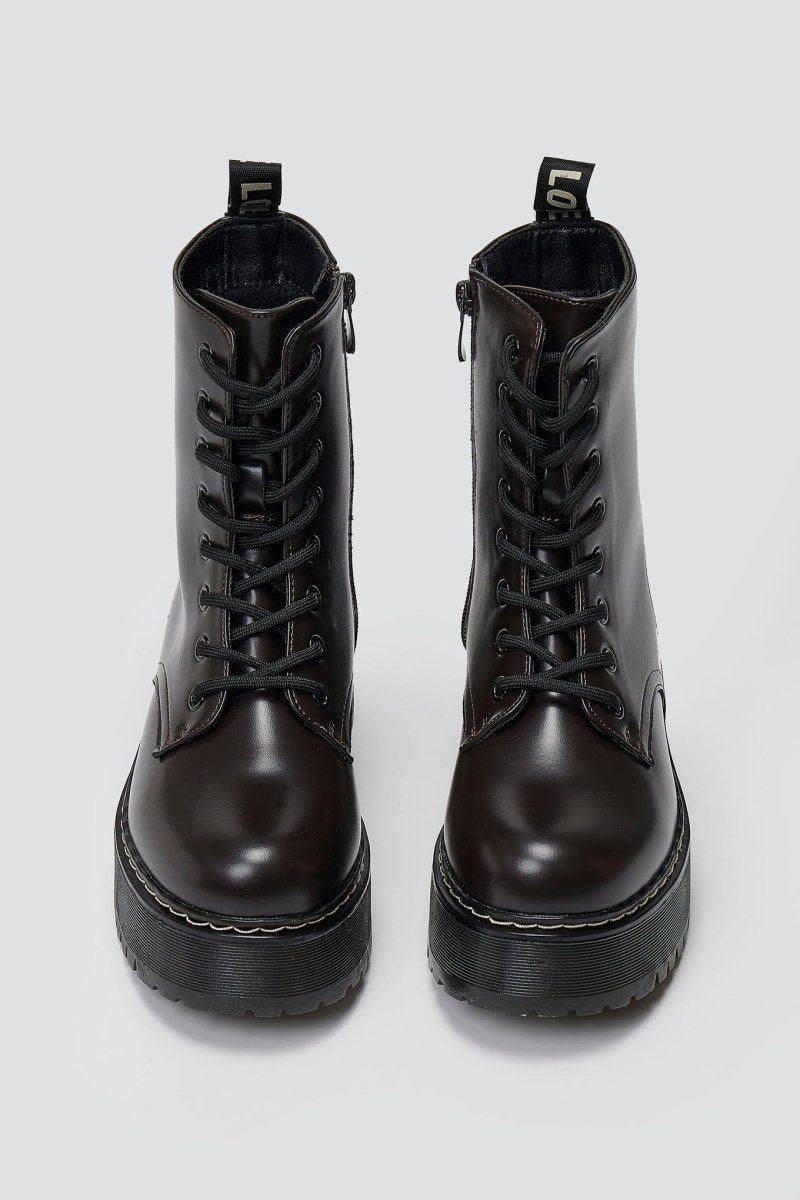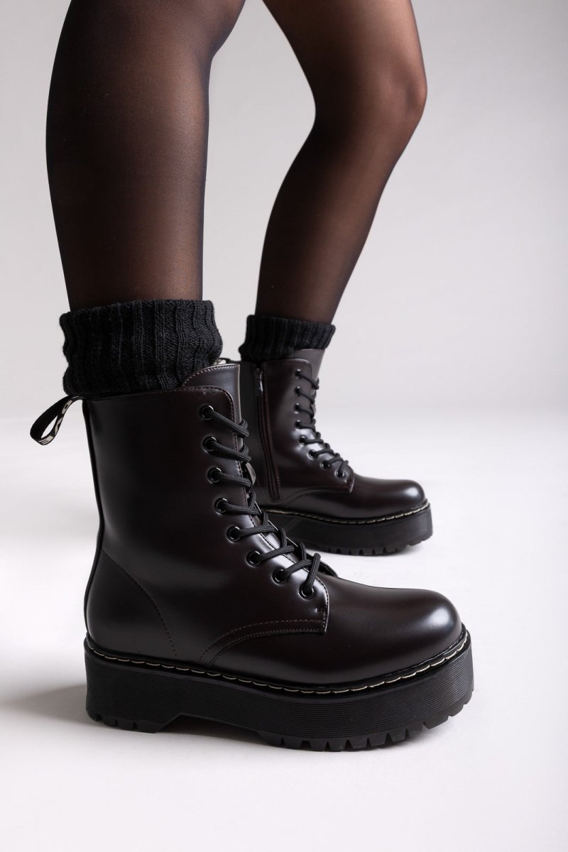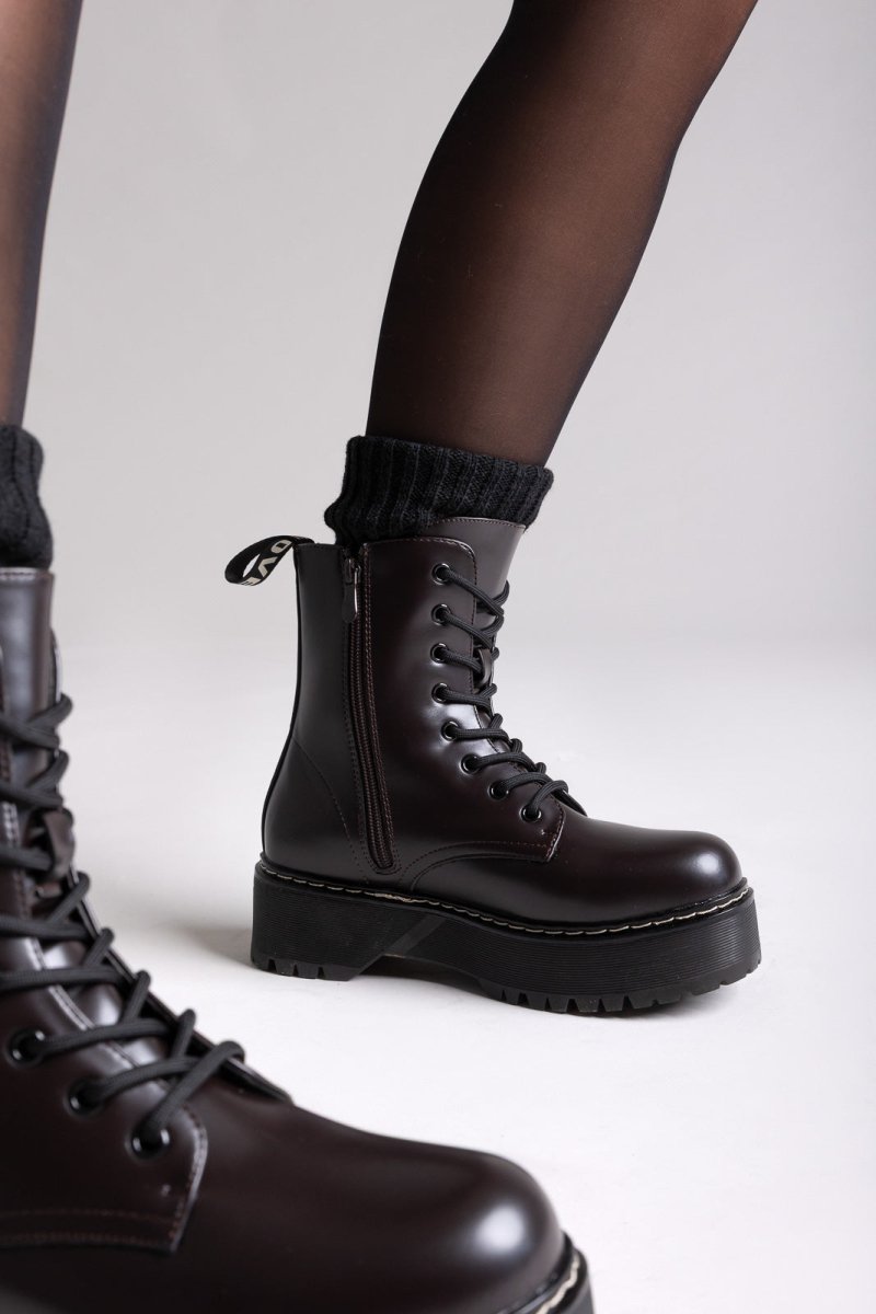 Μποτάκια ERYNN τύπου combat με ψηλή χοντρή σόλα, κορδόνια μπροστά και φερμουάρ στο πλάι. Τολμηρός σχεδιασμός που συνδυάζει δυναμικό στυλ με άνεση.