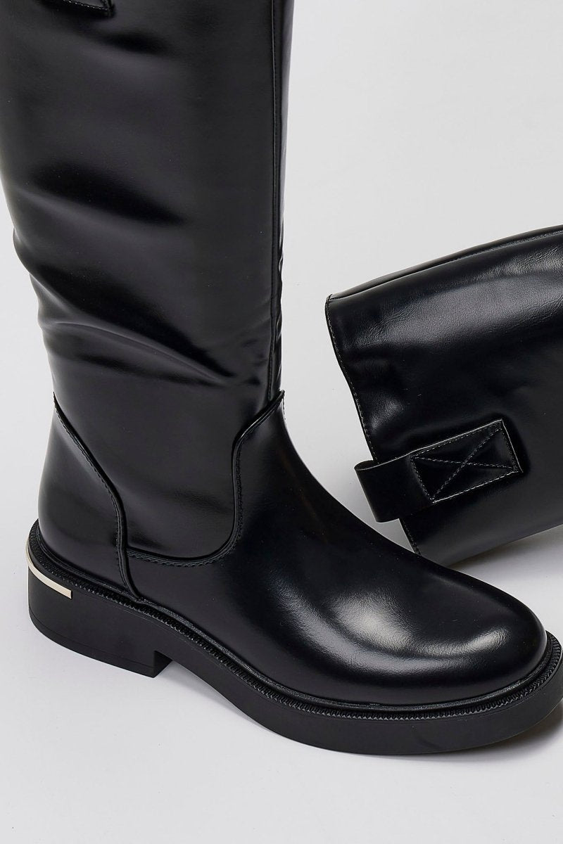 Εκλεπτυσμένες μπότες ιππασίας με στρογγυλή μύτη και μεταλλική λεπτομέρεια στο τακούνι. Κομψό design με φερμουάρ στο πλάι, σχεδιασμένες για γυναίκες με εκλεπτυσμένο στυλ.