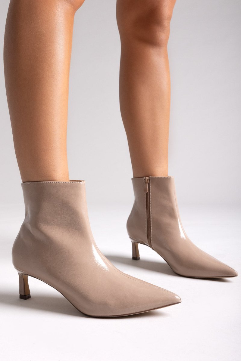 Μυτερά μποτάκια ERYNN με γυαλιστερό λουστρίνι, λεπτό χαμηλό τακούνι και πλαϊνό φερμουάρ. Κομψός σχεδιασμός με μοντέρνα γυαλιστερή πινελιά