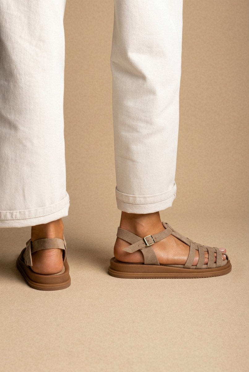 The Estil Fisherman Sandals in Taupe Suede combine timeless style with everyday comfort. Crafted from genuine suede leather, these women's sandals feature a classic fisherman design with a secure side buckle closure. The soft cushioned suede footbed provides supportive comfort for all-day wear, making them an ideal choice for modern women seeking refined, versatile footwear.