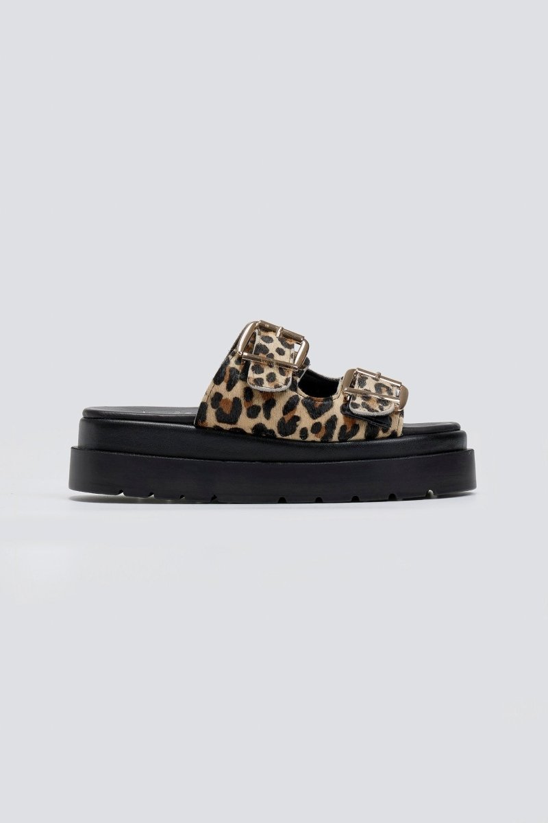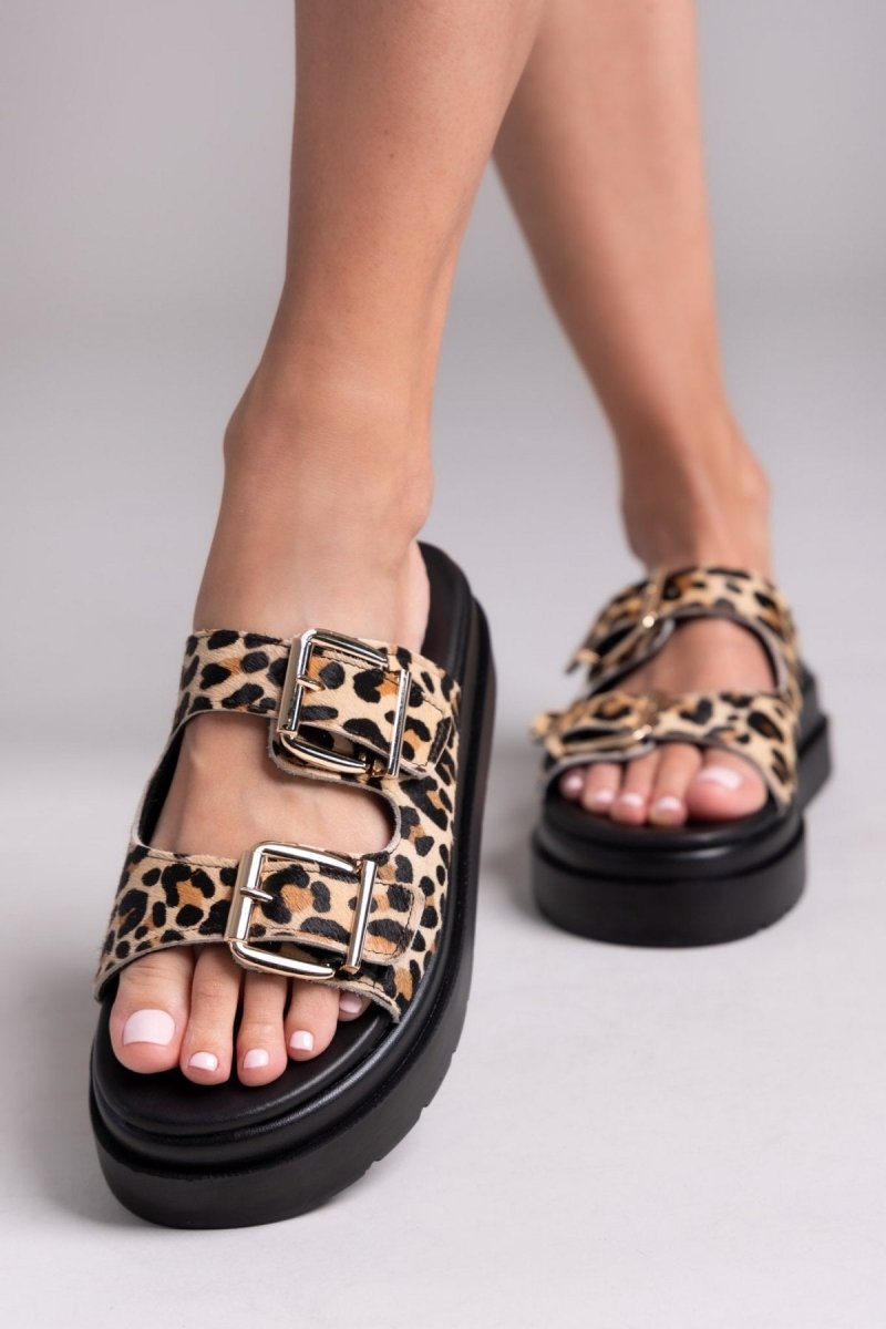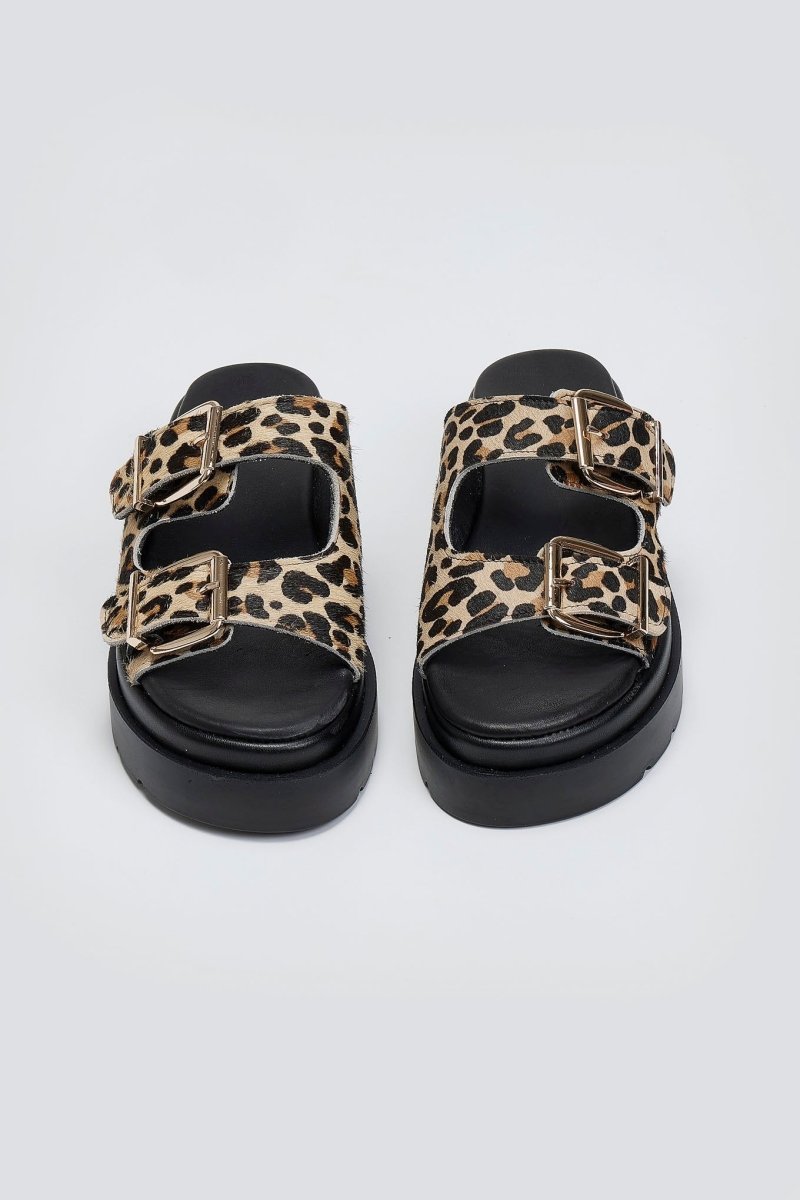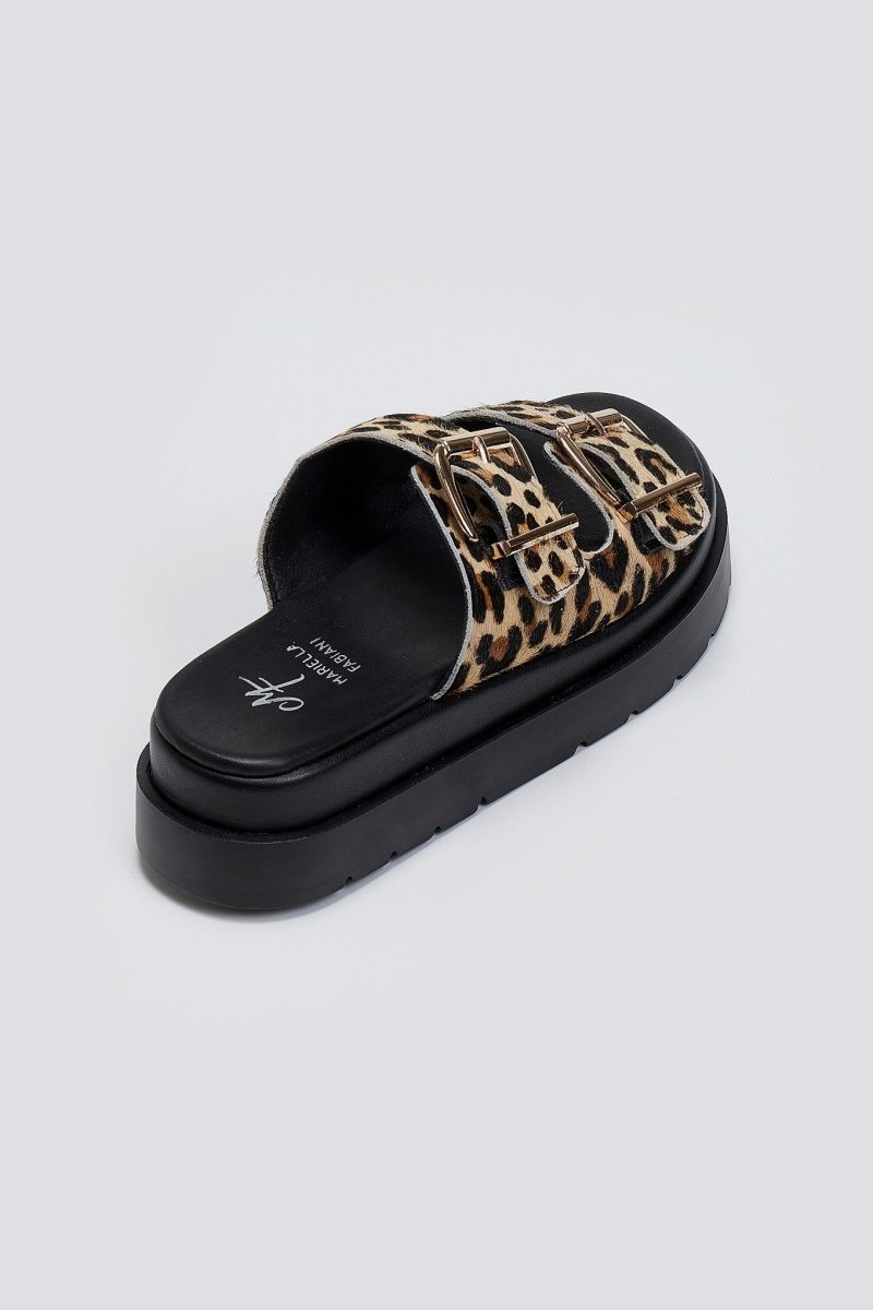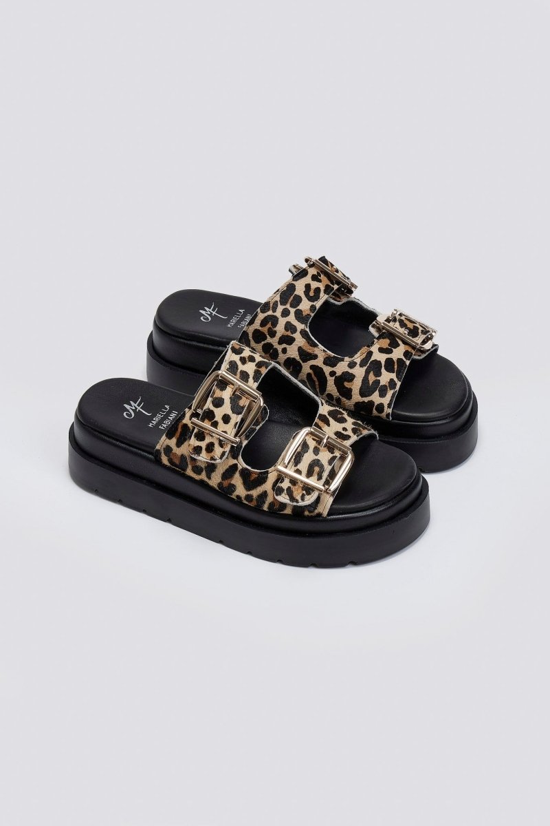 Σανδάλια flatforms Mariella Fabiani. Φάσες από ponyskin με animal print. Προσαρμόζονται με μεταλλικούς τοκάδες. Μαλακός πάτος με ενίσχυση.