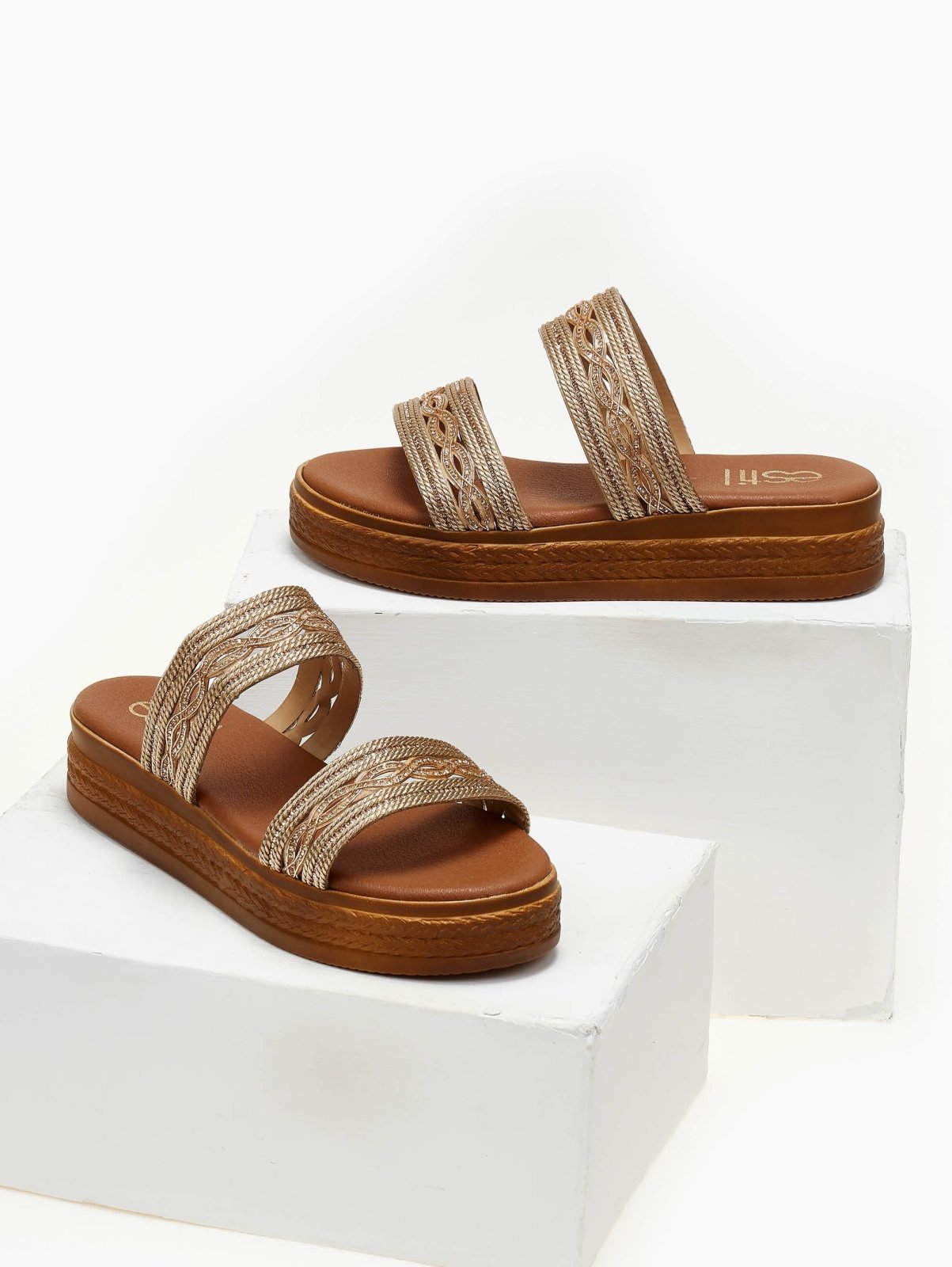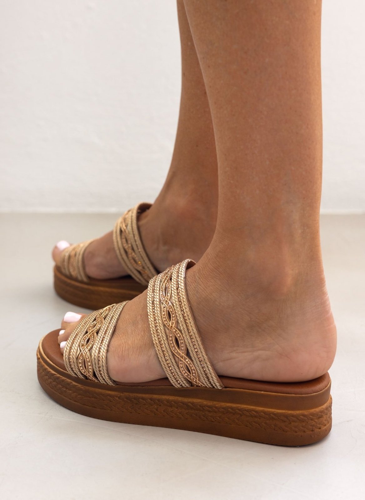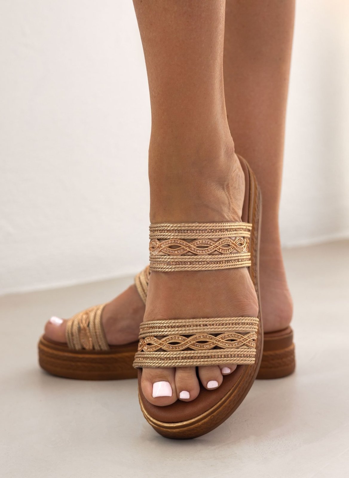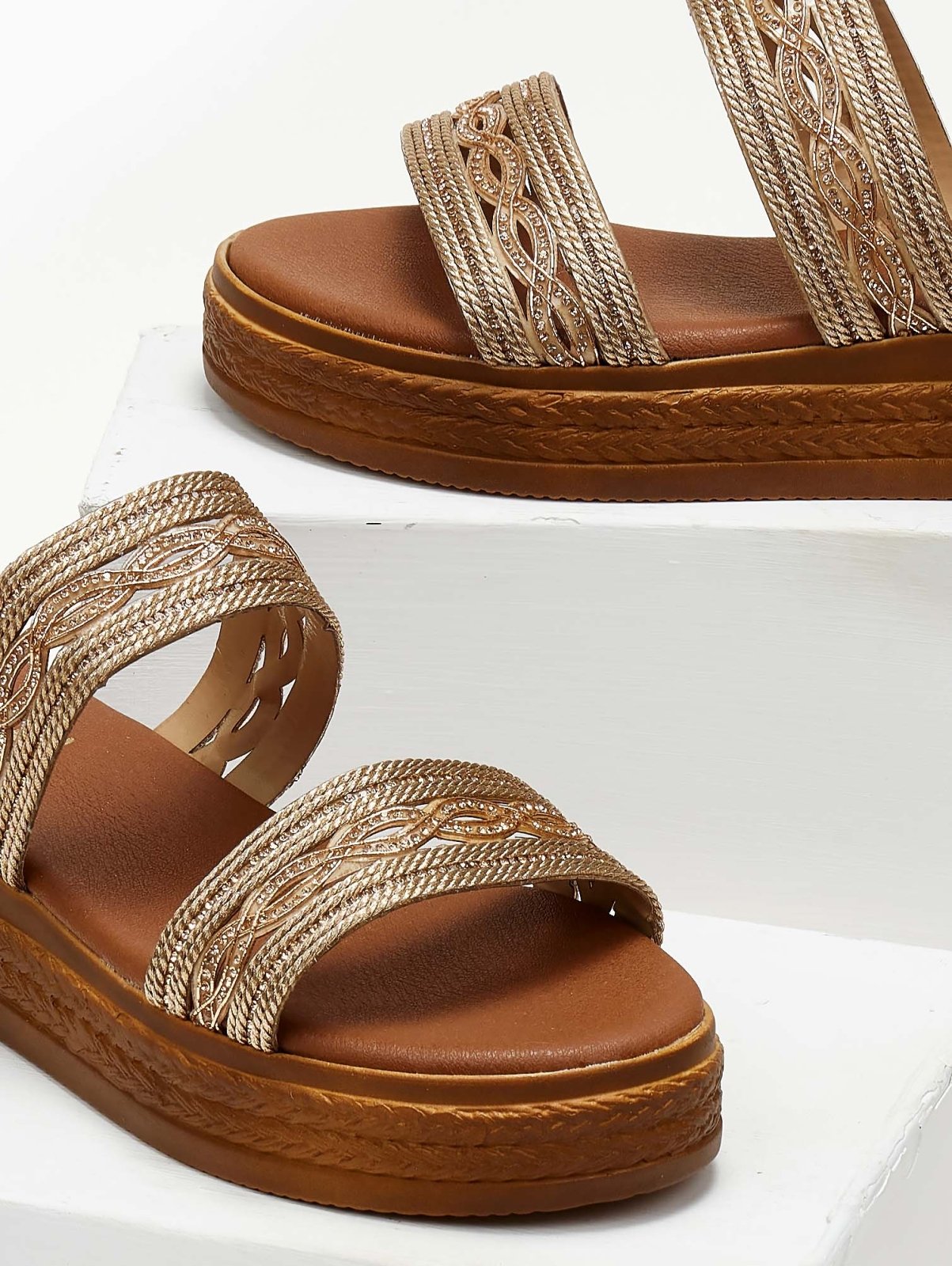 Σανδάλια flatforms με σχέδιο με σχοινί στις φάσες. Διακριτικά στρας. Μαλακός πάτος με ενίσχυση. Ελληνικής κατασκευής.