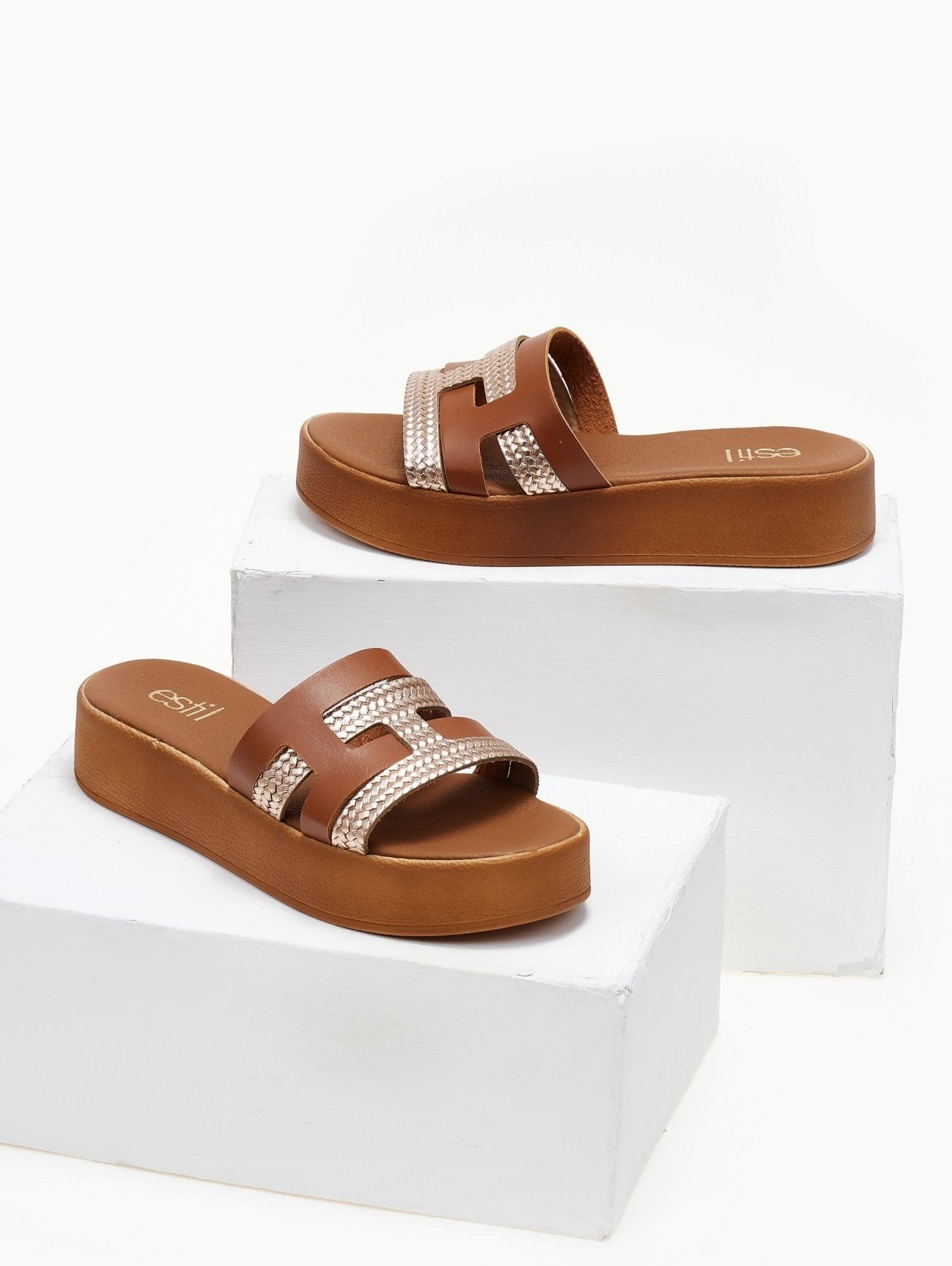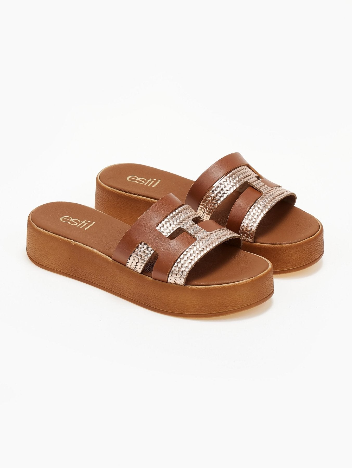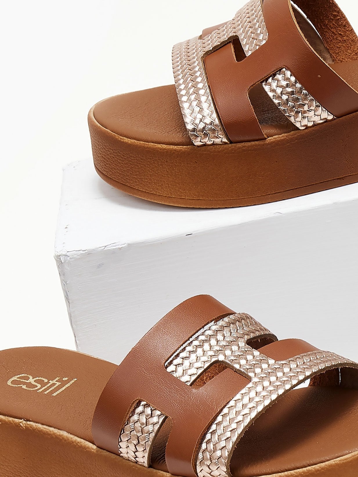 Flatforms σανδάλια Estil. Έχουν περαστά λουράκια με ανοίγματα στο πλάι με ανάγλυφο pattern ψάθα. Μαλακός πάτος με ενίσχυση. Ελληνικής κατασκευής, χειροποίητα.