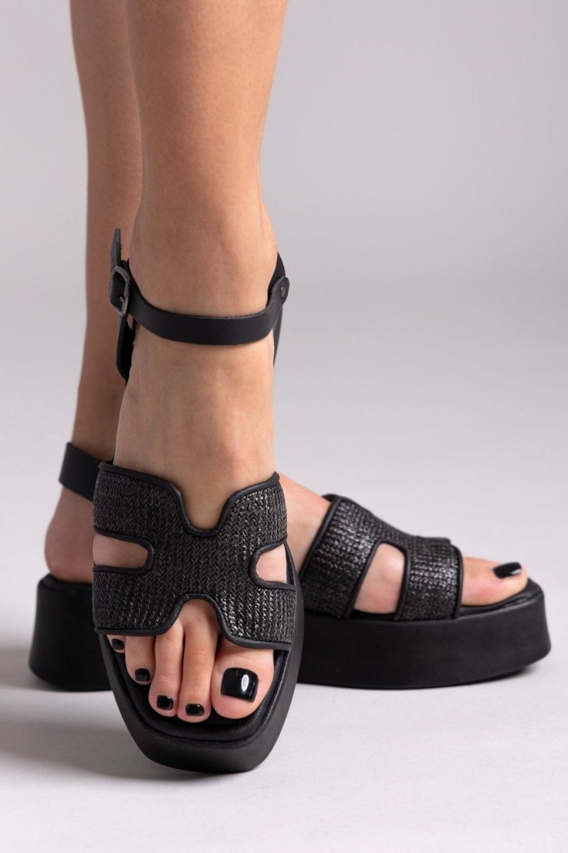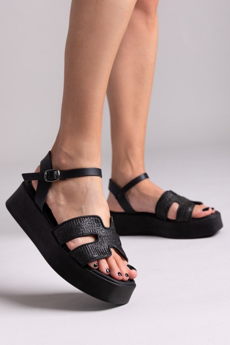 Flatforms σανδάλια με ψάθινη φάσα με ανοίγματα. Δένουν με μπαρέτα στο ύψος του αστραγάλου. Μαλακός πάτος με ενίσχυση. Ελληνικής κατασκευής.